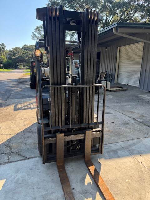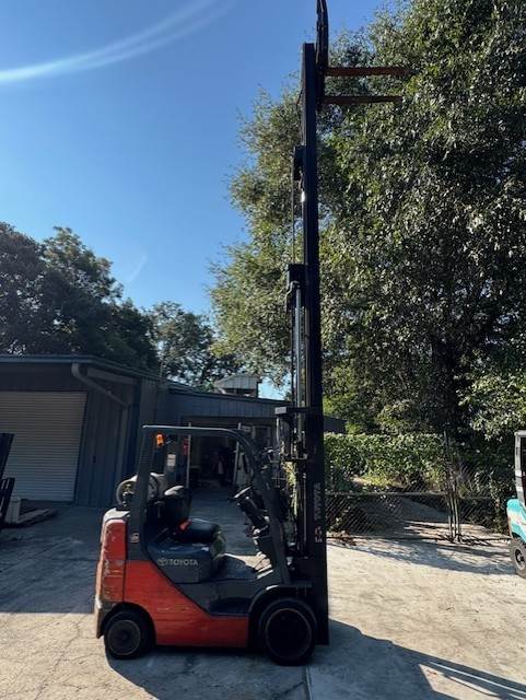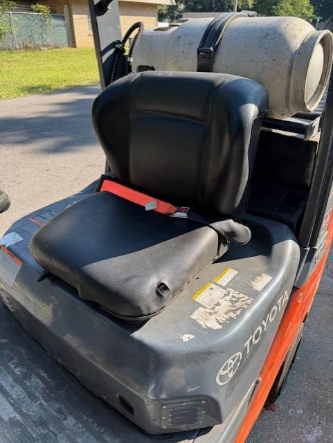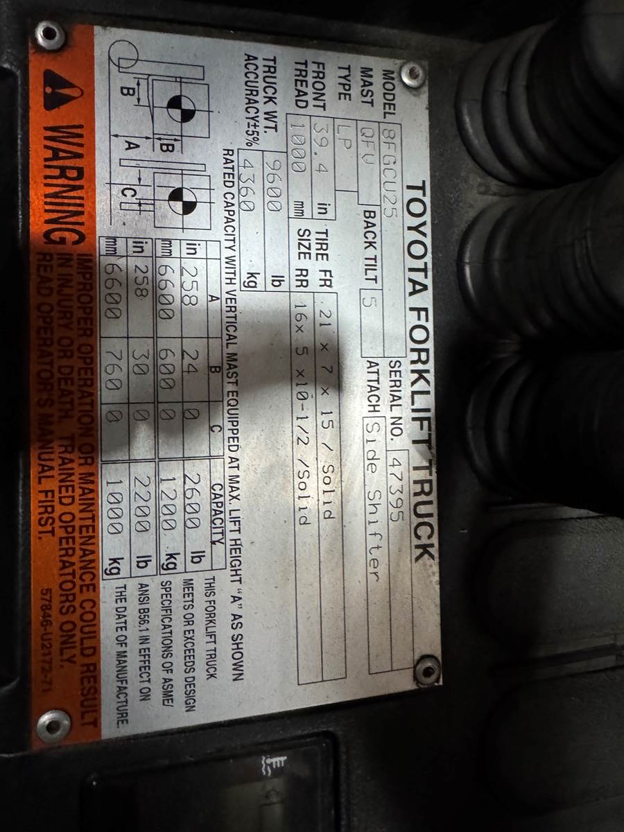 2013 Toyota 8FGCU25, Serial # 47395, 88/258" quad mast, sideshifter, 3-way, 5000lb capacity, cushion tires, propane fuel, 9047 hours, 42" forks, lbr. Runs. As-is. SDC