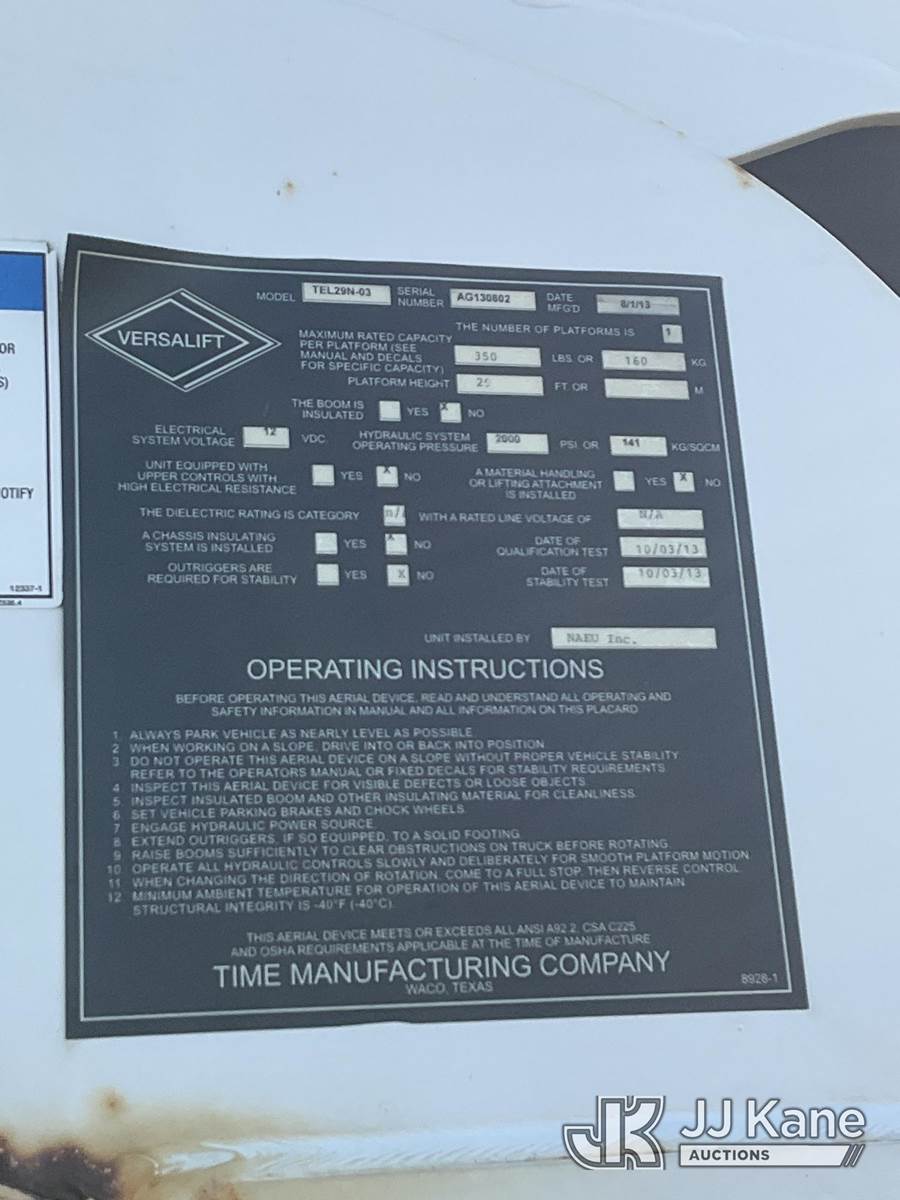 Versalift TEL29N-03, 34 ft, Telescopic Non-Insulated Bucket Truck s/n AG130802, with Single Man Bucket , rear mounted on 2013 Ram 4500 Service Truck, 6.7L Auto, diesel, A/C, (97,318 miles) (Seller States- Engine/Trans. oil Leak, Runs, Moves & Upper Not Operating, Body & Rust Damage ) This is a Titled Item NOTE: This unit is being sold AS IS/WHERE IS via Timed Auction and is located in Rome, NY. Inspection & preview days for this unit are the 2 business days prior to the first day of items closing for this auction, item is located at 5835 Success Dr Rome, NY 13440 and hours of operations are 8a-4p. For pre-sale questions, please contact Ryan Jackson @ (315) 749-3790 or Ryan.Jackson@jjkane.com. (Missing manuals, See Auction Company for Manufacturers Information to obtain manuals) (Buyer is responsible for removal. Assistance by consignor or JJ Kane Auctioneers is not assured.)
