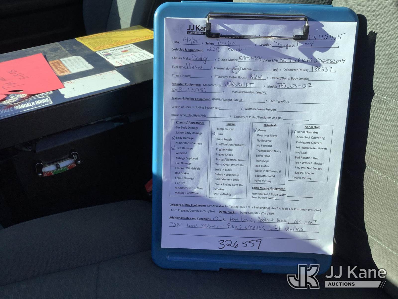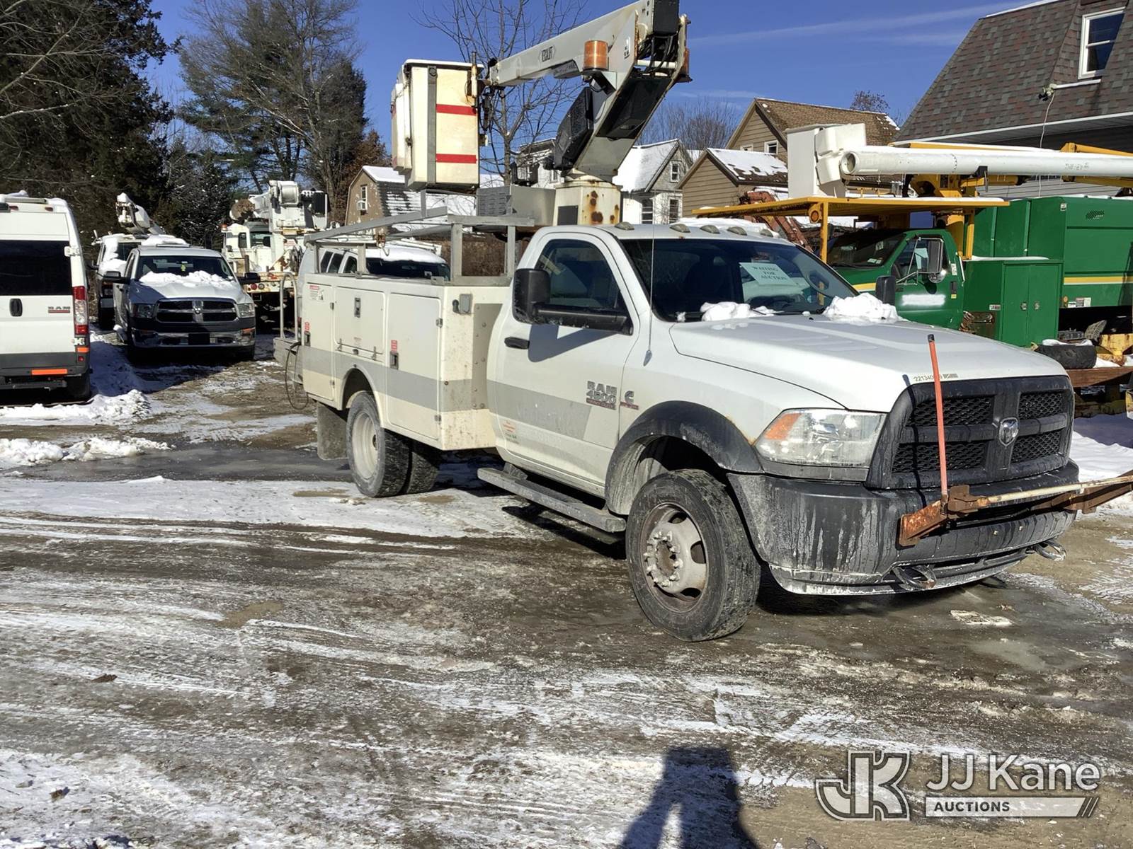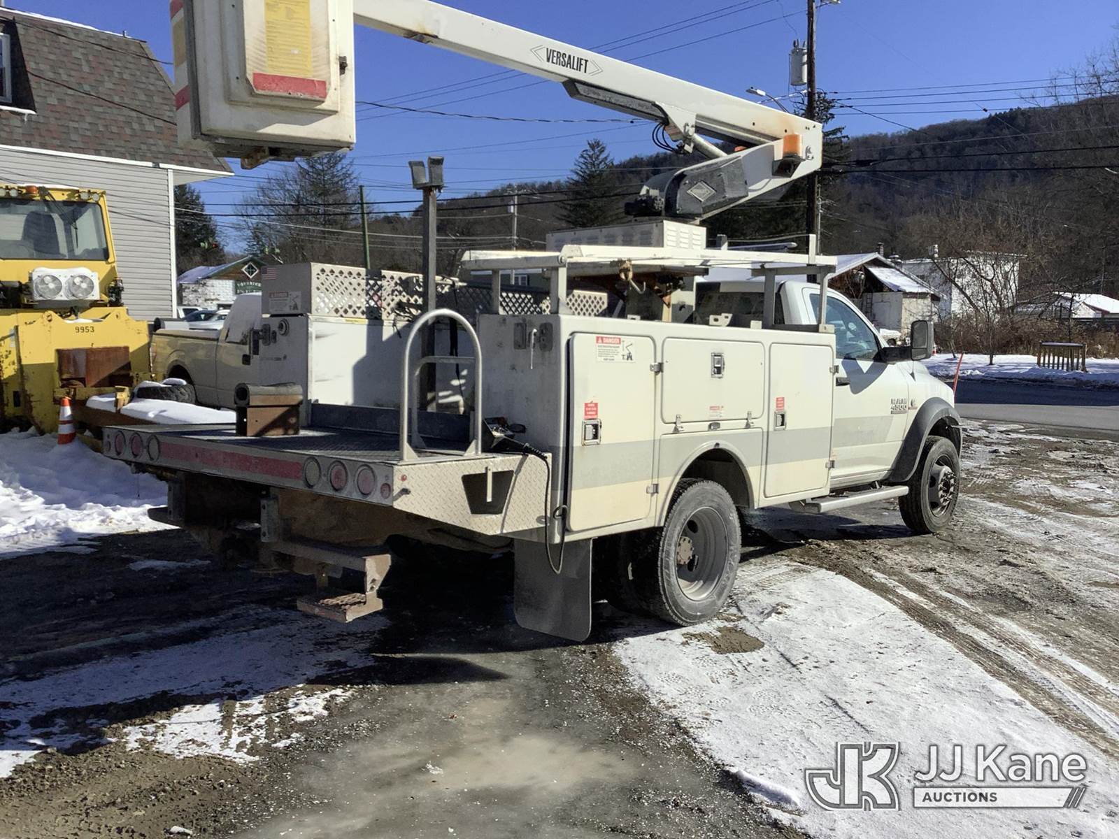 Versalift TEL29N02, 34 ft, Telescopic Non-Insulated Bucket Truck s/n AG130781, with single-man bucket, mounted behind cab on 2013 Ram 4500 Service Truck, 6.7L diesel, Auto, A/C, (188,537 miles) (Runs, Moves & Upper Operates) (Oil Pan Leak, Coolant Leak, No Heat, DEF Level Issues, Body/Rust Damage) This is a Titled Item NOTE: This unit is being sold AS IS/WHERE IS via Timed Auction and is located in Deposit, NY. Inspection & preview days for this unit are by appointment only; please contact us at contact@jjkane.com or 84-Go-JJKane for more details. (Missing manuals, See Auction Company for Manufacturers Information to obtain manuals) (Buyer is responsible for removal. Assistance by consignor or JJ Kane Auctions is not assured.)