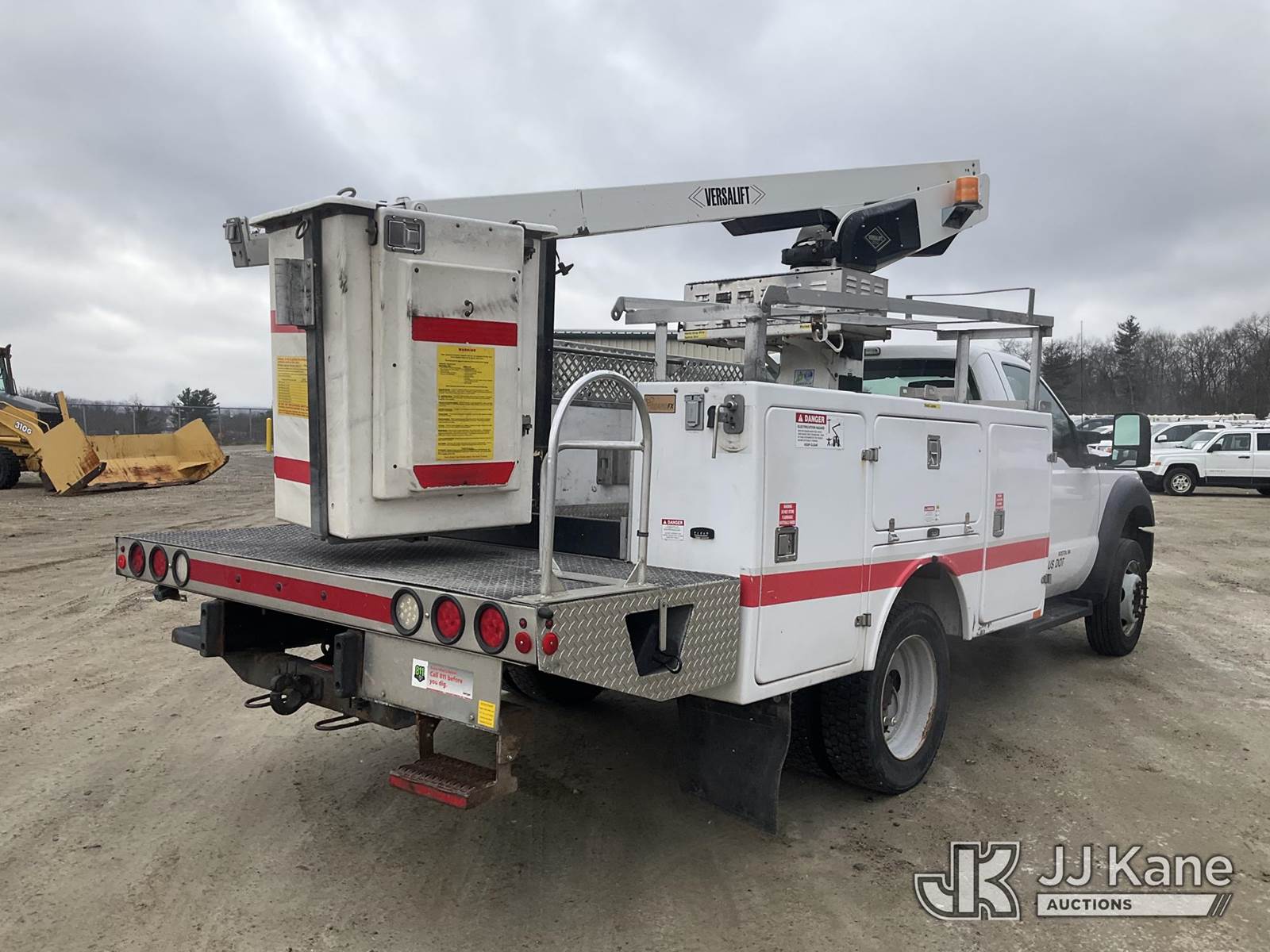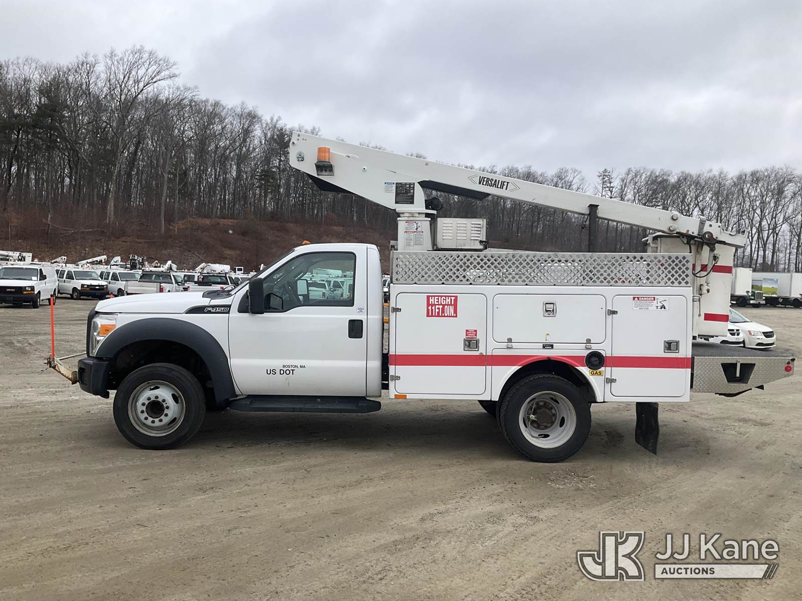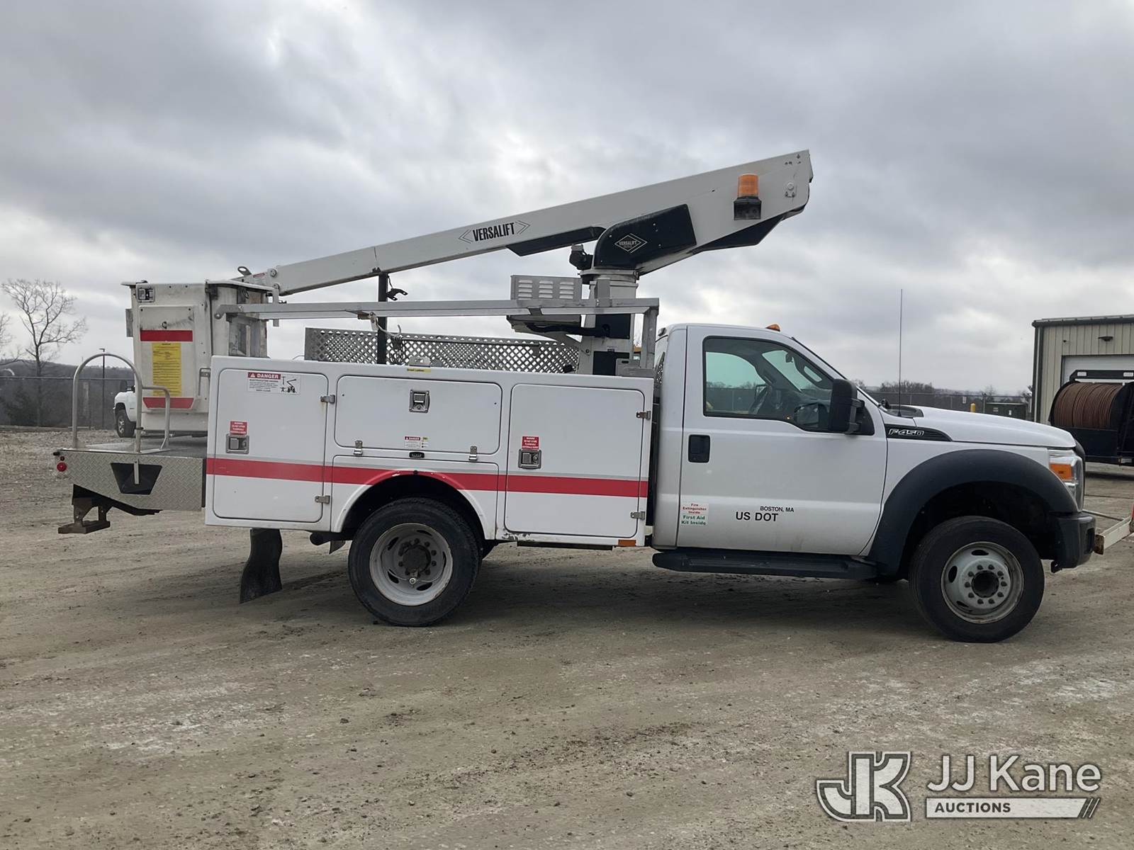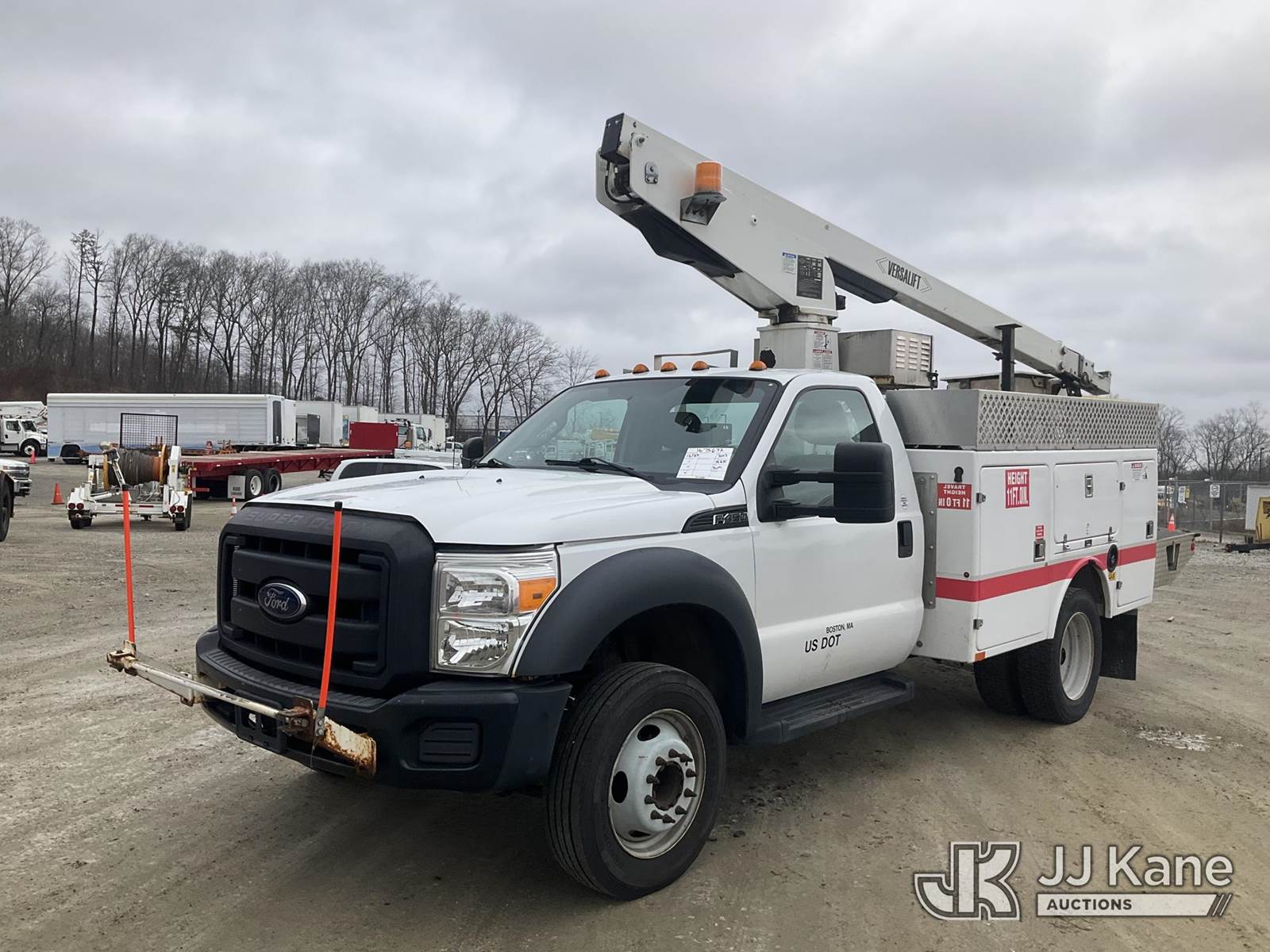 Versalift TEL29NE03, 34 ft, Telescopic Non-Insulated Bucket Truck s/n AG130281, with single-man bucket, mounted behind cab on 2013 Ford F-450 SD Service Truck, 6.8L V10 6-Speed Automatic, RWD, Gas, A/C, (156,515 miles) (Runs, Moves & Upper Operates) (Transmission Oil Leak, Damaged Hood Latch, Missing Upper Controls, Jump To Start) (Reads 11,061 hours) This is a Titled Item NOTE: This unit is being sold AS IS/WHERE IS via Timed Auction and is located in Shrewsbury, MA. Inspection & preview days for this unit are the 2 business days prior to the first day of items closing for this auction, item is located at 11 Fortune Blvd Shrewsbury, MA 01545 and hours of operations are 8a-4p. For pre-sale questions, please contact Rob Gifford @ (508) 864-4126. (Manuals provided in cab) (Buyer is responsible for removal. Assistance by consignor or JJ Kane Auctions is not assured.)