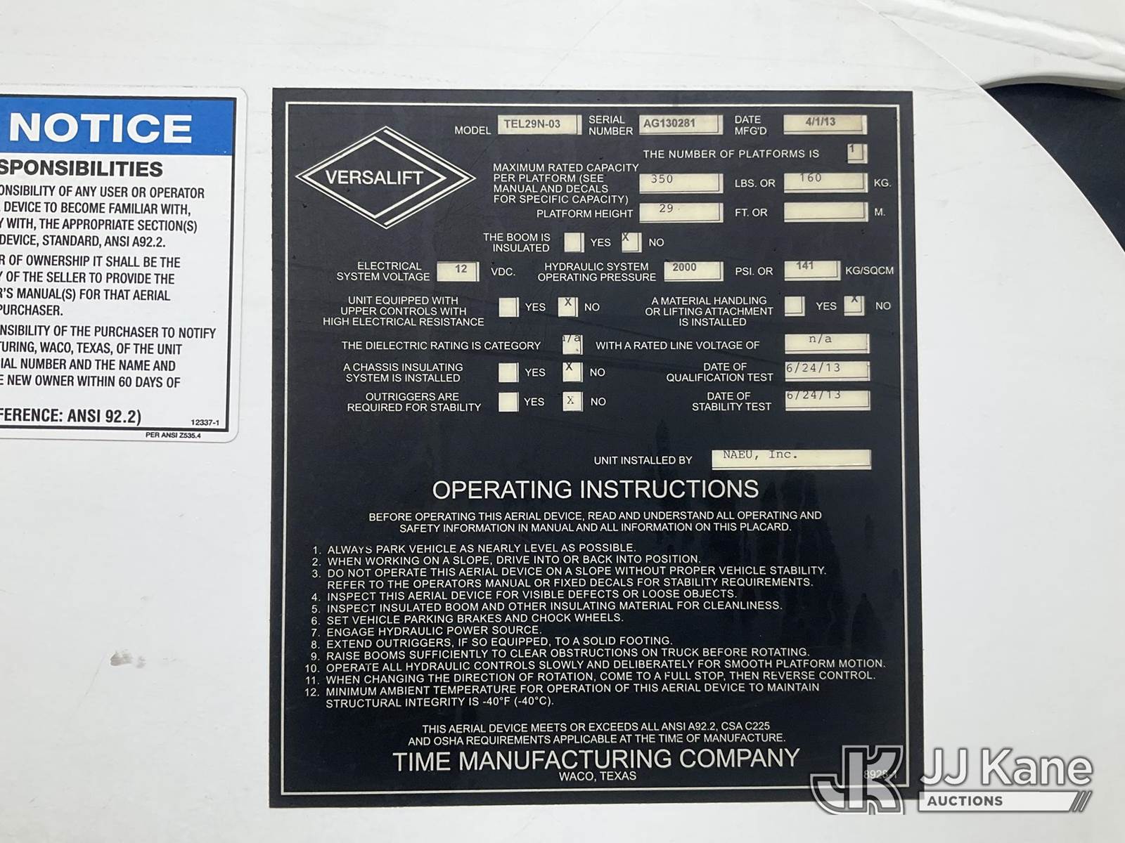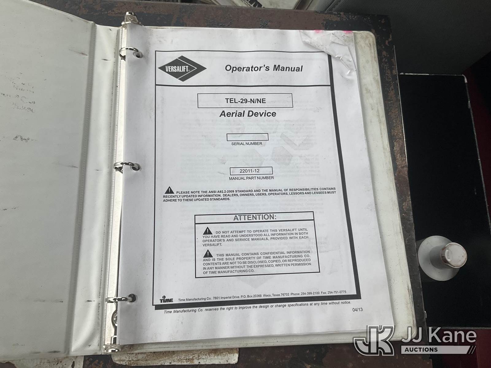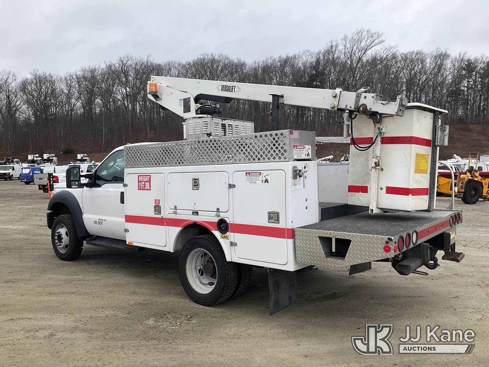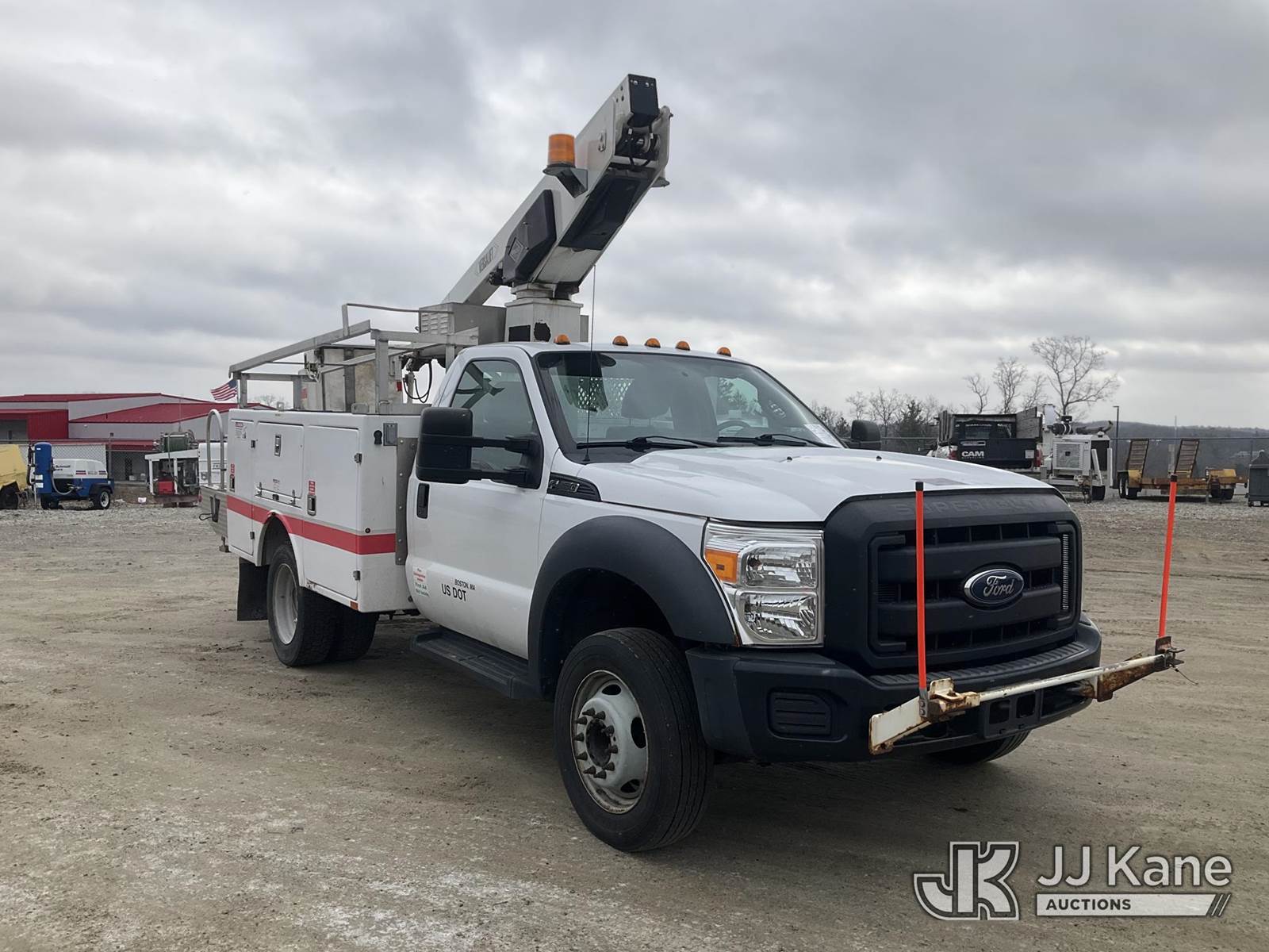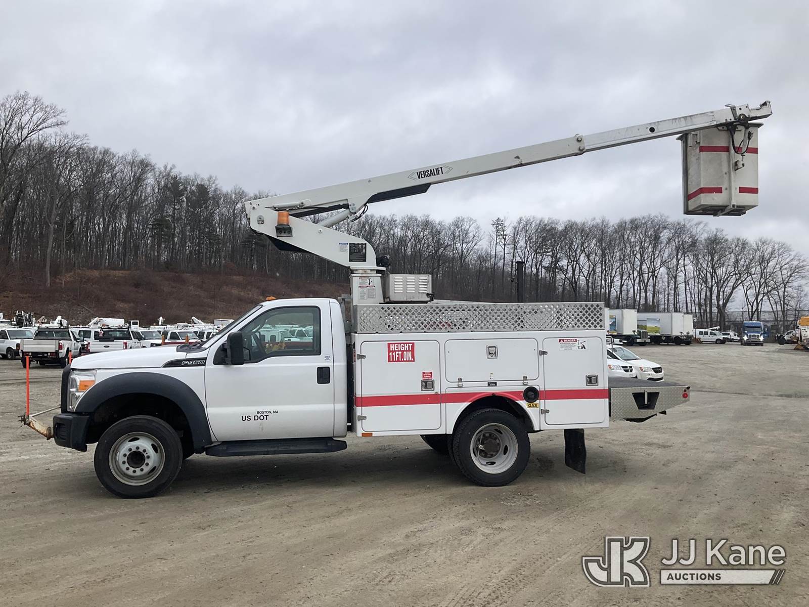 Versalift TEL29NE03, 34 ft, Telescopic Non-Insulated Bucket Truck s/n AG130281, with single-man bucket, mounted behind cab on 2013 Ford F-450 SD Service Truck, 6.8L V10 6-Speed Automatic, RWD, Gas, A/C, (156,515 miles) (Runs, Moves & Upper Operates) (Transmission Oil Leak, Damaged Hood Latch, Missing Upper Controls, Jump To Start) (Reads 11,061 hours) This is a Titled Item NOTE: This unit is being sold AS IS/WHERE IS via Timed Auction and is located in Shrewsbury, MA. Inspection & preview days for this unit are the 2 business days prior to the first day of items closing for this auction, item is located at 11 Fortune Blvd Shrewsbury, MA 01545 and hours of operations are 8a-4p. For pre-sale questions, please contact Rob Gifford @ (508) 864-4126. (Manuals provided in cab) (Buyer is responsible for removal. Assistance by consignor or JJ Kane Auctions is not assured.)