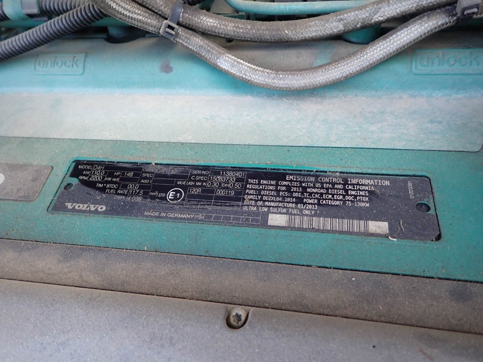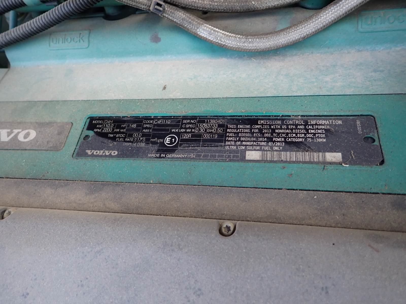 2014 Volvo D4H diesel engine, turbocharged, common rail electronic fuel system, 148 HP at 2200 RPM rating, spec # 15083730, code C4FI110, emissions family DDZXL04.1014. Test ran clean, no smoke or blowby observed during cold test run. STILL INSTALLED in a Volvo double drum roller, 4300 hours, will fit other construction equipment applications.