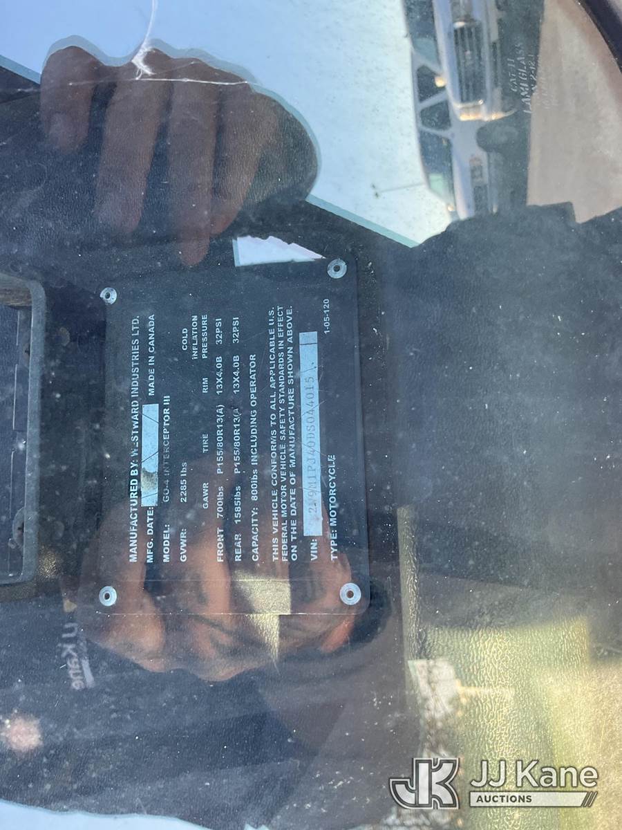 2013 Westward Industries GO-4 Interceptor III 3-Wheel Utility Vehicle, 3-cyl Auto, Gas, A/C, (23,729 miles) (Runs & Moves) This is a Titled Item NOTE: This unit is being sold AS IS/WHERE IS via Timed Auction and is located in Dixon, CA. Inspection & preview days for this unit are the 2 business days prior to the first day of items closing for this auction, item is located at 8668 Sparling Ln Dixon, CA 95620 and hours of operations are 8a-4p. For pre-sale questions, please contact JJ Kane Staff at (707) 678-8060 (dixon@jjkane.com). Dealer License Number 45696. (Buyer is responsible for removal. Assistance by consignor or JJ Kane Auctioneers is not assured.)