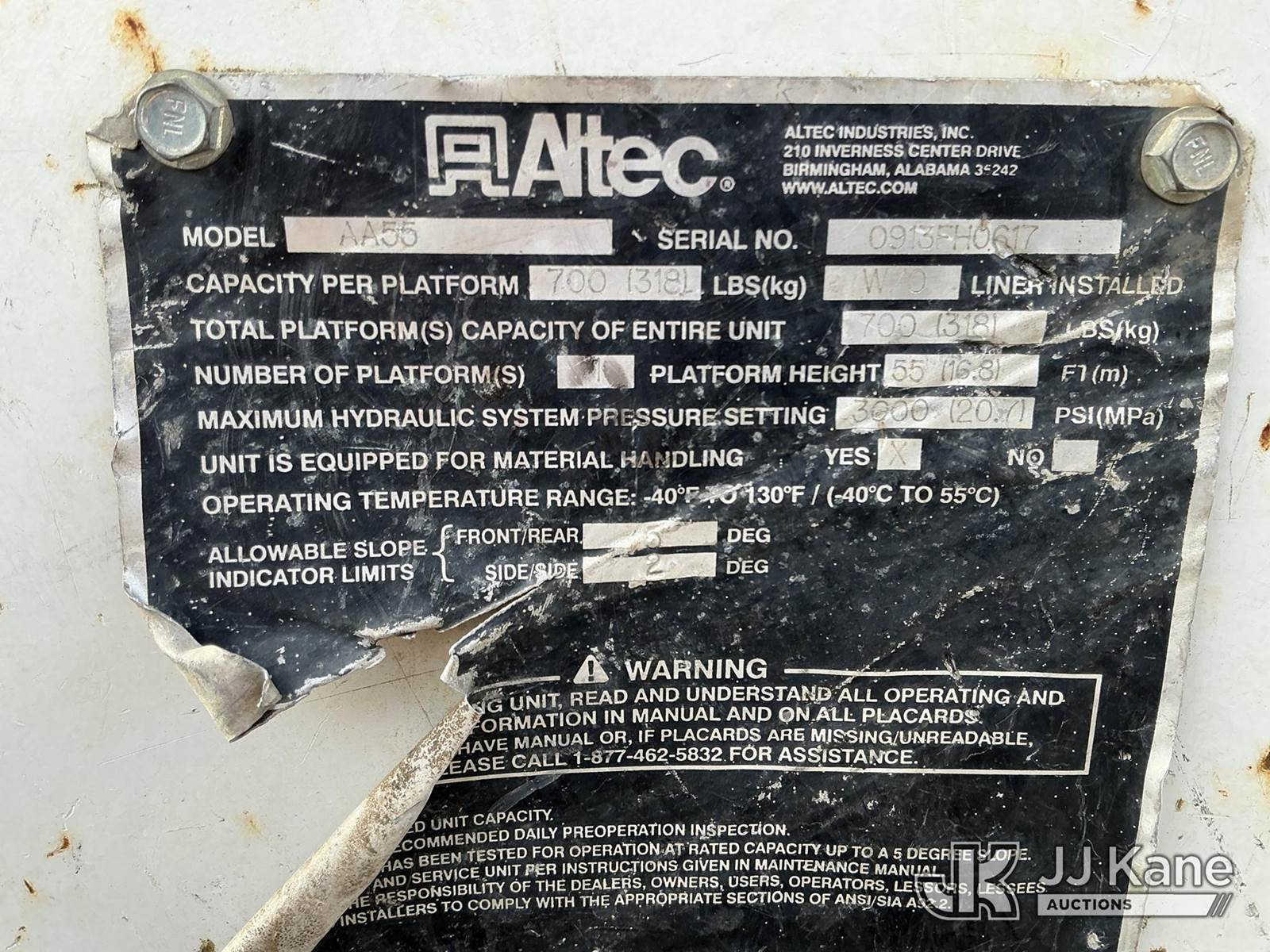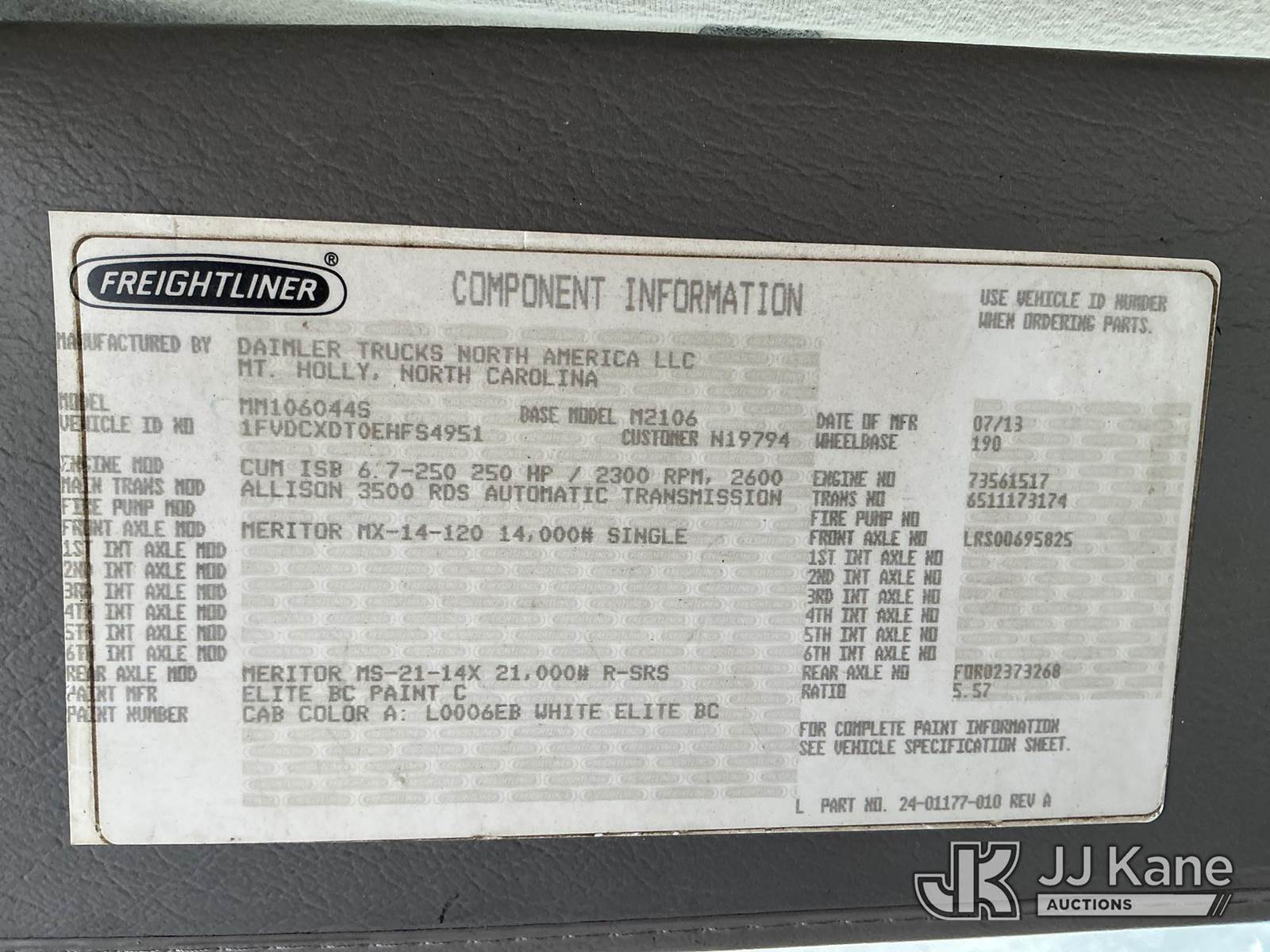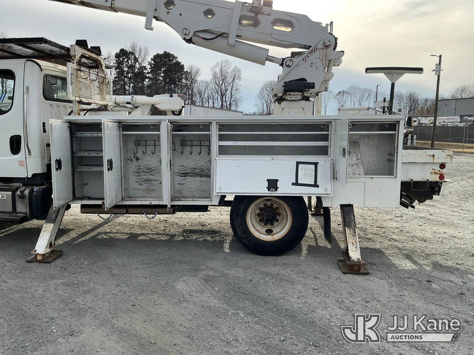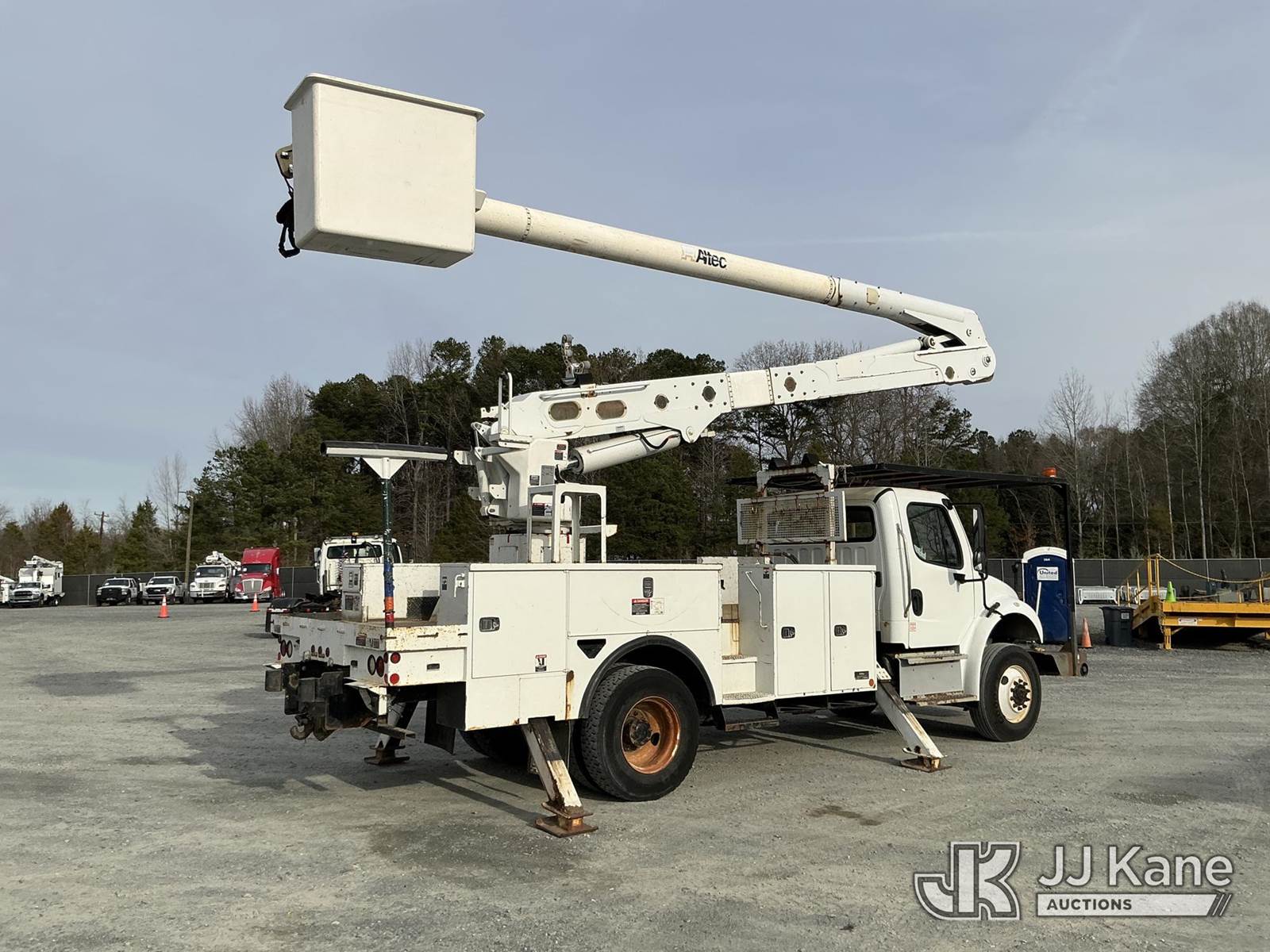 Altec AA55-MH, 60 ft, Material Handling Bucket Truck s/n 0913FH0617, with two-man bucket, rear mounted on 2014 Freightliner M2 106 4x4 Utility Truck, Cummins ISB-250 6.7L diesel, Auto, A/C, with front winch, (88,246 miles) (Runs, Moves & Upper Operates) (Check Engine Light On, Paint Damage ) This is a Titled Item NOTE: This unit is being sold AS IS/WHERE IS via Timed Auction and is located in China Grove, NC. Inspection & preview days for this unit are the 2 business days prior to the first day of items closing for this auction, item is located at 820 E NC Hwy 152 China Grove, NC 28023 and hours of operations are 8a-4p. For pre-sale questions, please contact Office Staff @ (704) 674-1113. (Manuals provided in cab) (Buyer is responsible for removal. Assistance by consignor or JJ Kane Auctioneers is not assured.)