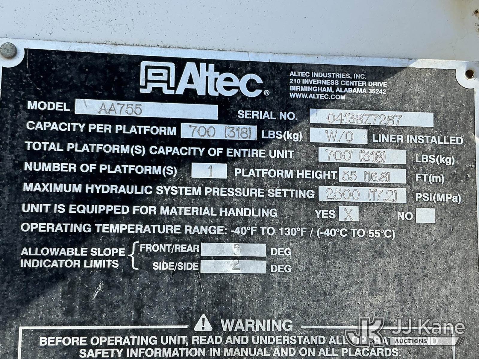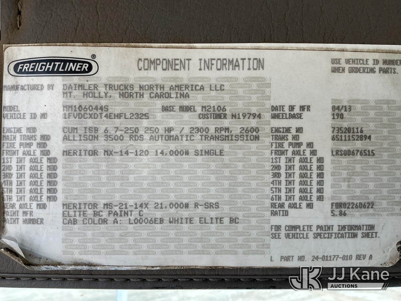 Altec AA755-MH, 60 ft, Material Handling Bucket Truck s/n 0413BZ7287, with two-man bucket, rear mounted on 2014 Freightliner M2 106 4x4 Utility Truck, Cummins ISB-250 6.7L diesel, Auto, A/C, (90,824 miles) (Runs, Moves & Upper Operates ) This is a Titled Item NOTE: This unit is being sold AS IS/WHERE IS via Timed Auction and is located in China Grove, NC. Inspection & preview days for this unit are the 2 business days prior to the first day of items closing for this auction, item is located at 820 E NC Hwy 152 China Grove, NC 28023 and hours of operations are 8a-4p. For pre-sale questions, please contact Office Staff @ (704) 674-1113. (Manuals provided in cab) (Buyer is responsible for removal. Assistance by consignor or JJ Kane Auctions is not assured.)