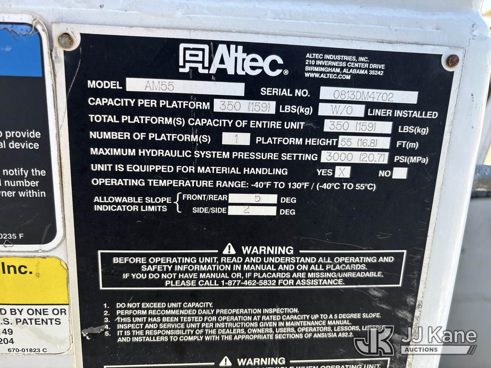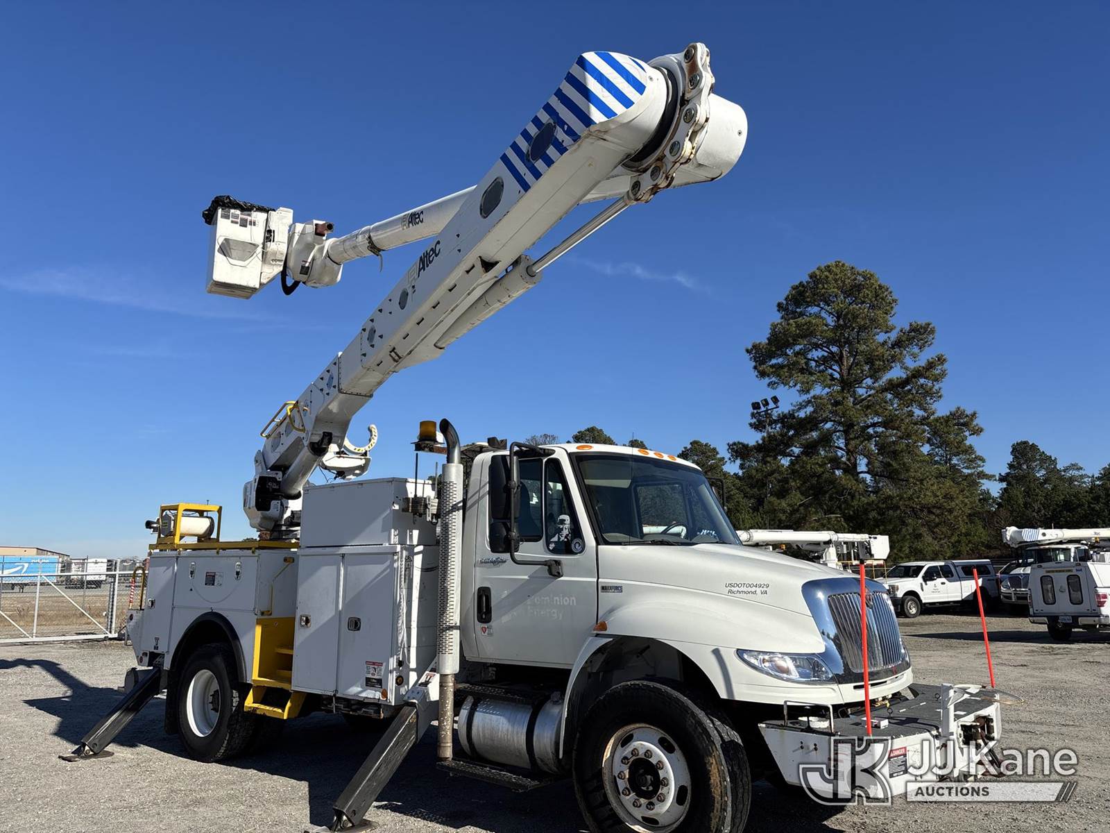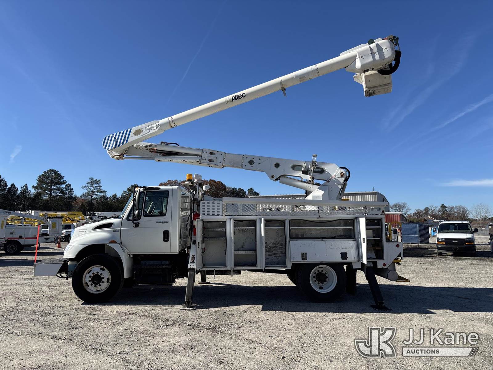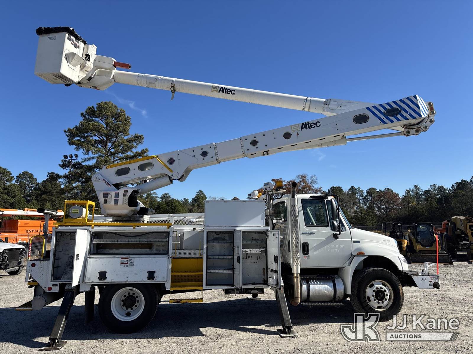 Altec AM55-MH, 60 ft, Over-Center Material Handling Bucket Truck s/n 0813DM4702, with single-man bucket & 4 hyd outriggers, rear mounted on 2014 International 4300 Utility Truck, 7.6L L6 diesel, Auto, 4X2, A/C, with front winch, (65,797 miles) (Runs, Moves, Upper Operates (Gas Pedal Not Working) (Engine Bogs Down Operating PTO)) (TITLE DELAY) This is a Titled Item NOTE: This unit is being sold AS IS/WHERE IS via Timed Auction and is located in Chester, VA. Inspection & preview days for this unit are the 2 business days prior to the first day of items closing for this auction, item is located at 13301 Great Coastal Dr Chester, VA 23836 and hours of operations are 8a-3p. For pre-sale questions, please contact Doug Caton @ 804-807-4574. (Manuals provided in cab) Sales Tax Collected Based on Residency Title To Come From Leasing Company In 30 Days(Buyer is responsible for removal. Assistance by consignor or JJ Kane Auctions is not assured.)