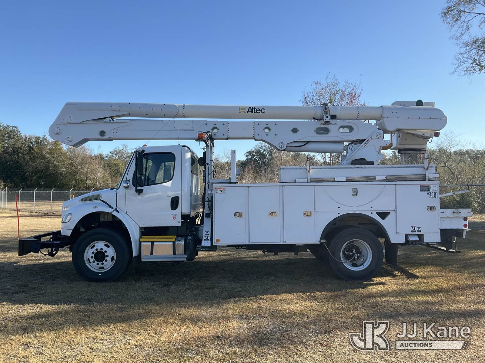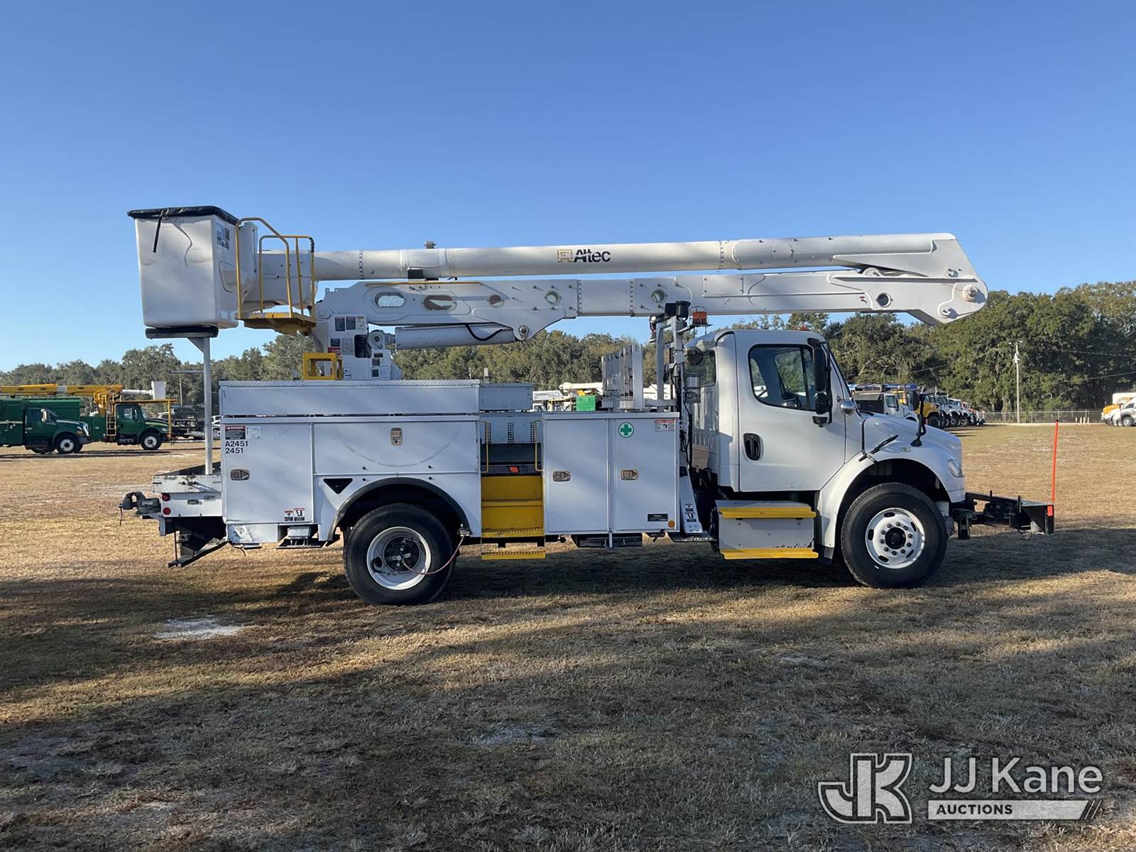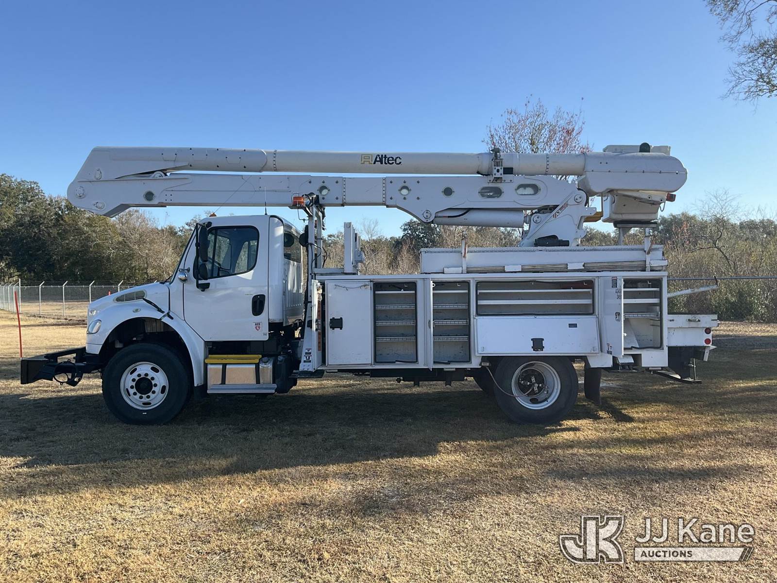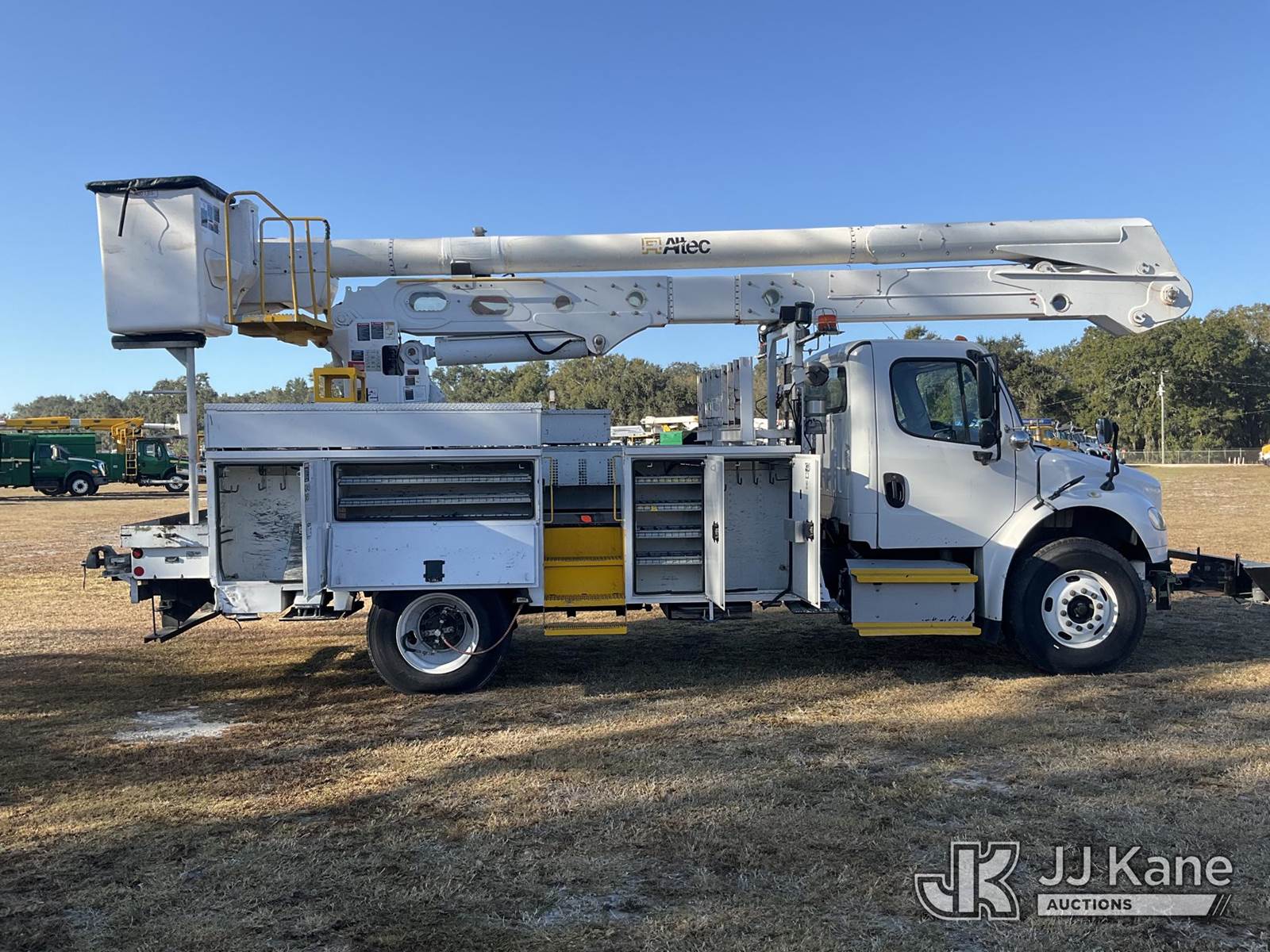Altec AN55E, 61 ft, Material Handling Bucket Truck s/n 1213FK0323, with single-man bucket & 4 hyd outriggers, rear mounted on 2014 Freightliner M2 106 Utility Truck, 8.9L L6 diesel, 4X2, Auto, A/C, (81,667 miles) (Runs, Moves, Upper Operates) (Jump To Start, Radio Not Included) (FL Residents Purchasing Titled Items – tax, title & registration fees will be collected at the maximum rate of $400.00 under 25,999 and $800.00 for Over 26,000 and $250.00 trailers – Proof of insurance is mandatory; Out of State Residents Purchasing Title Items – tax will be collected based upon your state rate) (Reads 12,860 hours) This is a Titled Item NOTE: This unit is being sold AS IS/WHERE IS via Timed Auction and is located in Thonotosassa, FL. Inspection & preview days for this unit are the 2 business days prior to the first day of items closing for this auction, item is located at 11720 N US 301 Thonotosassa, Fl 33592 and hours of operations are 8a-4p. For pre-sale questions, please contact Office Staff @ (813) 986-2485. (Manuals provided in cab) (Buyer is responsible for removal. Assistance by consignor or JJ Kane Auctions is not assured.)