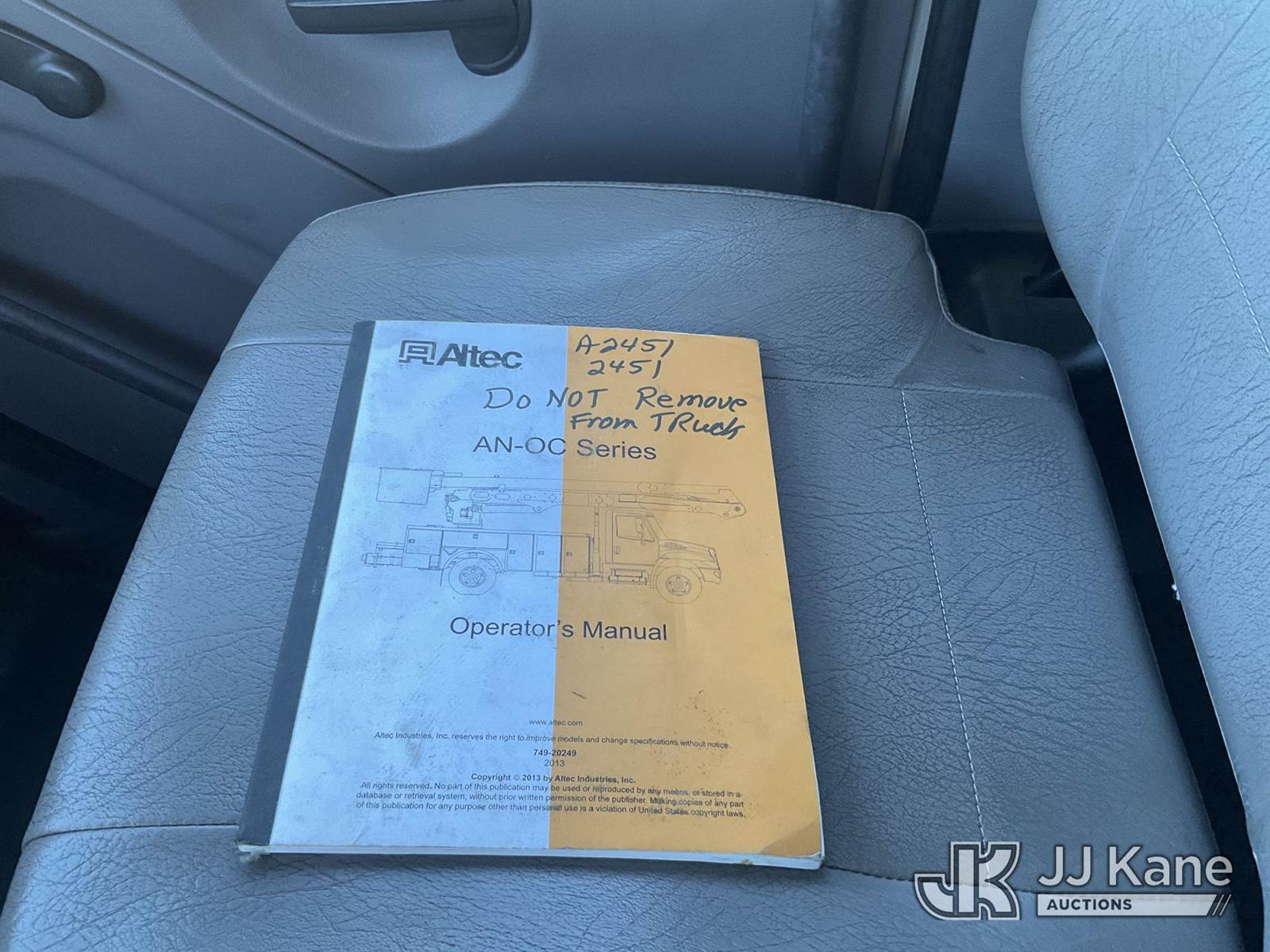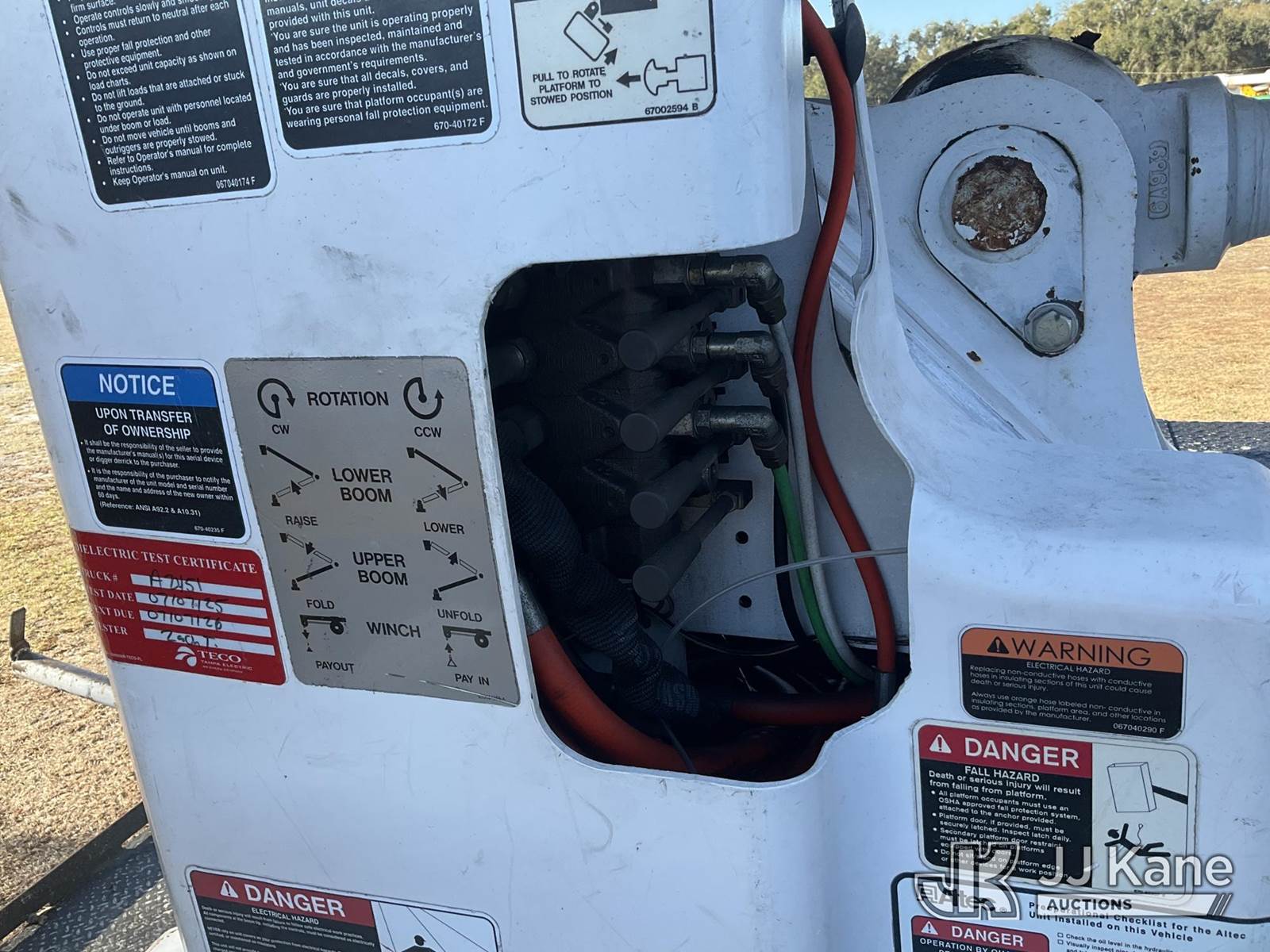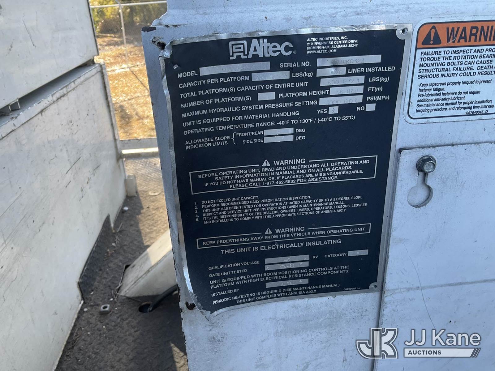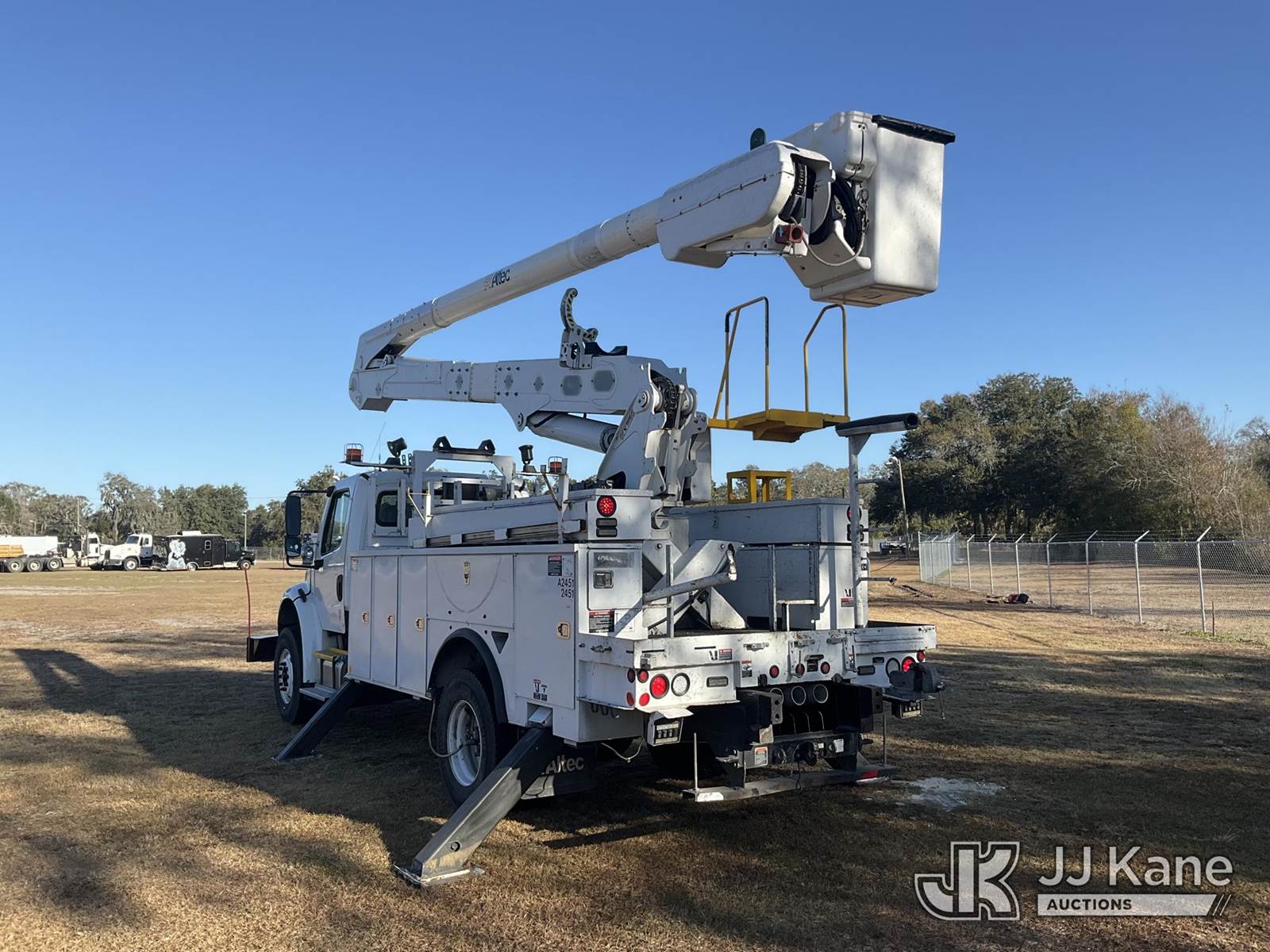 Altec AN55E, 61 ft, Material Handling Bucket Truck s/n 1213FK0323, with single-man bucket & 4 hyd outriggers, rear mounted on 2014 Freightliner M2 106 Utility Truck, 8.9L L6 diesel, 4X2, Auto, A/C, (81,667 miles) (Runs, Moves, Upper Operates) (Jump To Start, Radio Not Included) (FL Residents Purchasing Titled Items – tax, title & registration fees will be collected at the maximum rate of $400.00 under 25,999 and $800.00 for Over 26,000 and $250.00 trailers – Proof of insurance is mandatory; Out of State Residents Purchasing Title Items – tax will be collected based upon your state rate) (Reads 12,860 hours) This is a Titled Item NOTE: This unit is being sold AS IS/WHERE IS via Timed Auction and is located in Thonotosassa, FL. Inspection & preview days for this unit are the 2 business days prior to the first day of items closing for this auction, item is located at 11720 N US 301 Thonotosassa, Fl 33592 and hours of operations are 8a-4p. For pre-sale questions, please contact Office Staff @ (813) 986-2485. (Manuals provided in cab) (Buyer is responsible for removal. Assistance by consignor or JJ Kane Auctions is not assured.)