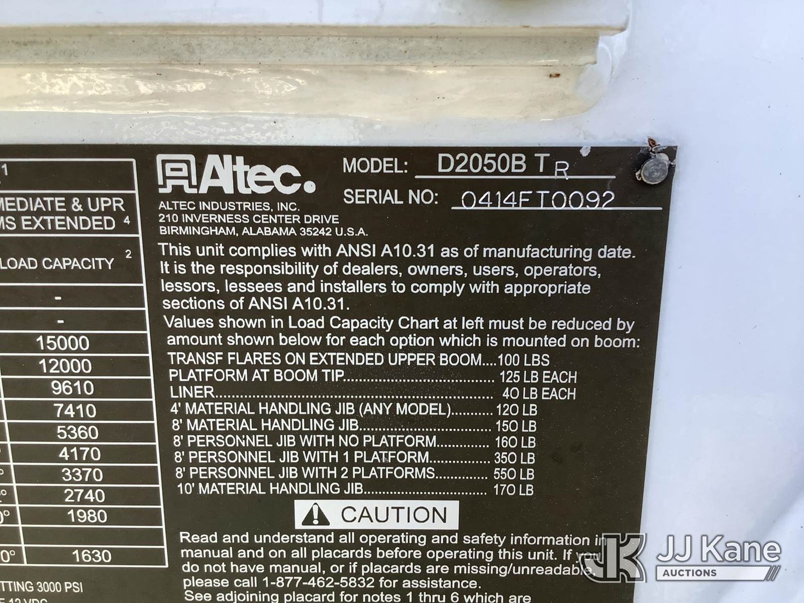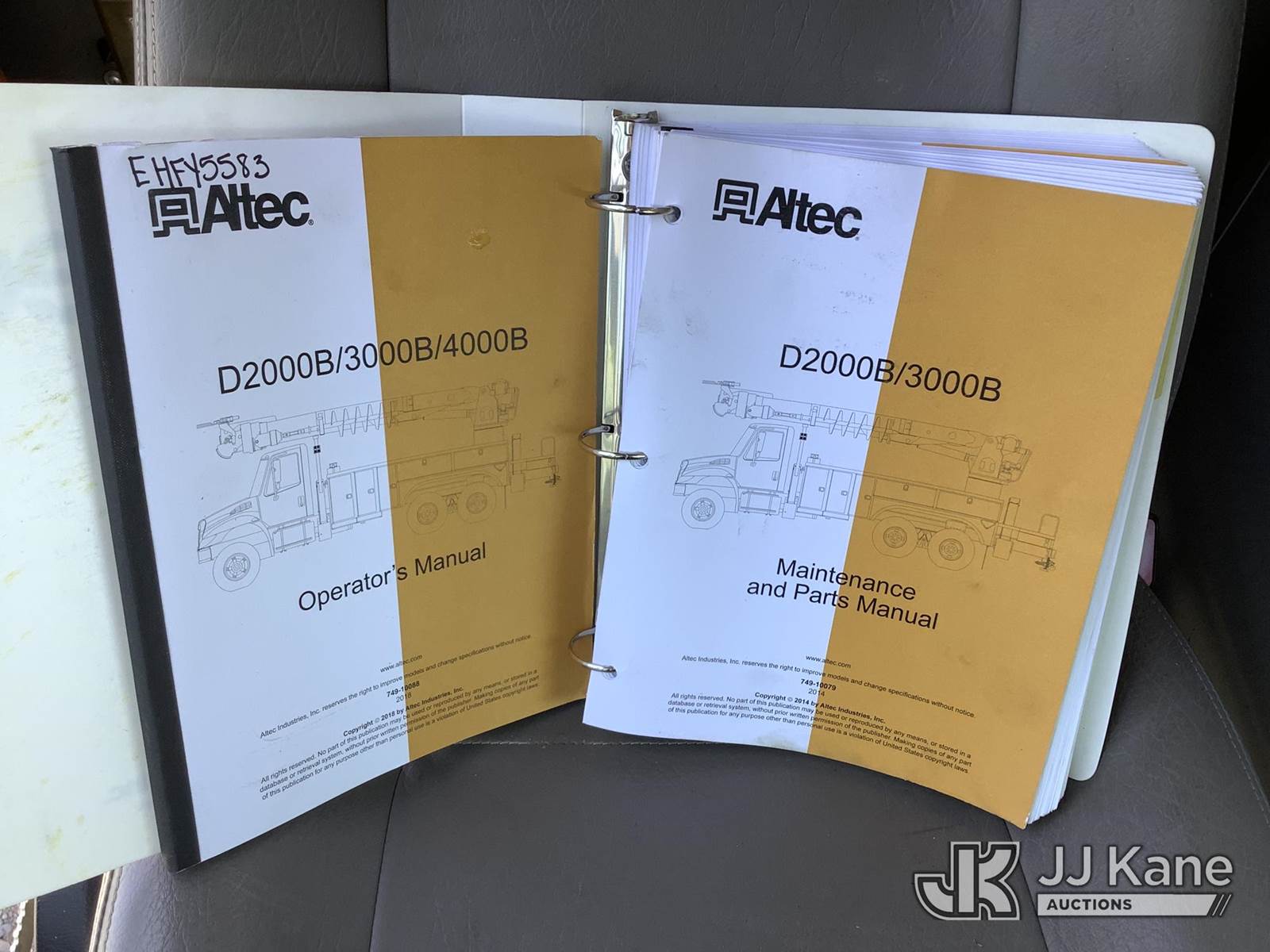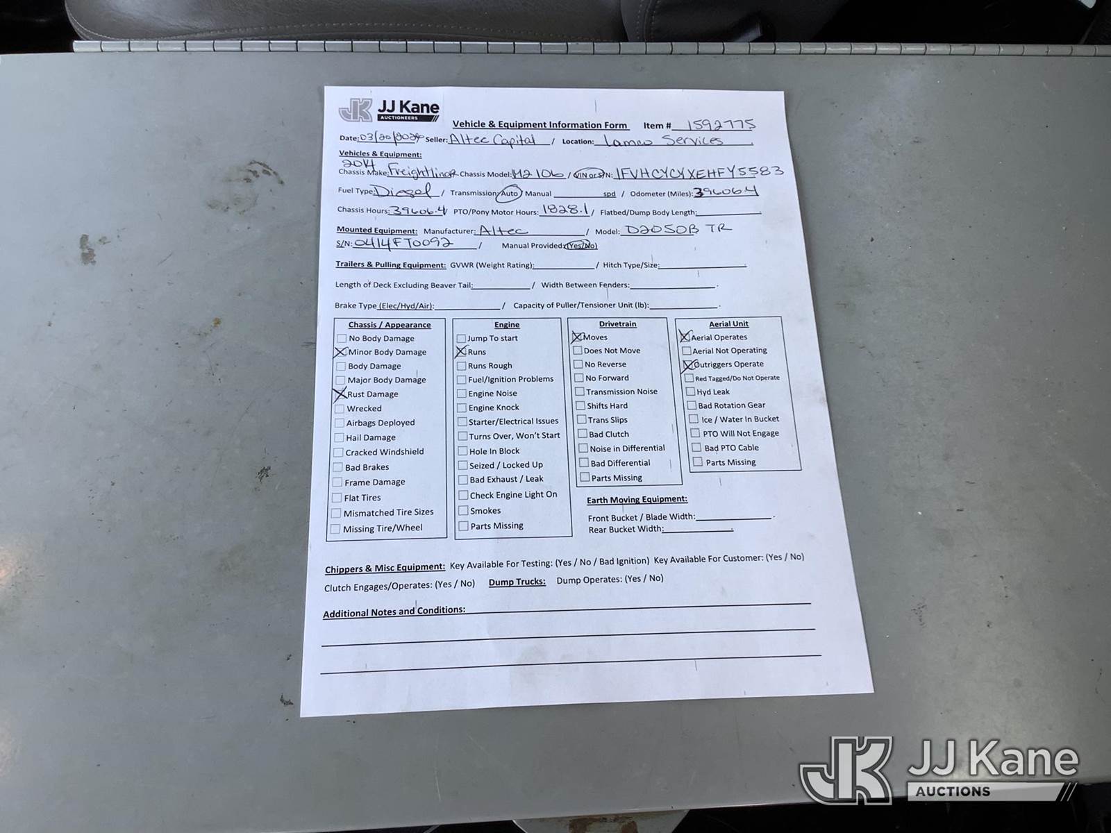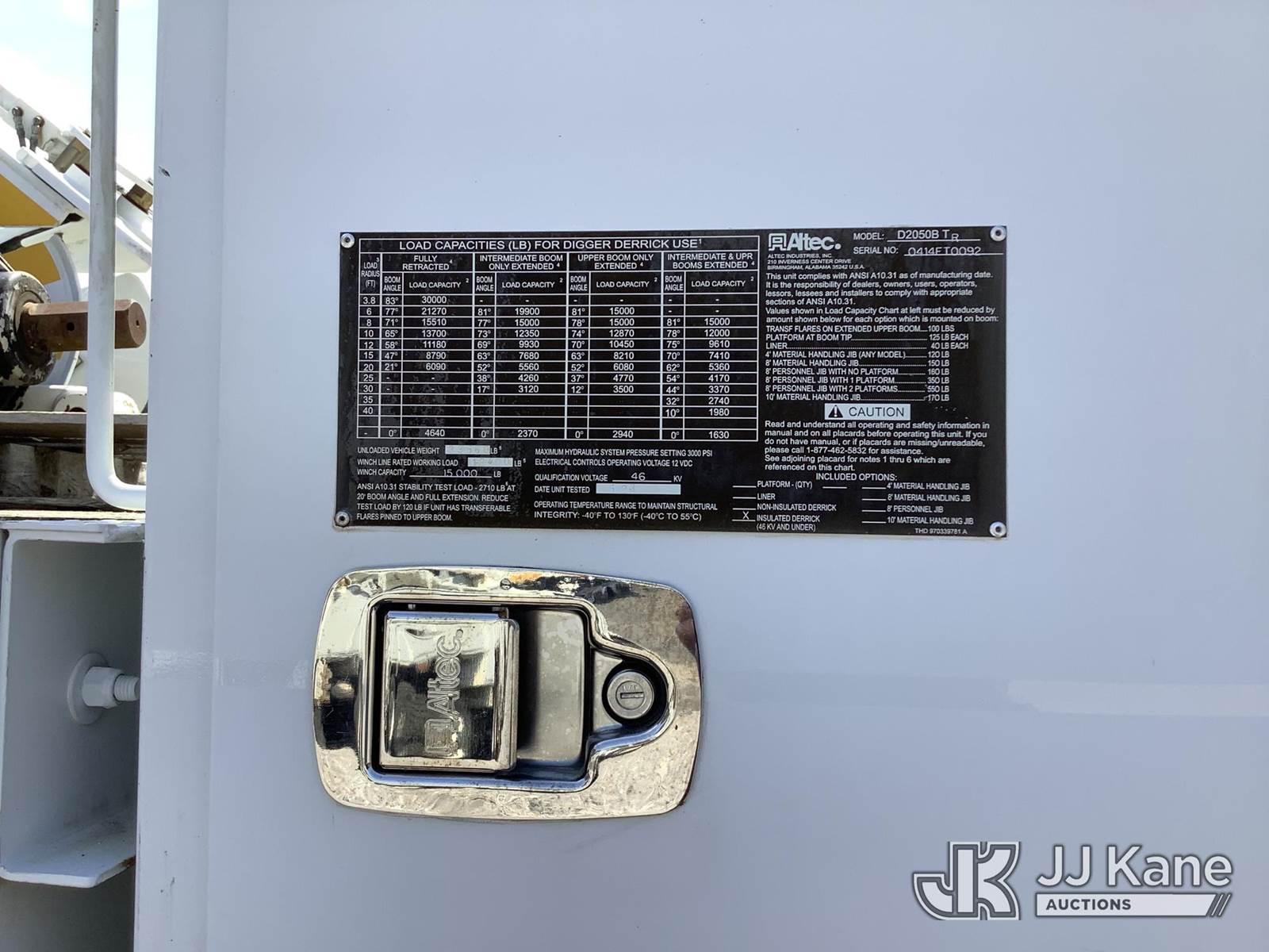 Altec D2050BTR, 30,000 Lb Digger Derrick s/n 0414FT0092, with 50' sheave height, 2 spd digger, tip winch, pole grabs & riding console, rear mounted on 2014 Freightliner M2 106 T/A Flatbed/Utility Truck, 8.9L L6 DIESEL 6X4, Auto, (039,606 miles) (Runs, Moves & Upper Operates) (Outriggers Operate, Rust Damage, Minor Body Damage) This is a Titled Item NOTE: This unit is being sold AS IS/WHERE IS via Timed Auction and is located in Graysville, AL. Inspection & preview days for this unit are by appointment only; please contact us at contact@jjkane.com or 84-Go-JJKane for more details. Alabama Auctioneer Michael Whitebread - License # 5592 (Manuals provided in cab) (Buyer is responsible for removal. Assistance by consignor or JJ Kane Auctions is not assured.)