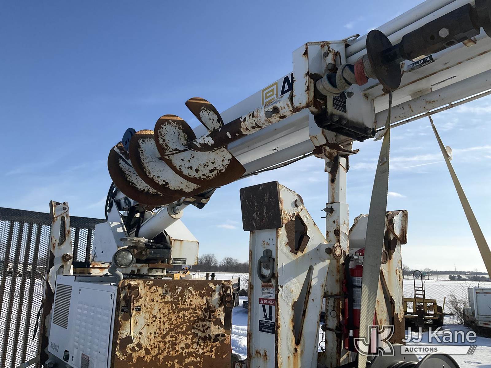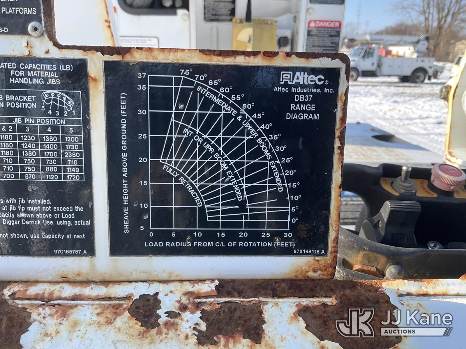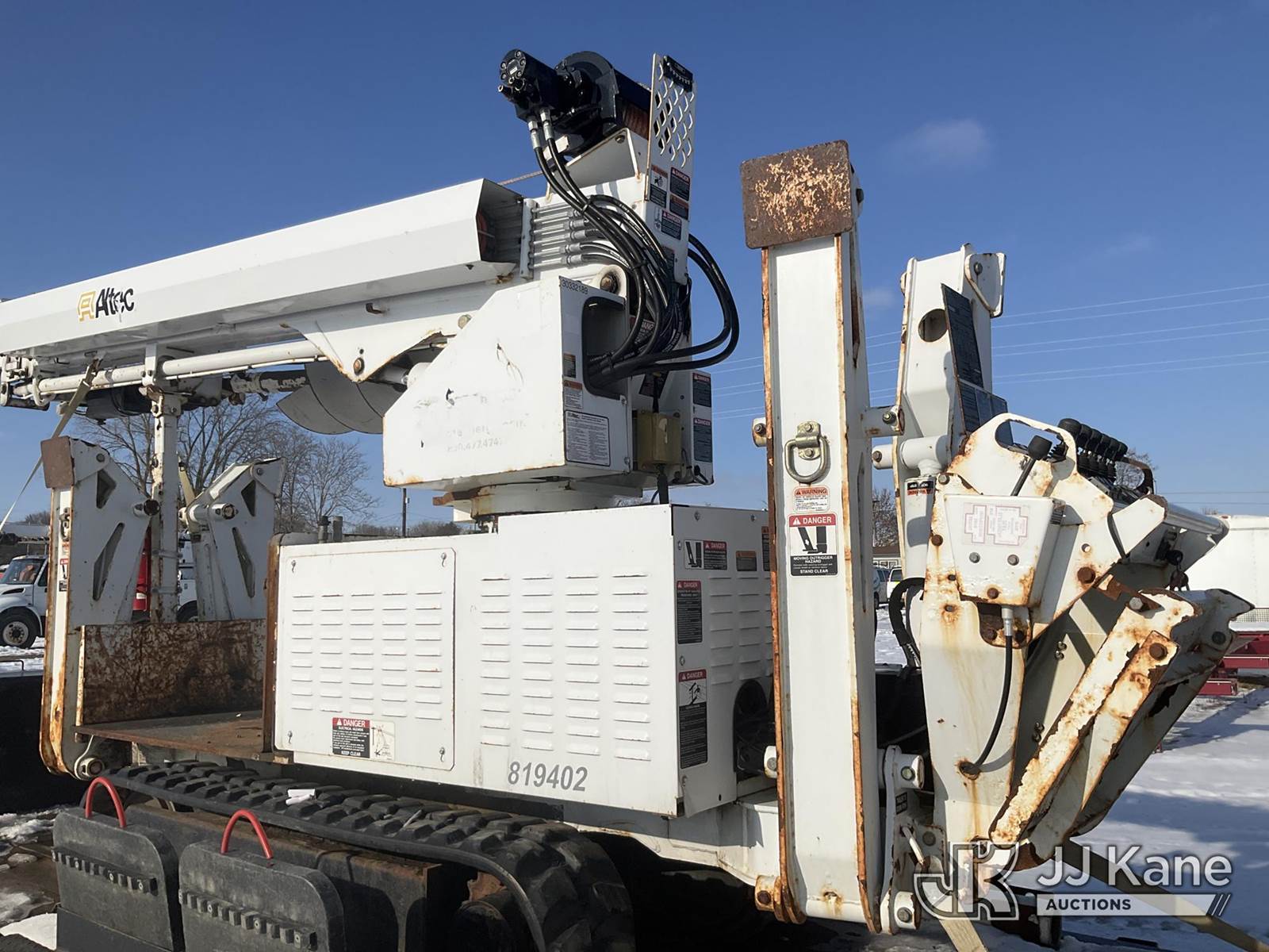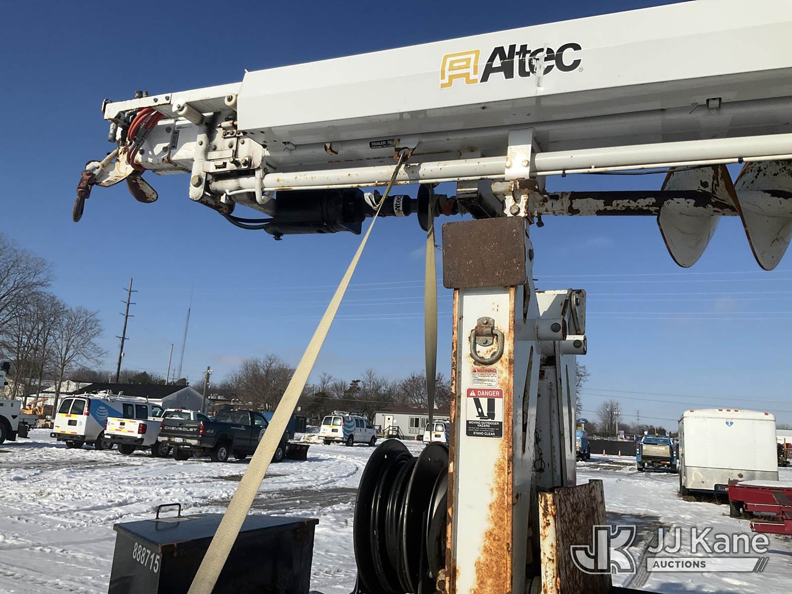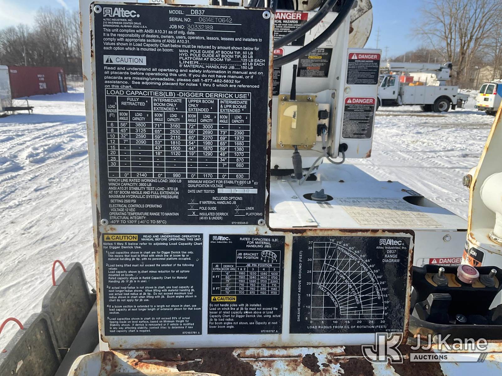 Altec DB37, 3,800 Lb Back Yard Digger Derrick s/n 0614ET0642, with 37 ft. sheave height, 8 ft. pin on jib, three section hydraulic boom, heel winch, pole guides, auger, mounted on 2014 Altec Crawler Back Yard Carrier, s/n C64180, Kubota Hydraulic Drive, diesel, with wireless remote (condition unknown), rubber tracks, four hydraulic outriggers, sells with support trailer ID 1569446 (Runs, Does Not Move, Upper Condition Unknown) (Jump to Start, Rust, Pole Guide Removed) (Reads 652 hours) NOTE: This unit is being sold AS IS/WHERE IS via Timed Auction and is located in Charlotte, MI. Inspection & preview days for this unit are the 2 business days prior to the first day of items closing for this auction, item is located at 750 Island Hwy Charlotte, MI 48813 and hours of operations are 8a-4p. For pre-sale questions, please contact Corey Cook at (517) 983-0796 or corey.cook@jjkane.com (Manuals provided in cab) (Buyer is responsible for removal. Assistance by consignor or JJ Kane Auctions is not assured.)