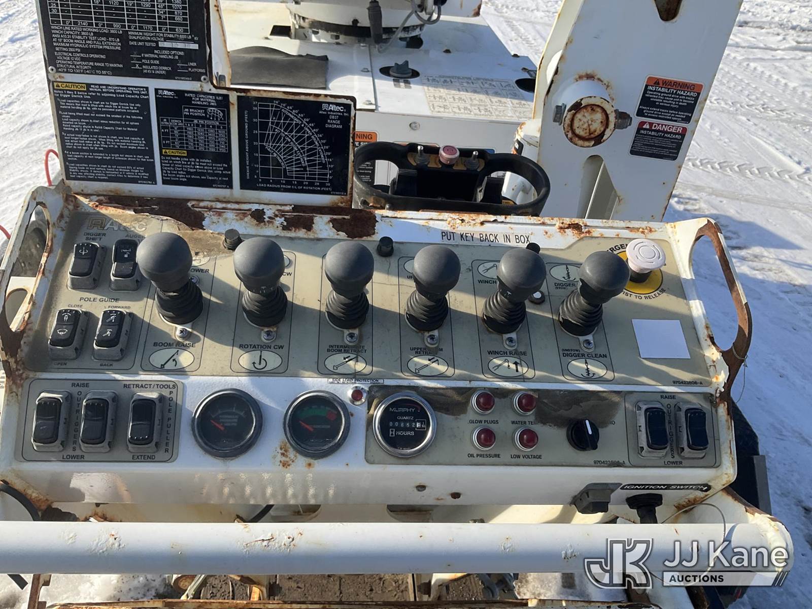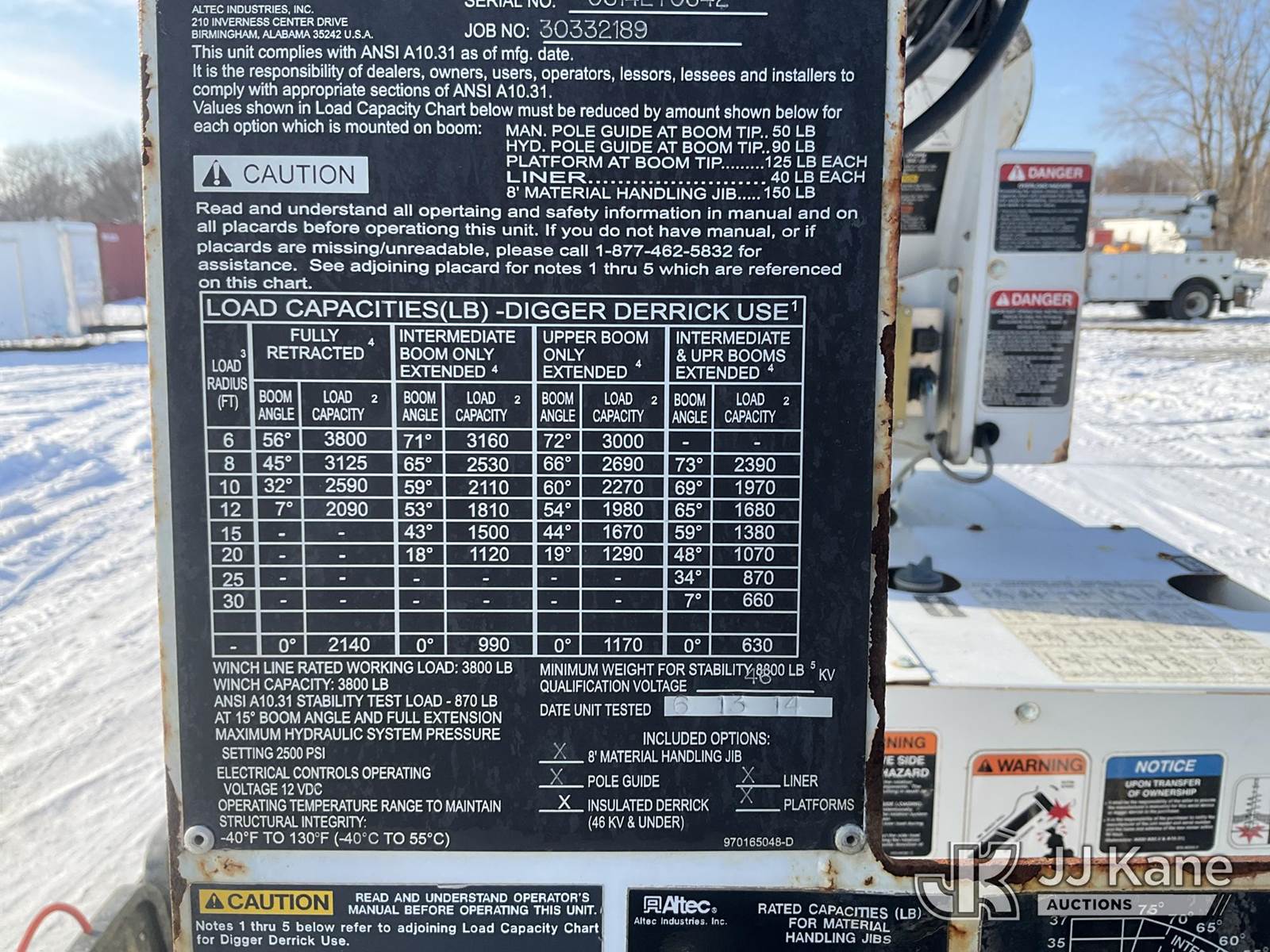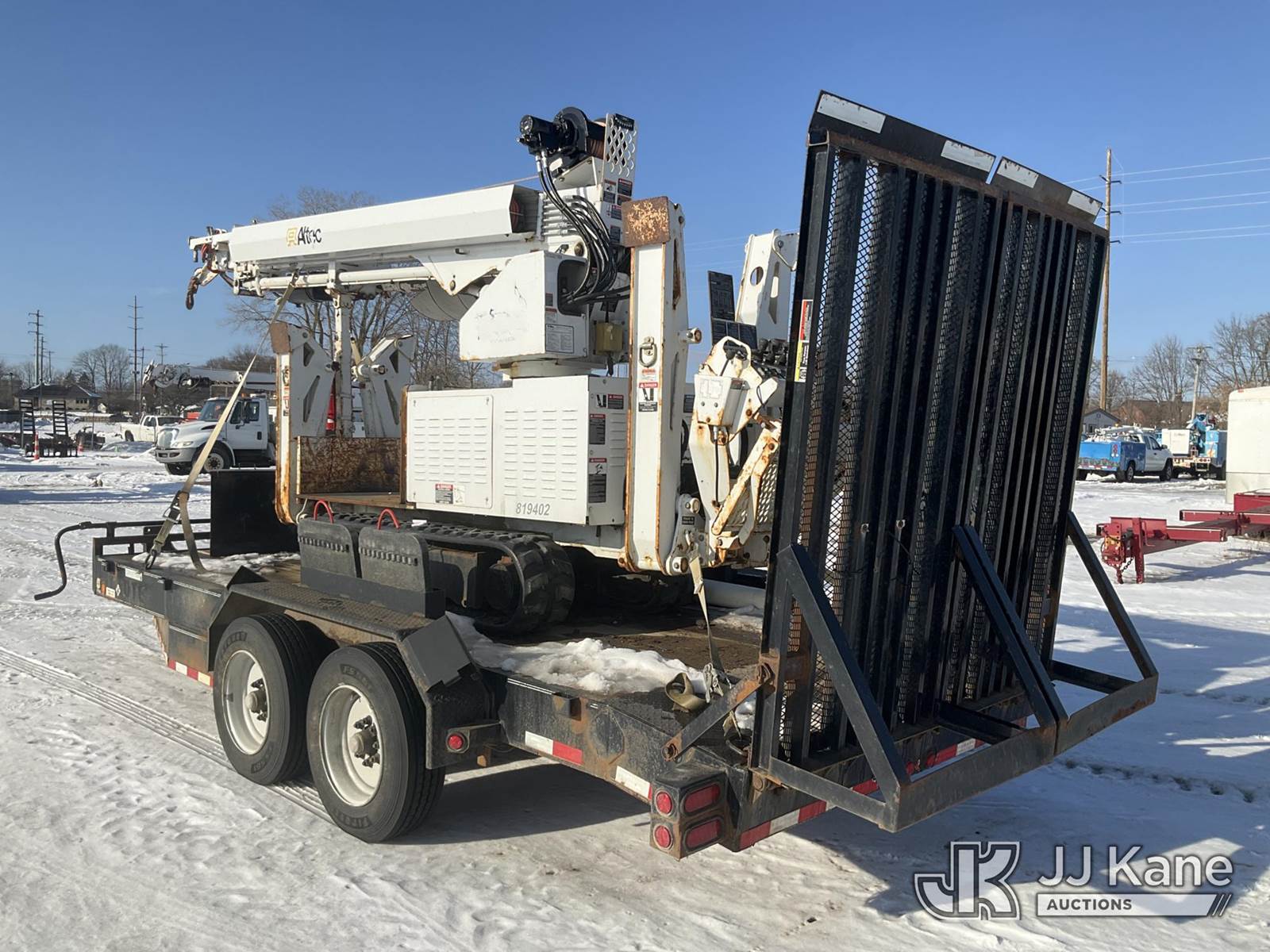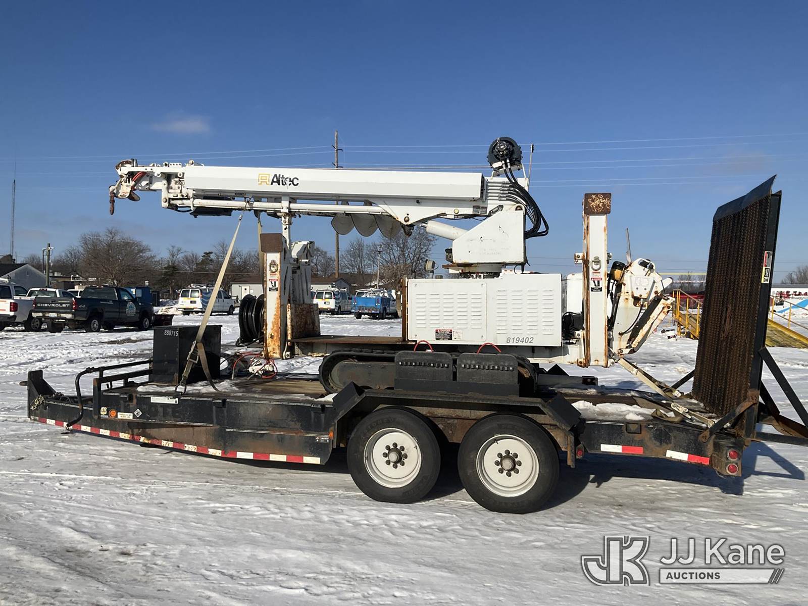 Altec DB37, 3,800 Lb Back Yard Digger Derrick s/n 0614ET0642, with 37 ft. sheave height, 8 ft. pin on jib, three section hydraulic boom, heel winch, pole guides, auger, mounted on 2014 Altec Crawler Back Yard Carrier, s/n C64180, Kubota Hydraulic Drive, diesel, with wireless remote (condition unknown), rubber tracks, four hydraulic outriggers, sells with support trailer ID 1569446 (Runs, Does Not Move, Upper Condition Unknown) (Jump to Start, Rust, Pole Guide Removed) (Reads 652 hours) NOTE: This unit is being sold AS IS/WHERE IS via Timed Auction and is located in Charlotte, MI. Inspection & preview days for this unit are the 2 business days prior to the first day of items closing for this auction, item is located at 750 Island Hwy Charlotte, MI 48813 and hours of operations are 8a-4p. For pre-sale questions, please contact Corey Cook at (517) 983-0796 or corey.cook@jjkane.com (Manuals provided in cab) (Buyer is responsible for removal. Assistance by consignor or JJ Kane Auctions is not assured.)