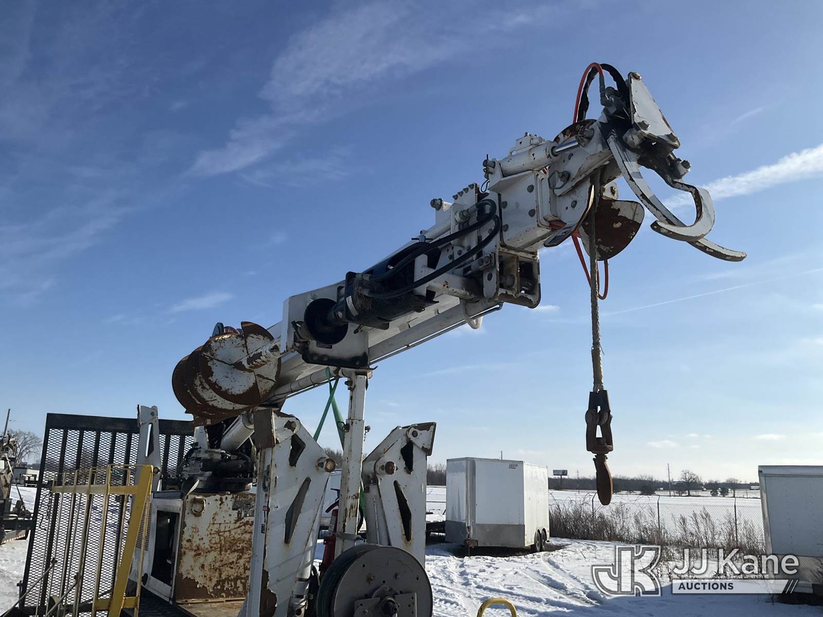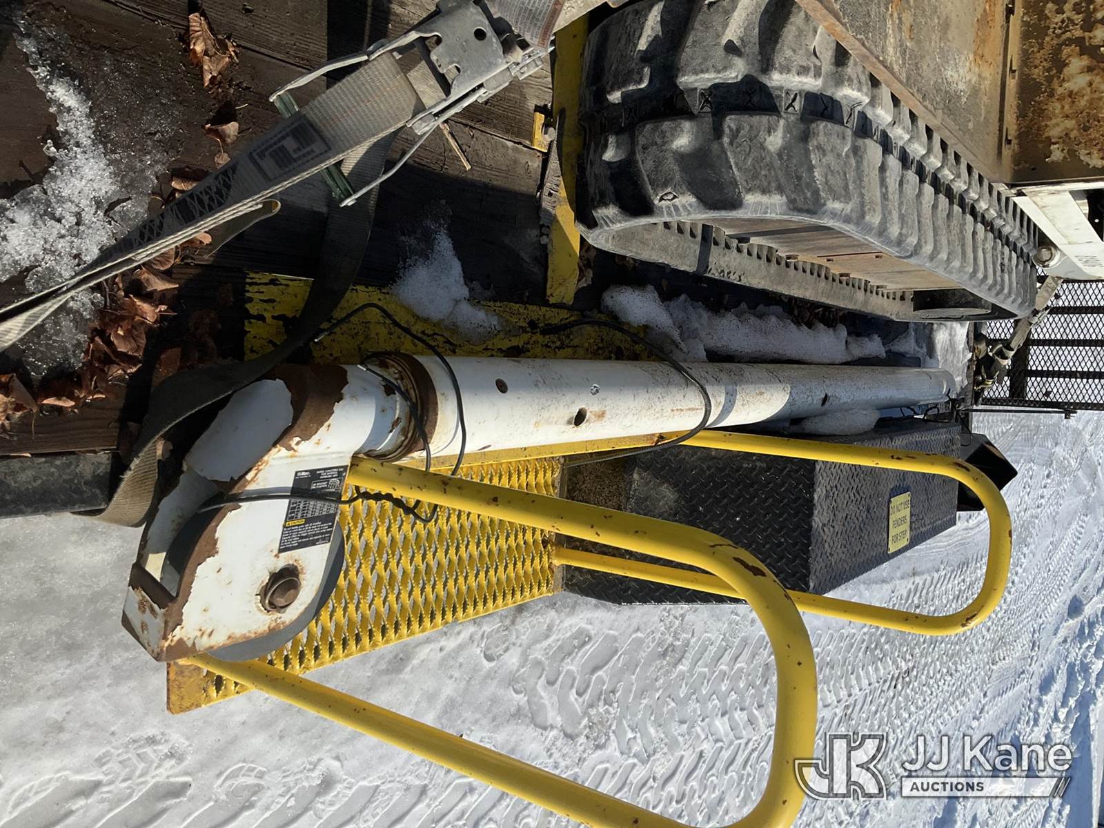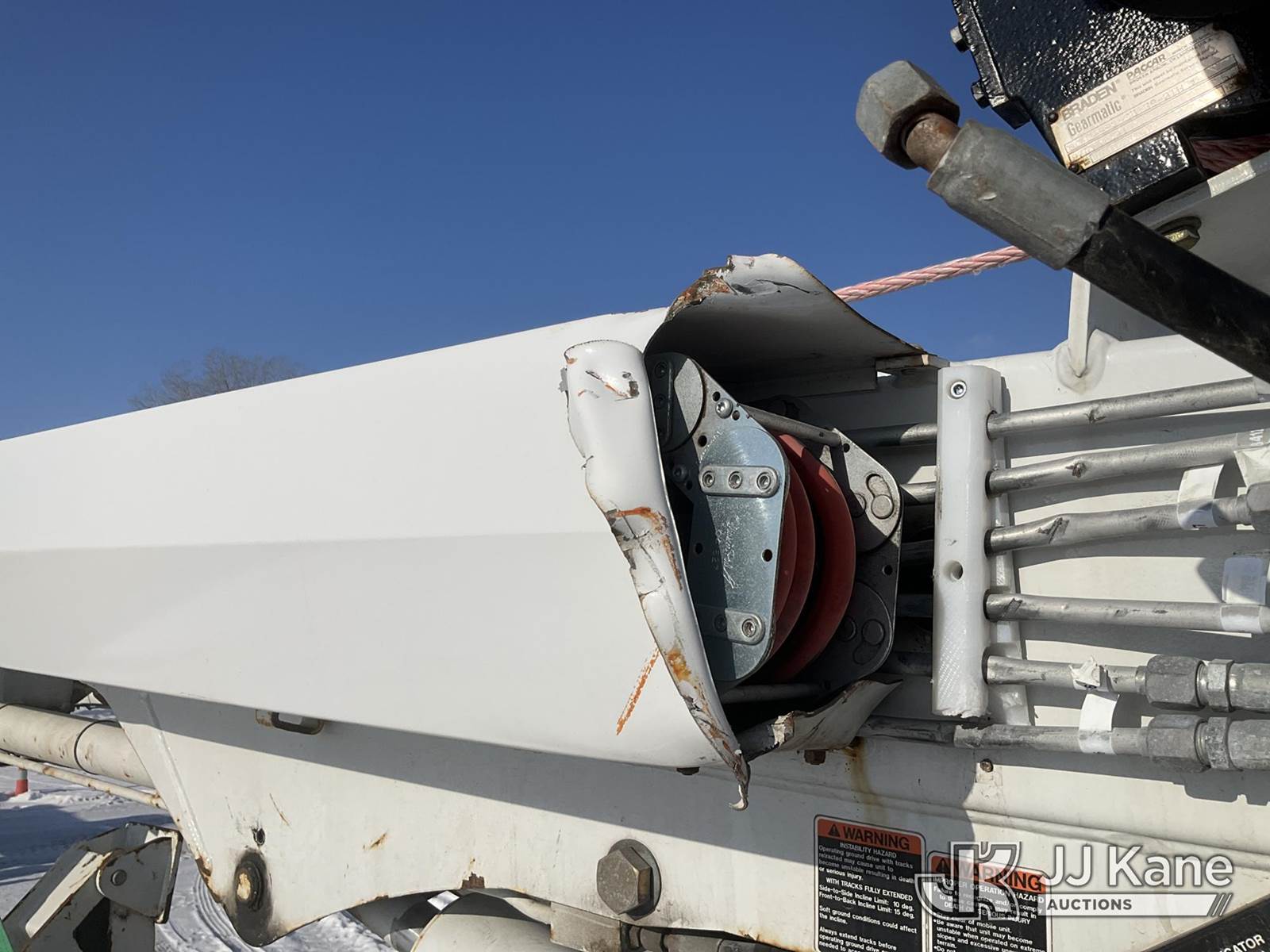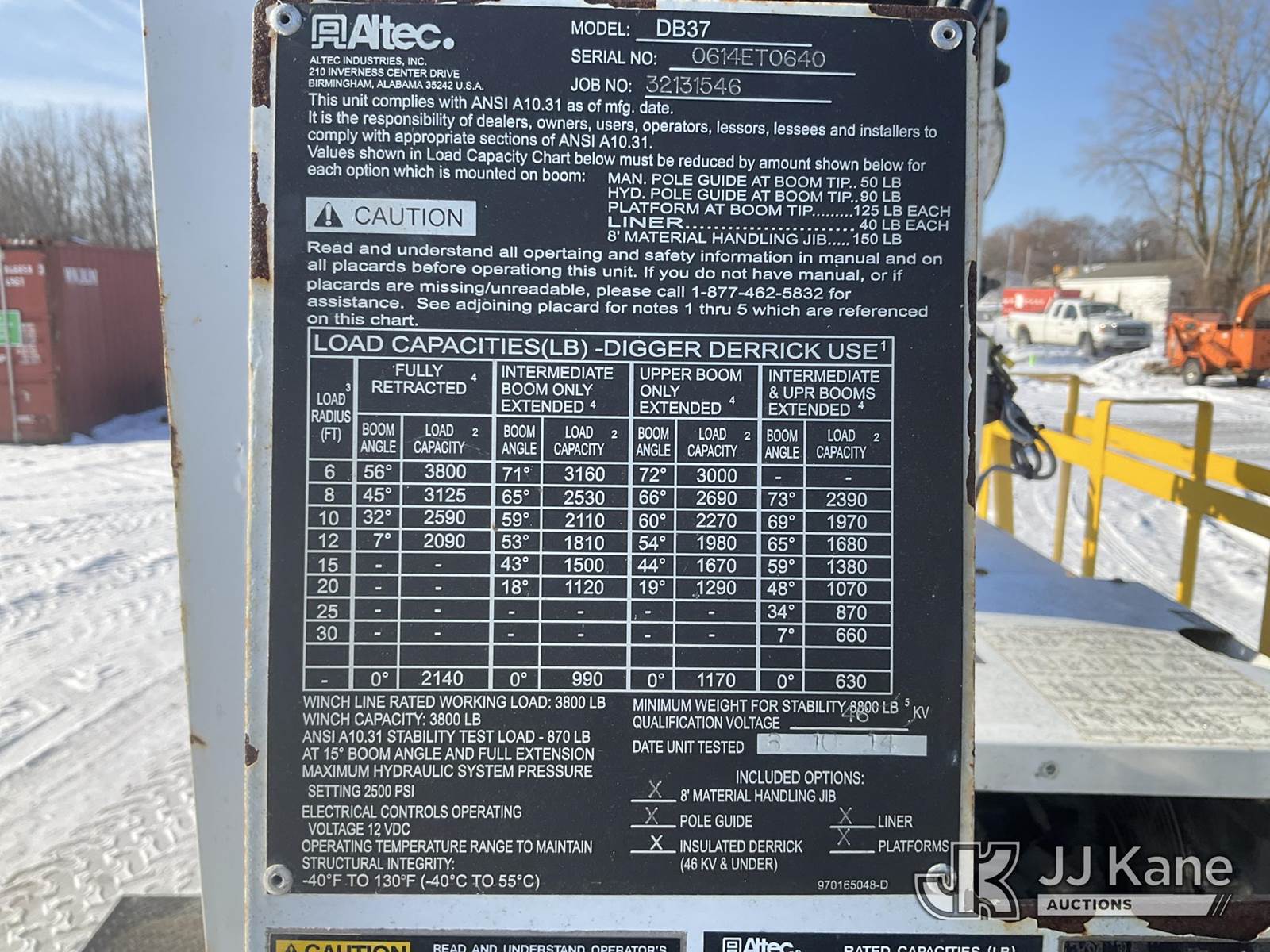Altec DB37, 3,800 Lb Back Yard Digger Derrick s/n 0614ET0640, with 37 ft. sheave height, 8 ft. pin on jib, three section hydraulic boom, heel winch, pole guides, auger, mounted on 2014 Altec Crawler Back Yard Carrier, Kubota Hydraulic Drive, diesel, with wireless remote (condition unknown), rubber tracks, four hydraulic outriggers, sells with support trailer ID 1569448 (Runs, Does Not Move, Upper Condition Unknown) (Red Tagged, Damage to Rotation Gear, Damage to Upper Boom, Jump to Start, Engine Cover Panels Missing) (**Dealer Only** Seller states this item has been removed from service due to the listed safety repairs that were not completed. The safety items below must be completed by an approved upper OEM facility before the unit can return to service: UNIT INVOLVED IN ROLLOVER INCIDENT; REQUIRES MAJOR UNIT DAMAGE INSPECTION; COMPLETE ANY REQUIRED TESTING AND REPAIRS AFTER INSPECTIONS ARE COMPLETED.) (Bidding Restricted to Licensed Vehicle Dealers Only), NOTE: This unit is being sold AS IS/WHERE IS via Timed Auction and is located in Charlotte, MI. Inspection & preview days for this unit are the 2 business days prior to the first day of items closing for this auction, item is located at 750 Island Hwy Charlotte, MI 48813 and hours of operations are 8a-4p. For pre-sale questions, please contact Corey Cook at (517) 983-0796 or corey.cook@jjkane.com (Manuals provided in cab) (Buyer is responsible for removal. Assistance by consignor or JJ Kane Auctions is not assured.)