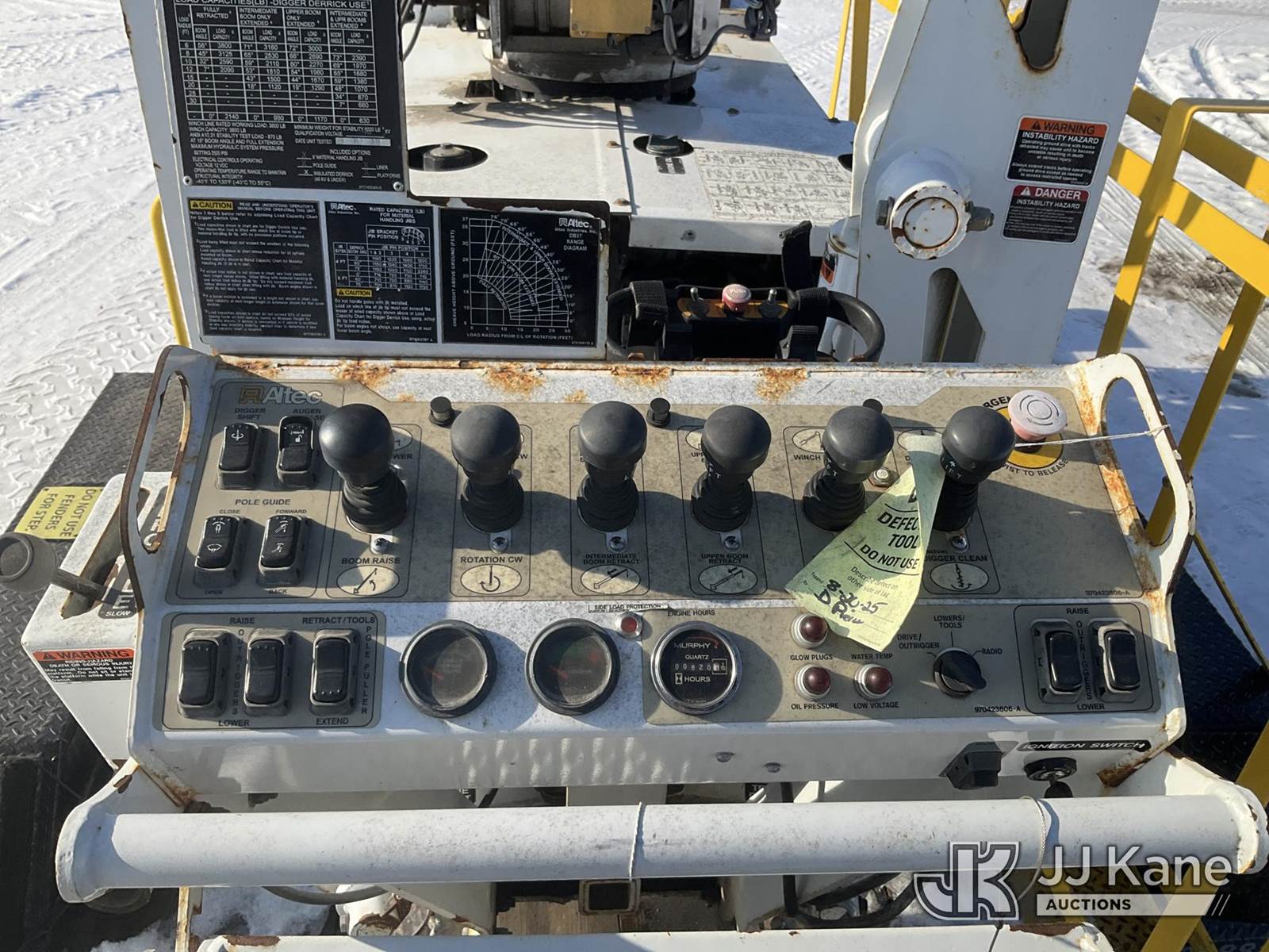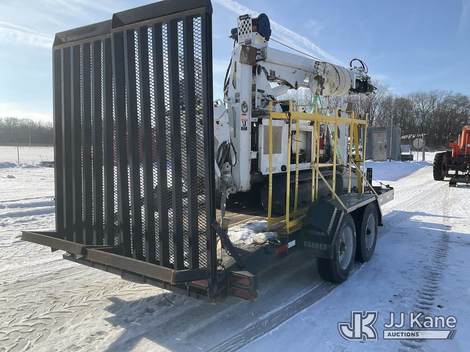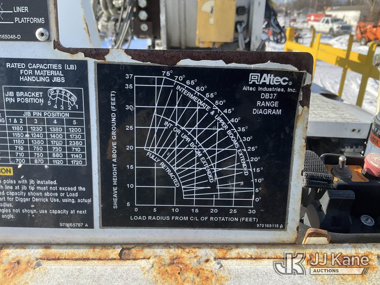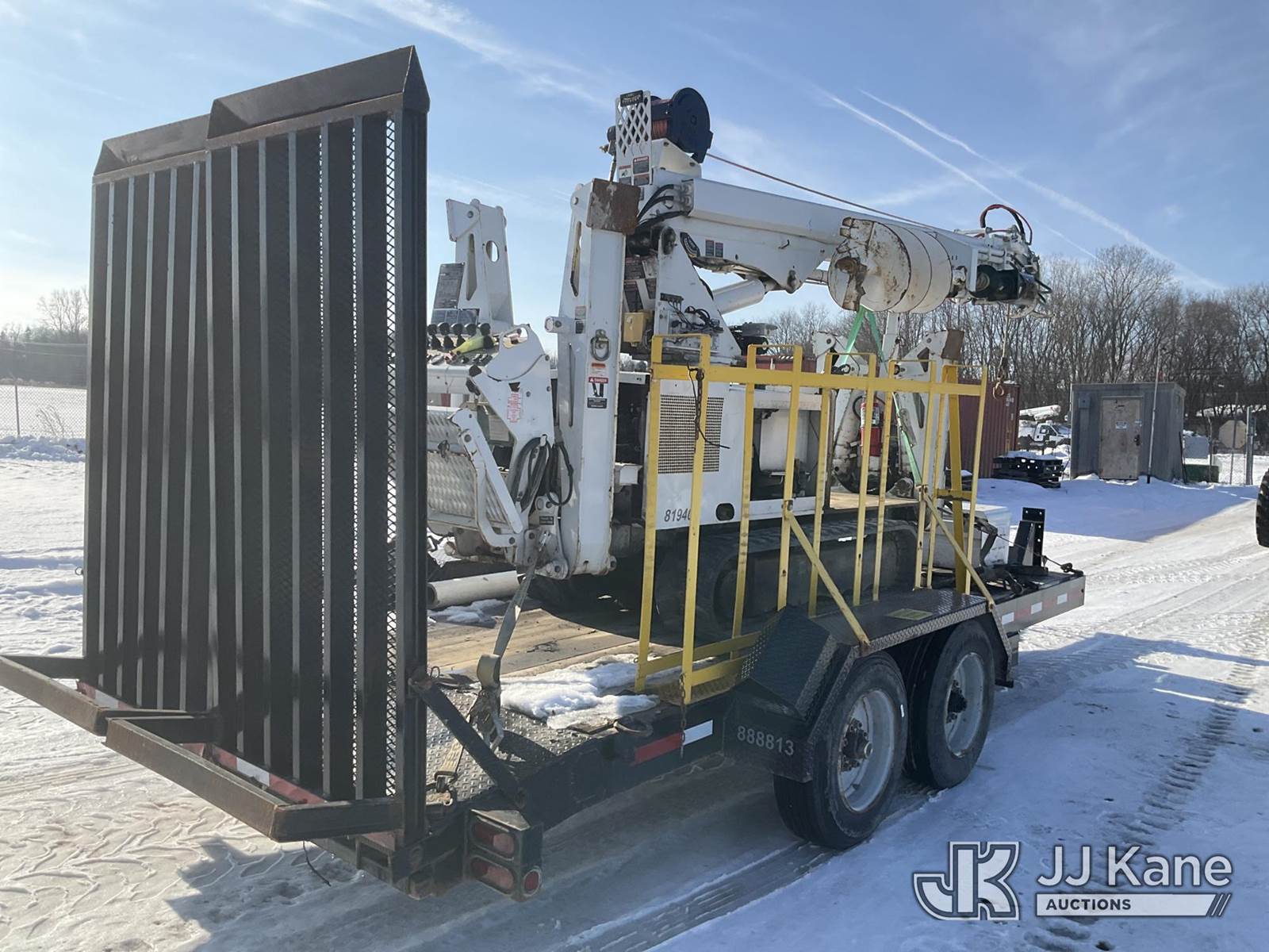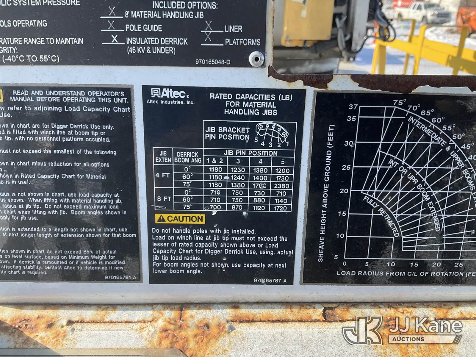 Altec DB37, 3,800 Lb Back Yard Digger Derrick s/n 0614ET0640, with 37 ft. sheave height, 8 ft. pin on jib, three section hydraulic boom, heel winch, pole guides, auger, mounted on 2014 Altec Crawler Back Yard Carrier, Kubota Hydraulic Drive, diesel, with wireless remote (condition unknown), rubber tracks, four hydraulic outriggers, sells with support trailer ID 1569448 (Runs, Does Not Move, Upper Condition Unknown) (Red Tagged, Damage to Rotation Gear, Damage to Upper Boom, Jump to Start, Engine Cover Panels Missing) (**Dealer Only** Seller states this item has been removed from service due to the listed safety repairs that were not completed. The safety items below must be completed by an approved upper OEM facility before the unit can return to service: UNIT INVOLVED IN ROLLOVER INCIDENT; REQUIRES MAJOR UNIT DAMAGE INSPECTION; COMPLETE ANY REQUIRED TESTING AND REPAIRS AFTER INSPECTIONS ARE COMPLETED.) (Bidding Restricted to Licensed Vehicle Dealers Only), NOTE: This unit is being sold AS IS/WHERE IS via Timed Auction and is located in Charlotte, MI. Inspection & preview days for this unit are the 2 business days prior to the first day of items closing for this auction, item is located at 750 Island Hwy Charlotte, MI 48813 and hours of operations are 8a-4p. For pre-sale questions, please contact Corey Cook at (517) 983-0796 or corey.cook@jjkane.com (Manuals provided in cab) (Buyer is responsible for removal. Assistance by consignor or JJ Kane Auctions is not assured.)