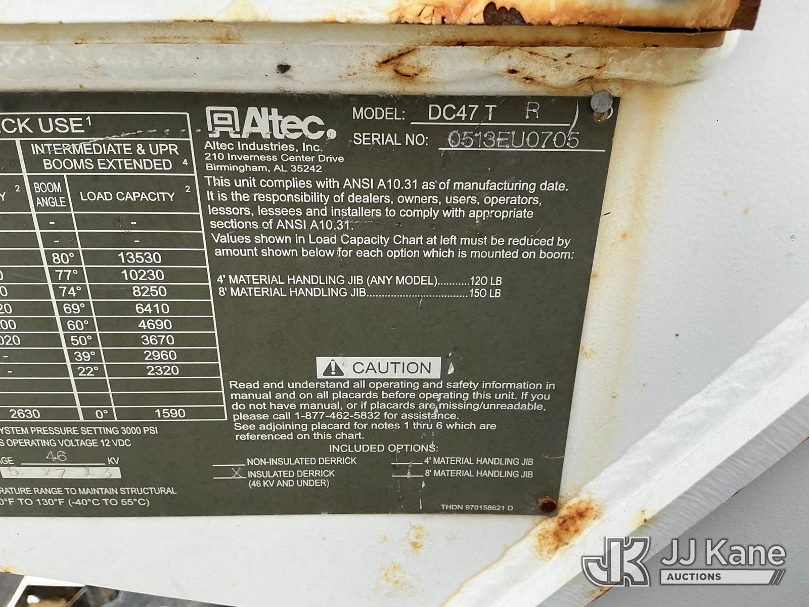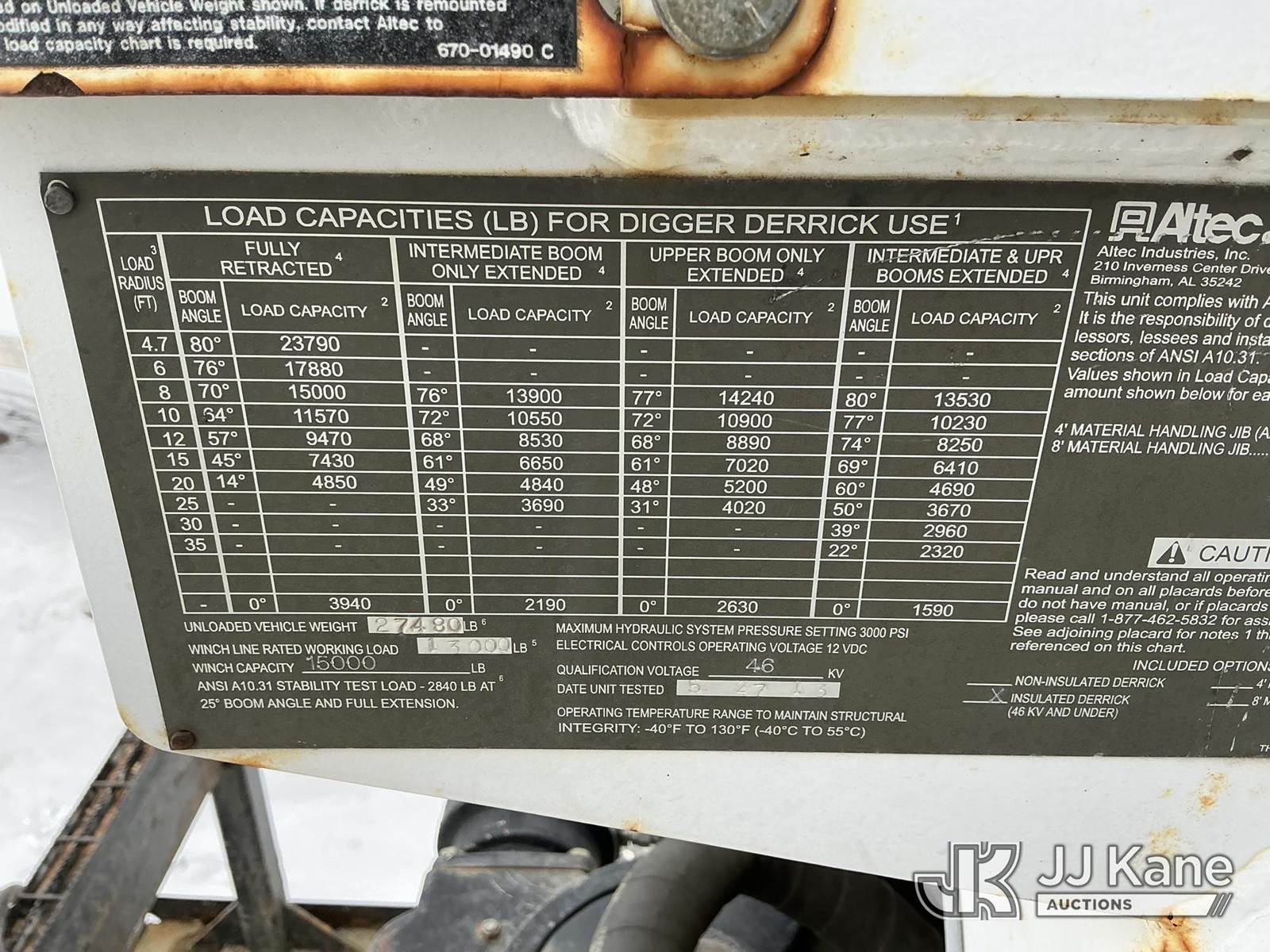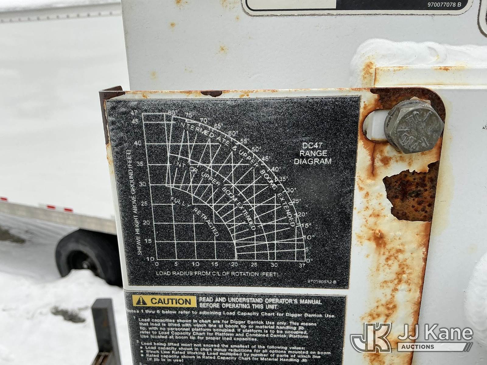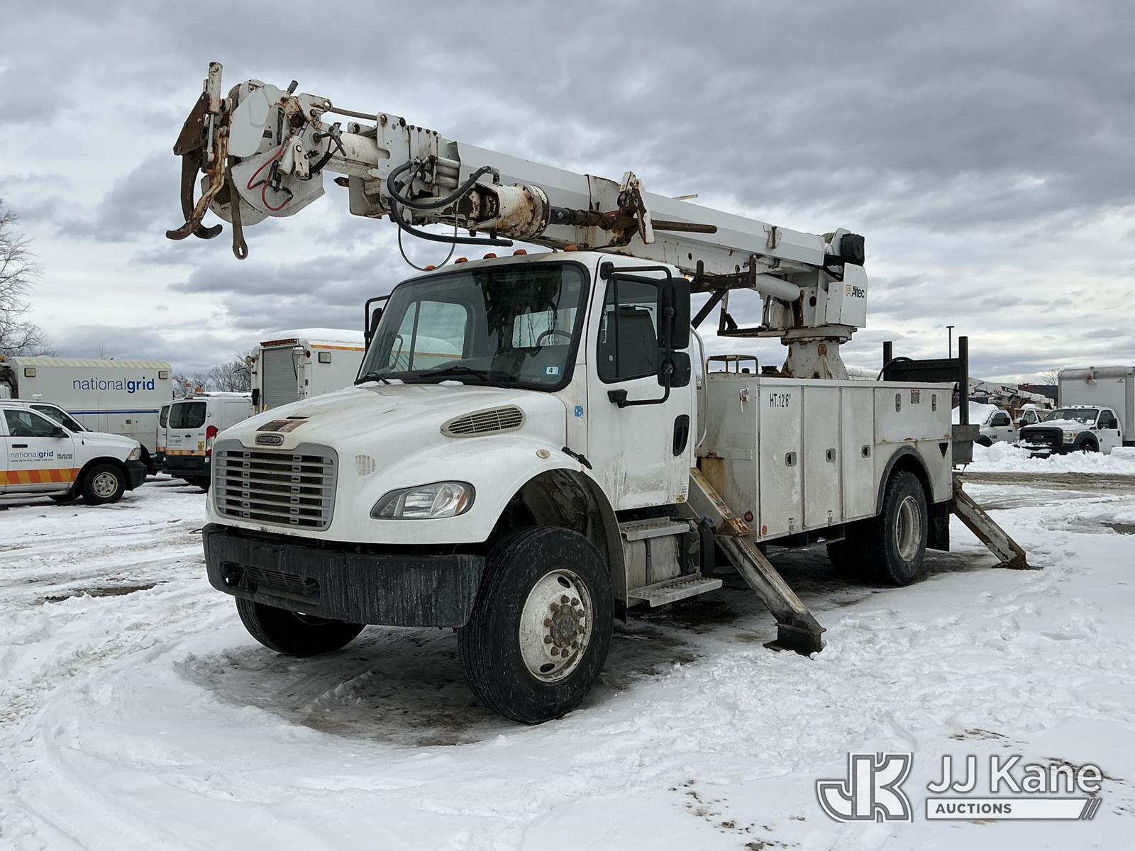 Altec DC47-TR, 23,790 Lb Digger Derrick s/n 0513EU0705, with 47 ft sheave height, 3-section hyd boom, 2 spd digger, heel winch, pole grabs, riding console & 4 hyd outriggers, rear mounted on 2014 Freightliner M2 106 4x4 Utility Truck, Cummins 6.7L diesel, Auto, A/C, (134,396 miles) (Runs & Outriggers Operates) (Does Not Move, No Response From Upper Controls, Upper Condition Unknown, Brake Air Leak, ABS Light On, Must Tow, Seller States: Rear End Issues) (Reads 9,239 hours) This is a Titled Item NOTE: This unit is being sold AS IS/WHERE IS via Timed Auction and is located in Shrewsbury, MA. Inspection & preview days for this unit are the 2 business days prior to the first day of items closing for this auction, item is located at 11 Fortune Blvd Shrewsbury, MA 01545 and hours of operations are 8a-4p. For pre-sale questions, please contact Rob Gifford @ (508) 864-4126. (Manuals provided in cab) (Buyer is responsible for removal. Assistance by consignor or JJ Kane Auctions is not assured.)