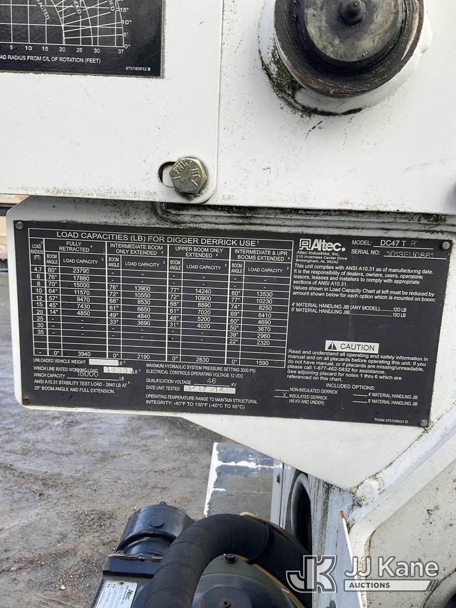 Altec DC47-TR, Digger Derrick s/n 1013EU0861, with 47ft sheave height, pole guides, heel winch & riding console, rear mounted on 2014 Freightliner M2 112 Utility Truck, 8.9L Auto, 4X2, LNG, A/C, (99,676 miles) (Runs & Moves) (PTO Will Not Engage, Check Engine Light On, Unit Is Out Of LNG And Will Need To Be Towed) This is a Titled Item NOTE: This unit is being sold AS IS/WHERE IS via Timed Auction and is located in Eatonville, WA. Inspection & preview days for this unit are by appointment only; please contact us at contact@jjkane.com or 84-Go-JJKane for more details. (Missing manuals, See Auction Company for Manufacturers Information to obtain manuals) (Buyer is responsible for removal. Assistance by consignor or JJ Kane Auctions is not assured.)