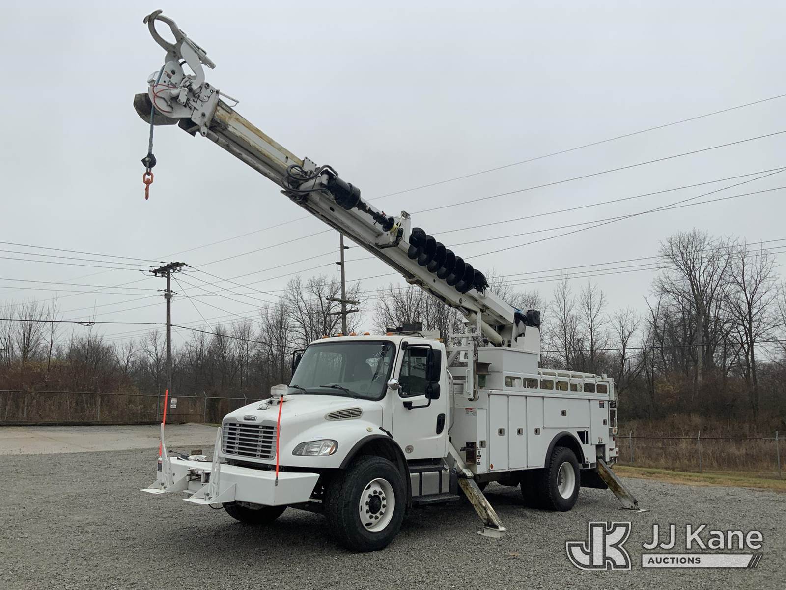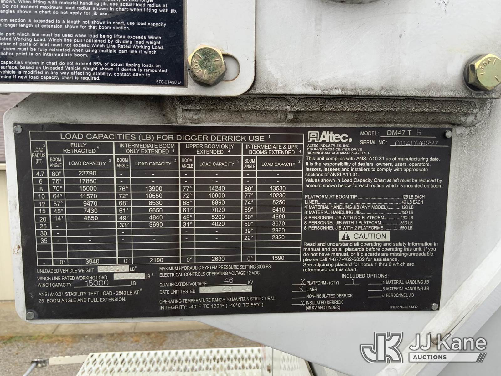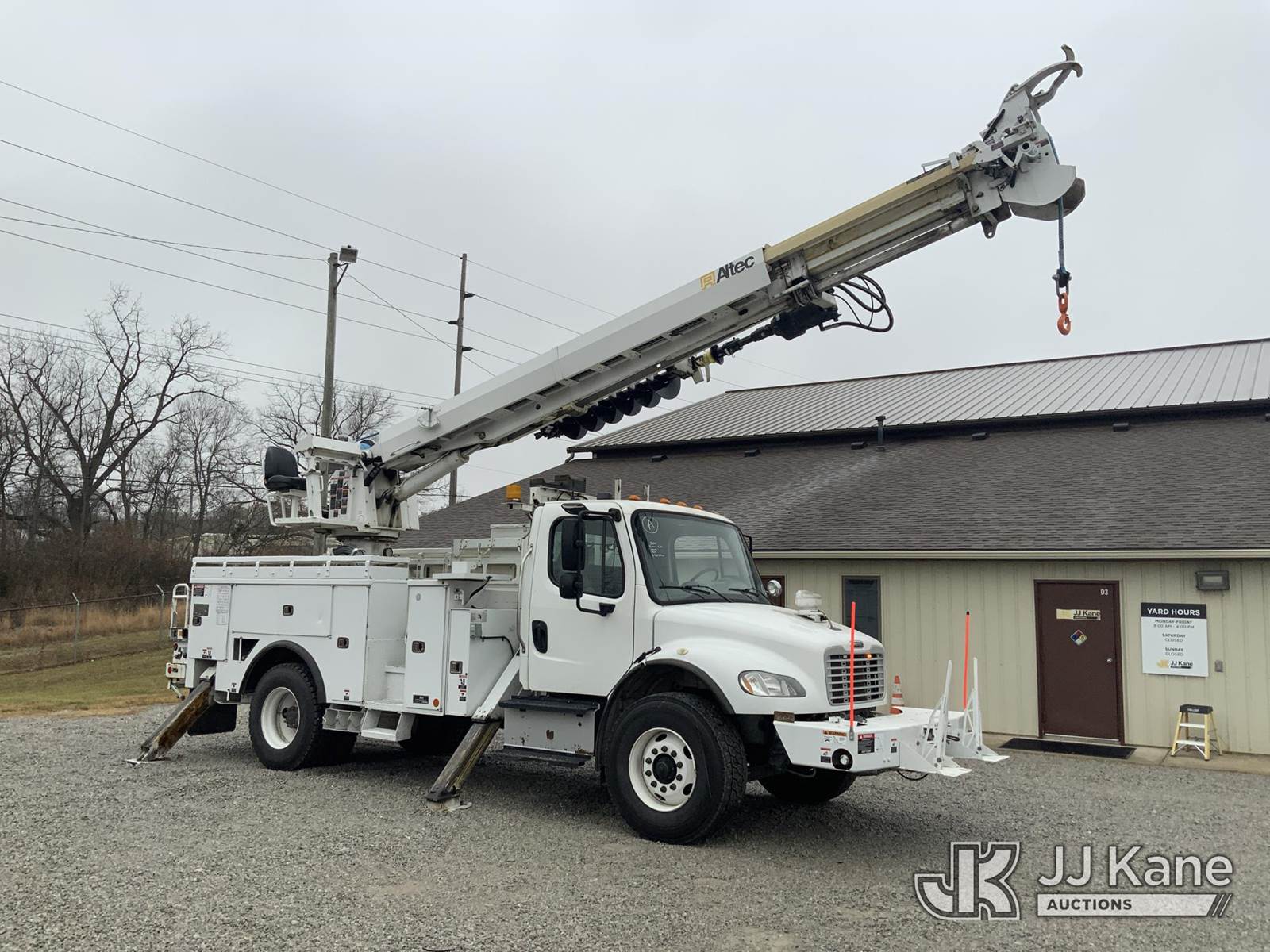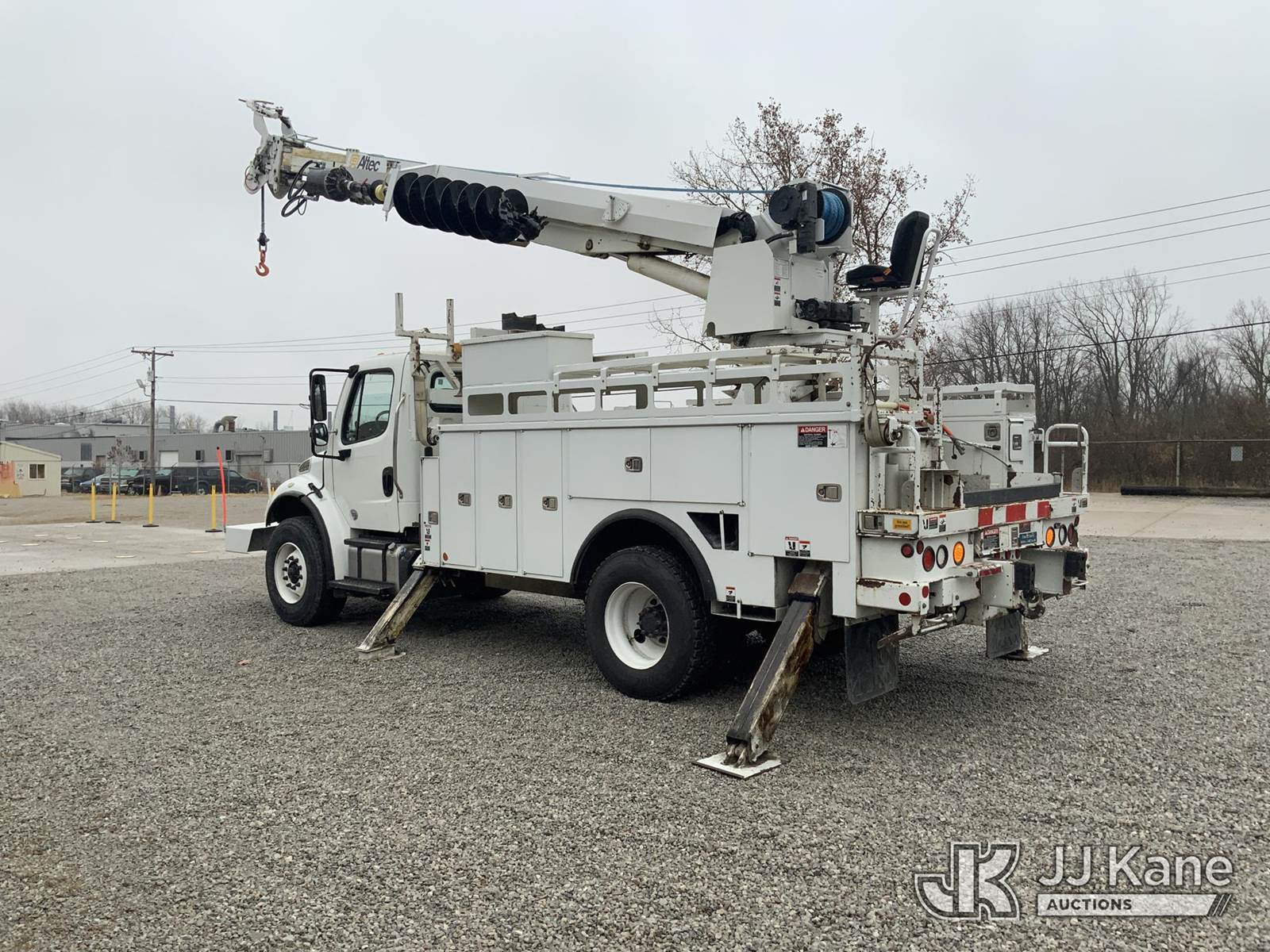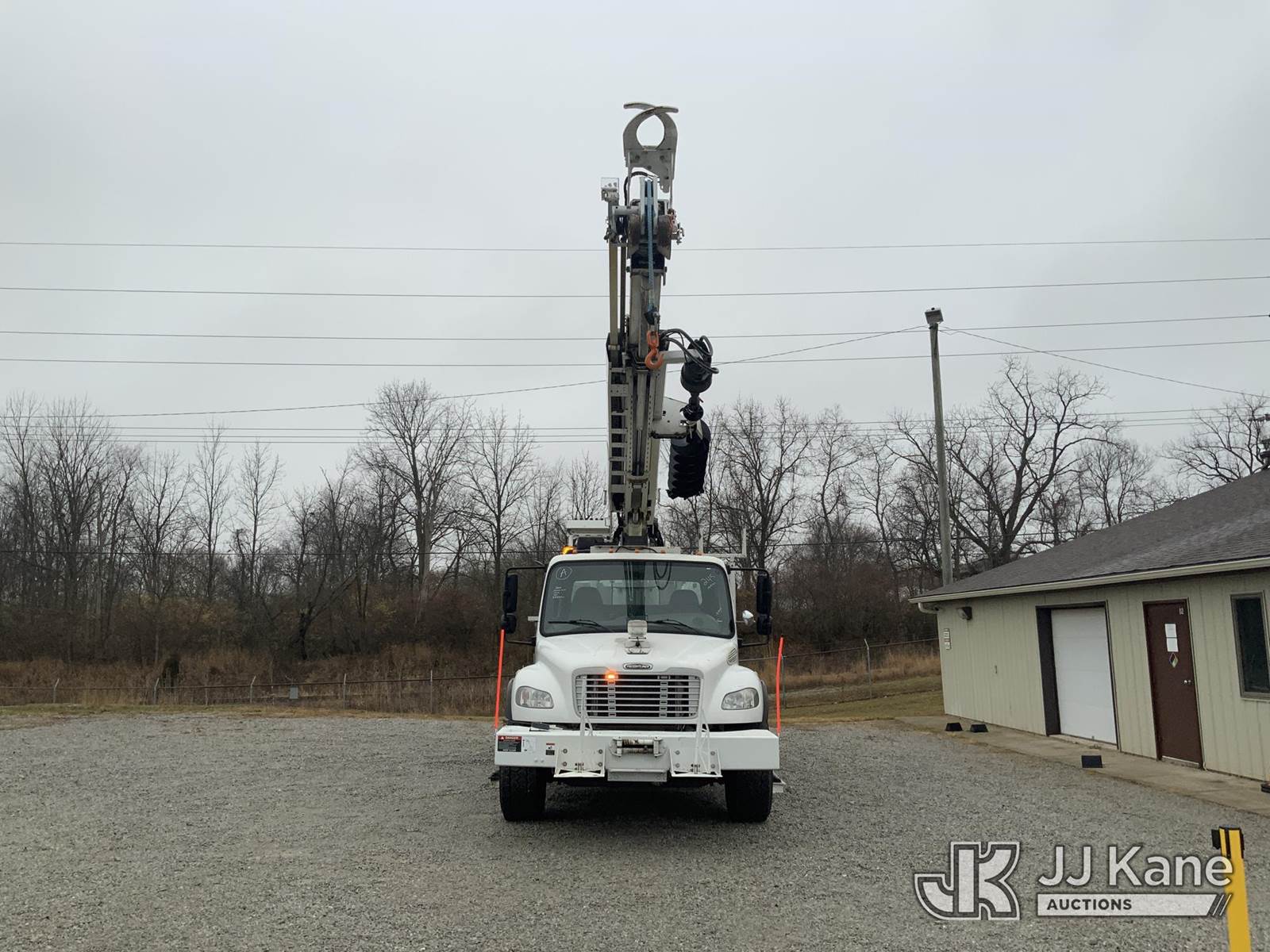 Altec DM47-TR, 23,790 Lb Digger Derrick s/n 0114DV6227, with 47 ft. sheave height, 3-stage hyd. boom, pole grabs, 2 spd. digger, heel winch & riding console, rear mounted on 2014 Freightliner M2 Medium Duty Utility Truck, 6.7L L6, diesel Auto, 4X2, A/C, with inverter, hyd. tool reel, capstan & front winch, (59,429 miles) (Runs, Moves & Upper Operates) (Reads 6,015 hours) This is a Titled Item NOTE: This unit is being sold AS IS/WHERE IS via Timed Auction and is located in Fort Wayne, IN. For more information & removal arrangements please contact Office Staff @ (260) 450-9822. Load out by appointment only, Buyer/Hauler must present copy of paid invoice upon arrival. Purchaser acknowledges ALL lots must be removed within (10) business days of Auction, or a storage fee may be incurred. For load out and pick up information, please reference the hauler sheet sent out after purchase. (Manuals provided in cab) (Buyer is responsible for removal. Assistance by consignor or JJ Kane Auctioneers is not assured.)