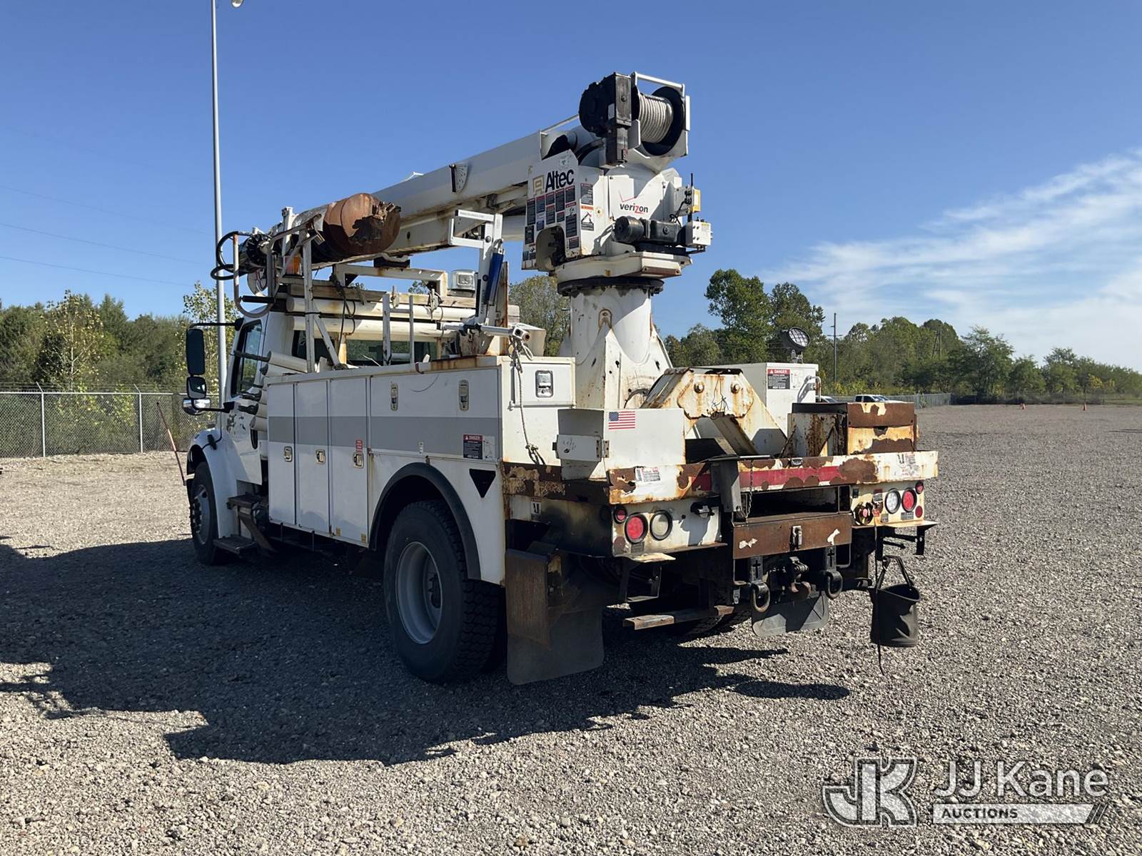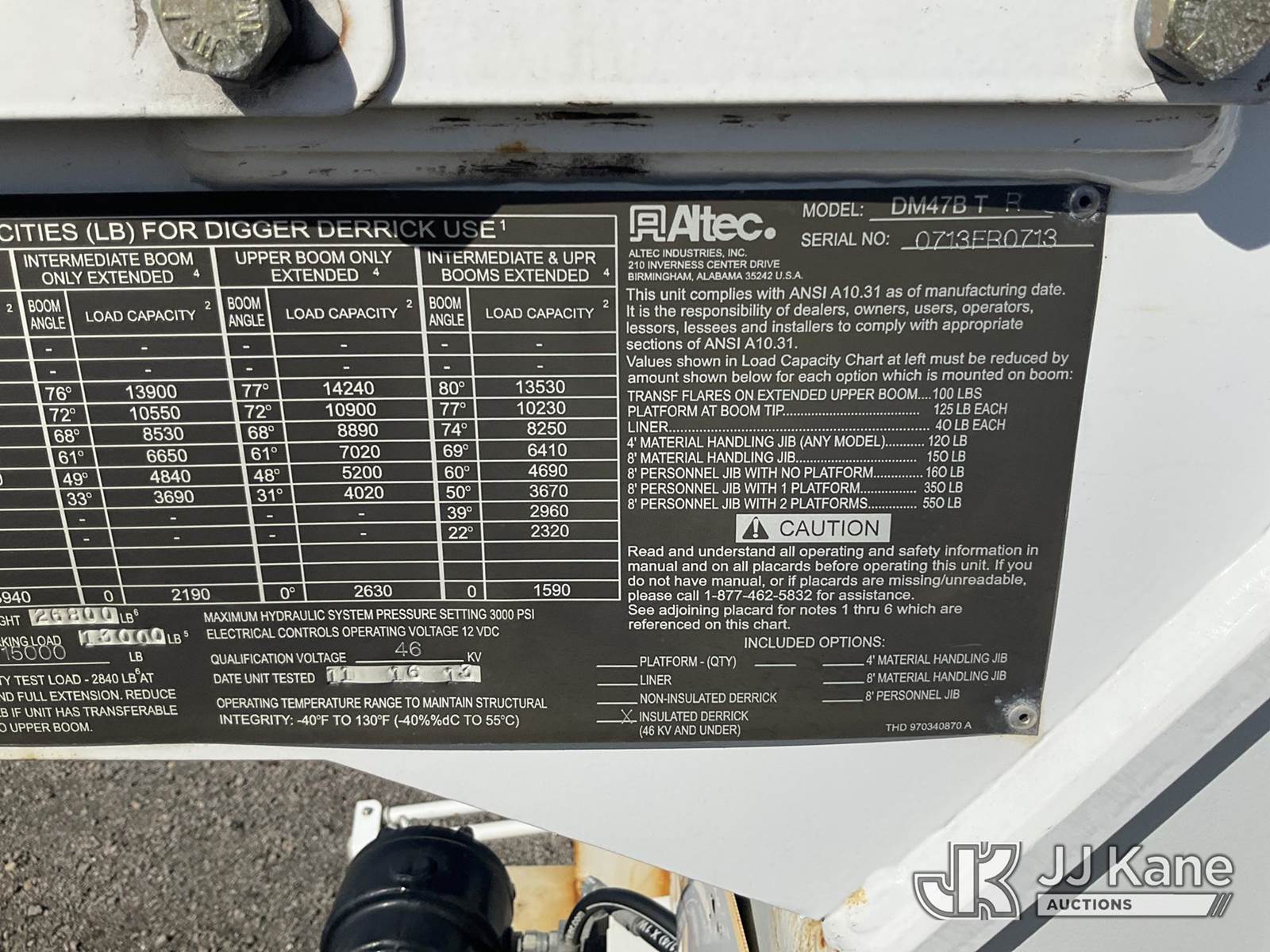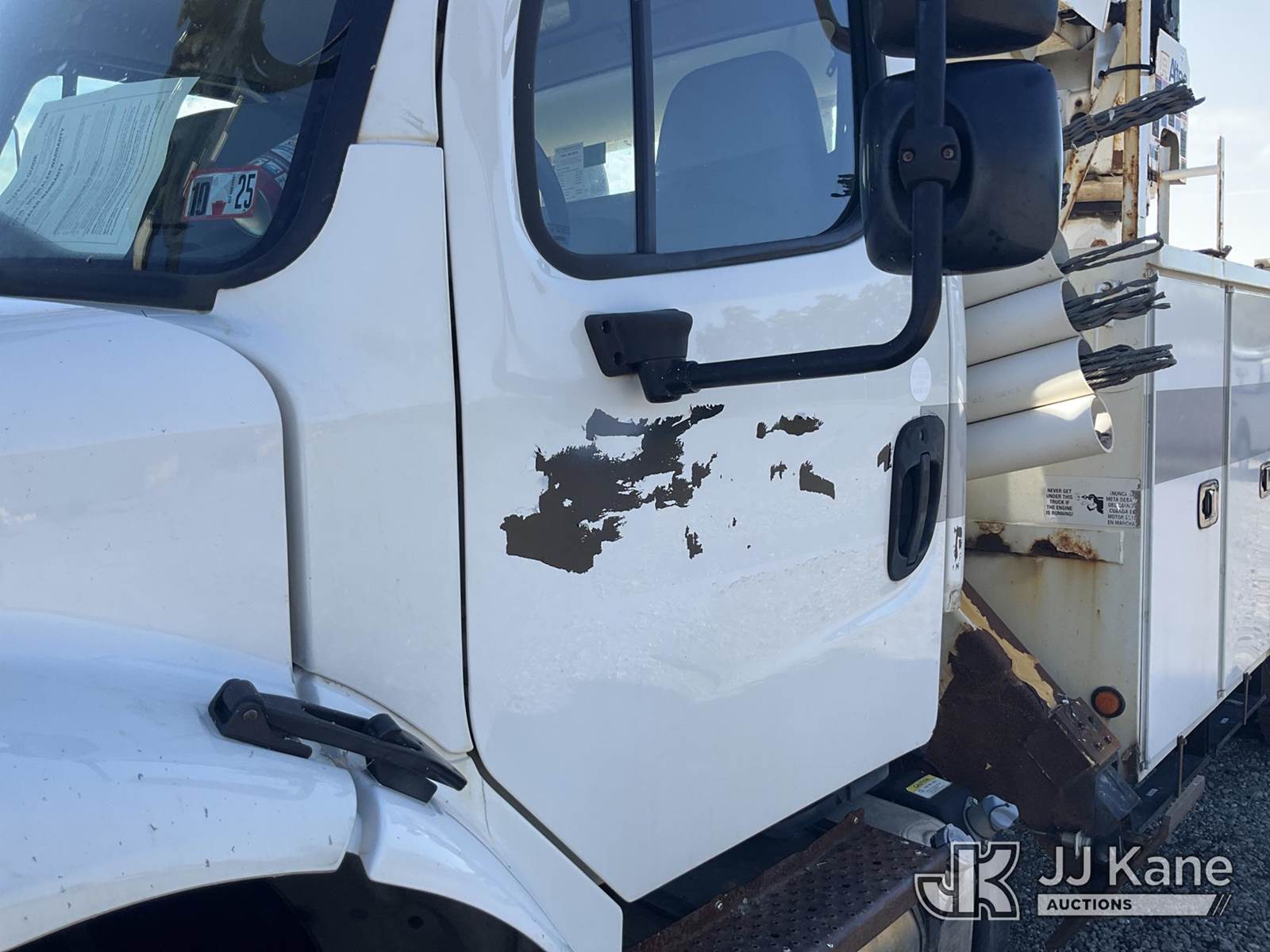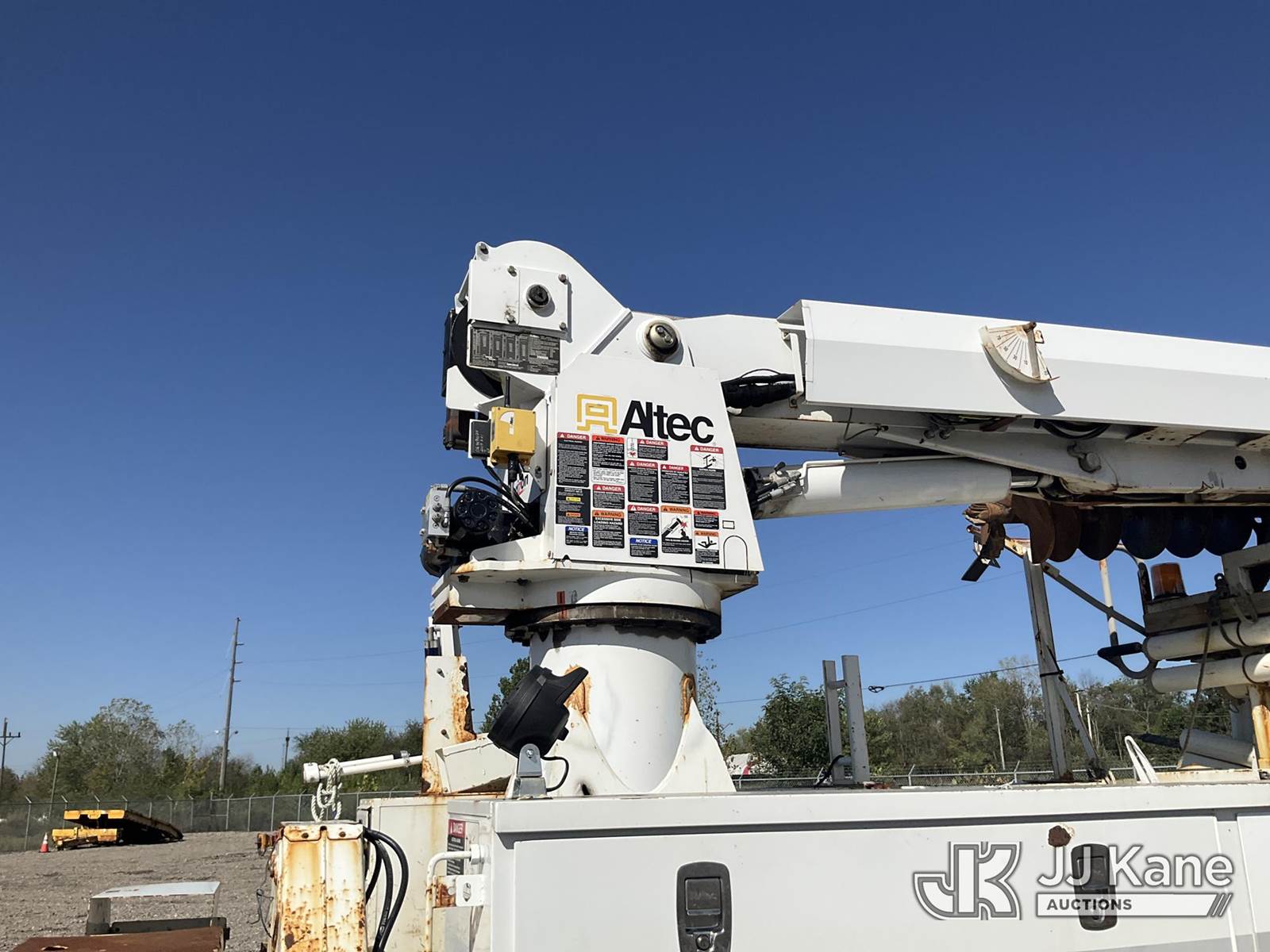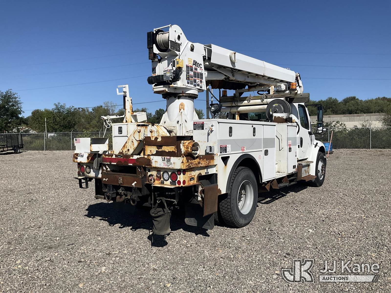 Altec DM47B-TR, Digger Derrick s/n 0713FR0713, with 47 ft. sheave height, 3 section hyd boom, 2 spd digger, heel winch, pole guides, stand up controls & 4 hyd outriggers, rear mounted on 2014 Freightliner M2 106 Utility Truck, 6.7L L6 diesel, Auto, 4X2, (117,537 miles) (Runs & Moves, Engine Light On, Check Engine Light On, Brake Light On, Air Brake Light On, PTO Issue, Upper Operation Unknown, Windshield Cracked, Paint & Rust Damage. seller Stats TOW REQUIRED AS UNIT HAS SAT FOR SOME TIME AND HAS PERFORMANCE / POWER ISSUES) This is a Titled Item NOTE: This unit is being sold AS IS/WHERE IS via Timed Auction and is located in Louisville, OH. Inspection & preview days for this unit are the 2 business days prior to the first day of items closing for this auction, item is located at 3648 Beck Ave Louisville, OH 44641 and hours of operations are 8a-4p. For pre-sale questions, please contact Aaron Coleman @ (330) 495-4041 or aaron.coleman@jjkane.com. (Manuals provided in cab) (Buyer is responsible for removal. Assistance by consignor or JJ Kane Auctioneers is not assured.)