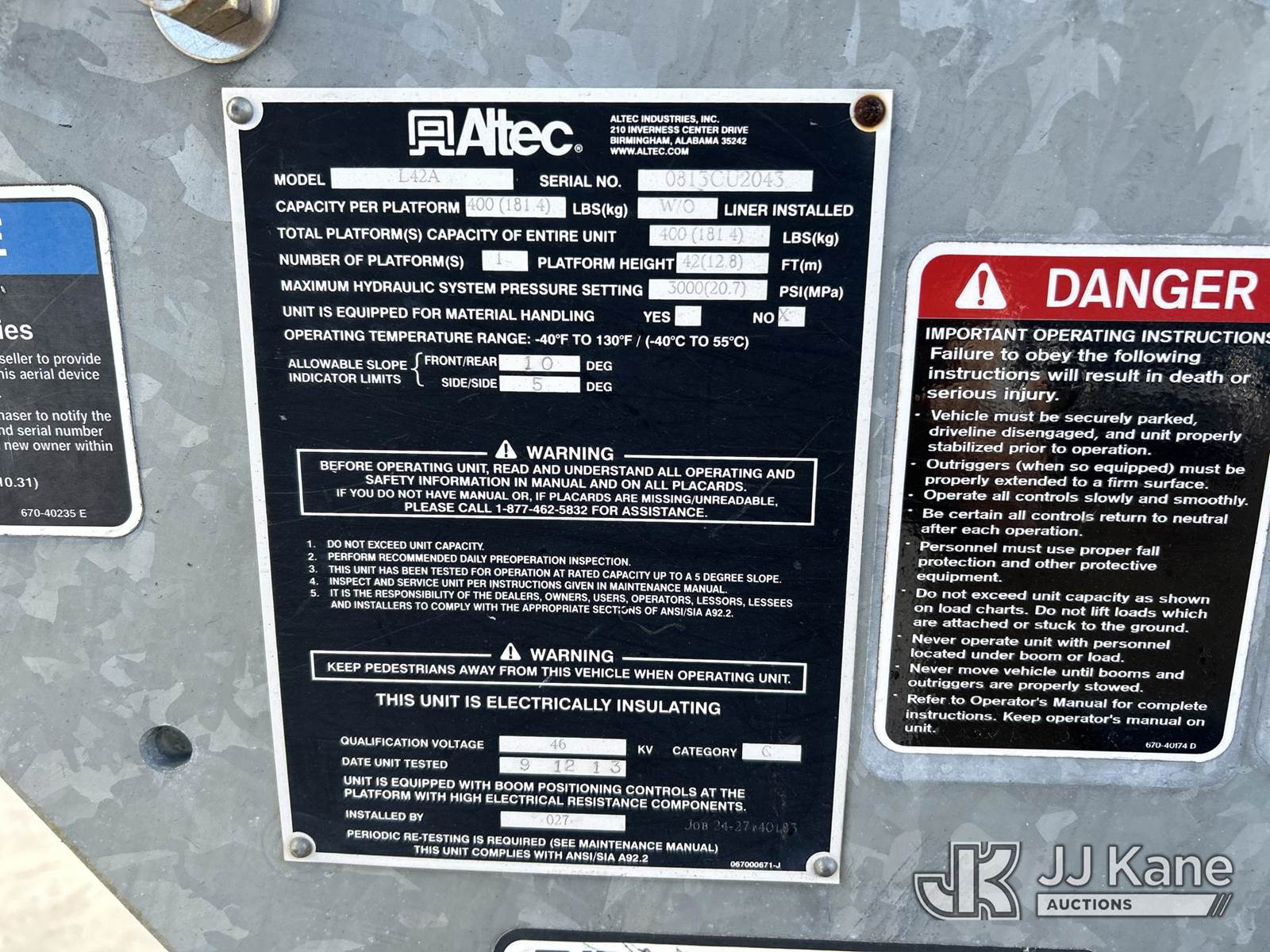 Altec L42A, 47 ft, Over-Center Bucket s/n 0813U2043, with single-man bucket, galvanized lower boom, rear mounted on 2014 International 7300 WorkStar 4x4 Utility Truck, Maxxforce DT diesel, Auto, A/C, (138,289 miles) (Runs, Moves & Upper Operates)( Engine Light On, Hydraulic Leak, Paint/Body Damage)(FL Residents Purchasing Titled Items - tax, title & registration fees will be collected at the maximum rate of $400.00 under 25,999 and $800.00 for Over 26,000 and $250.00 trailers - Proof of insurance is mandatory; Out of State Residents Purchasing Title Items - tax will be collected based upon your state rate.) This is a Titled Item NOTE: This unit is being sold AS IS/WHERE IS via Timed Auction and is located in Riviera Beach, FL. An inspection day for FPL auction items will be conducted on the Friday before the auction from 8a-3p at 2455 Port West Boulevard, Riviera Beach, FL 33407. Winning Buyer/Hauler must present copy of paid invoice upon arrival to pick up. For load out and pick up information, please reference the release form sent out after purchase. Any more information please call Andy Garcia @ 561-215-0085. (Manuals provided in cab) Sales Tax Collected Based on Residency (Buyer is responsible for removal. Assistance by consignor or JJ Kane Auctions is not assured.)
