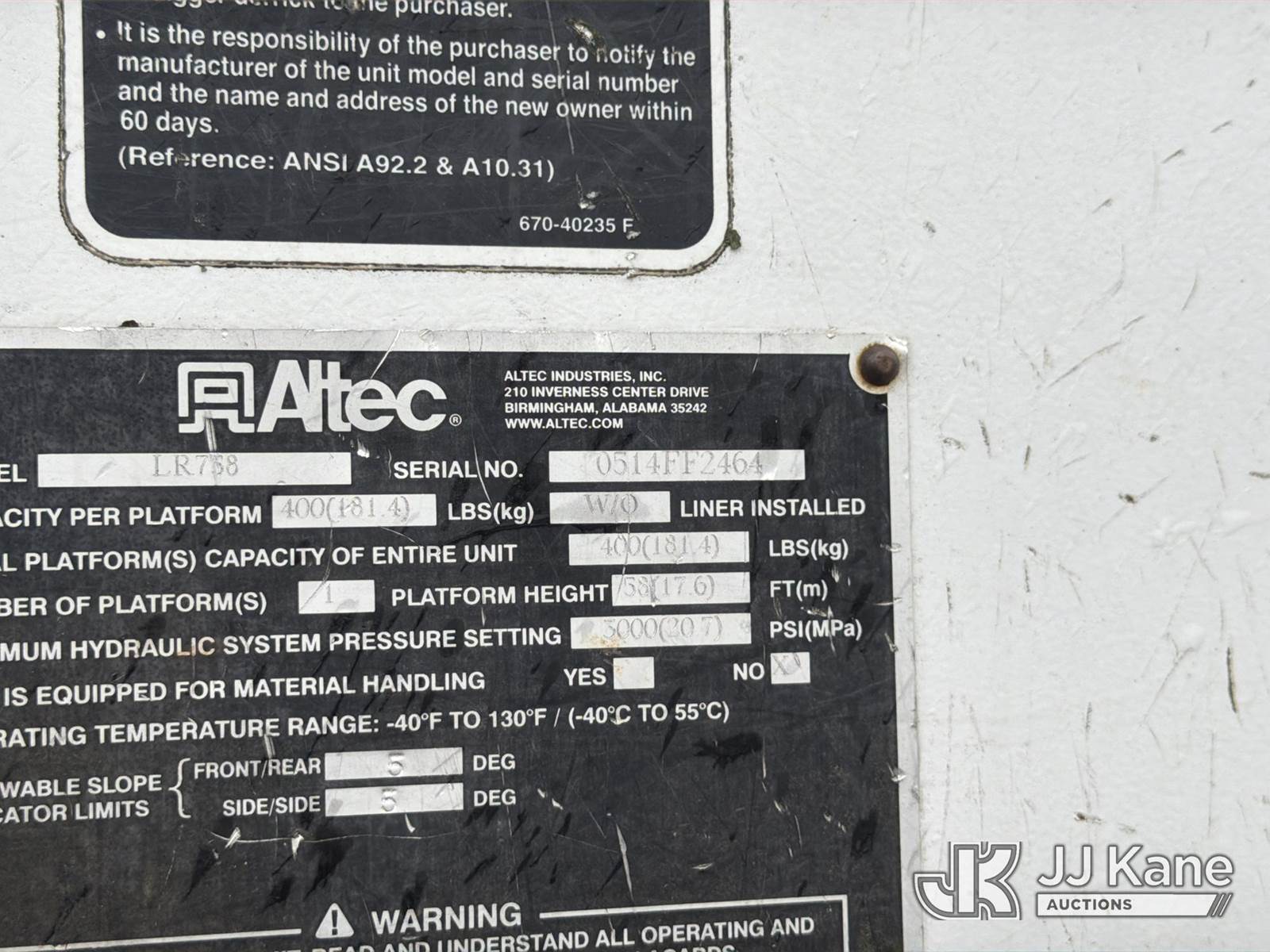 Altec LR758, 63 ft, Over-Center Bucket Truck s/n 0514FF2464, with single-man bucket , rear mounted on 2014 Freightliner M2 106 4X4 Flatbed Truck, Cummins 6.7L diesel, 6-spd, A/C, with front winch, rear winch & flotation tires , (30,151 miles) (Runs, Moves & Upper Operates) (Check Engine Light On) This is a Titled Item NOTE: This unit is being sold AS IS/WHERE IS via Timed Auction and is located in Chester, VA. Inspection & preview days for this unit are the 2 business days prior to the first day of items closing for this auction, item is located at 13301 Great Coastal Dr Chester, VA 23836 and hours of operations are 8a-3p. For pre-sale questions, please contact Doug Caton @ 804-807-4574. (Manuals provided in cab) (Buyer is responsible for removal. Assistance by consignor or JJ Kane Auctions is not assured.)