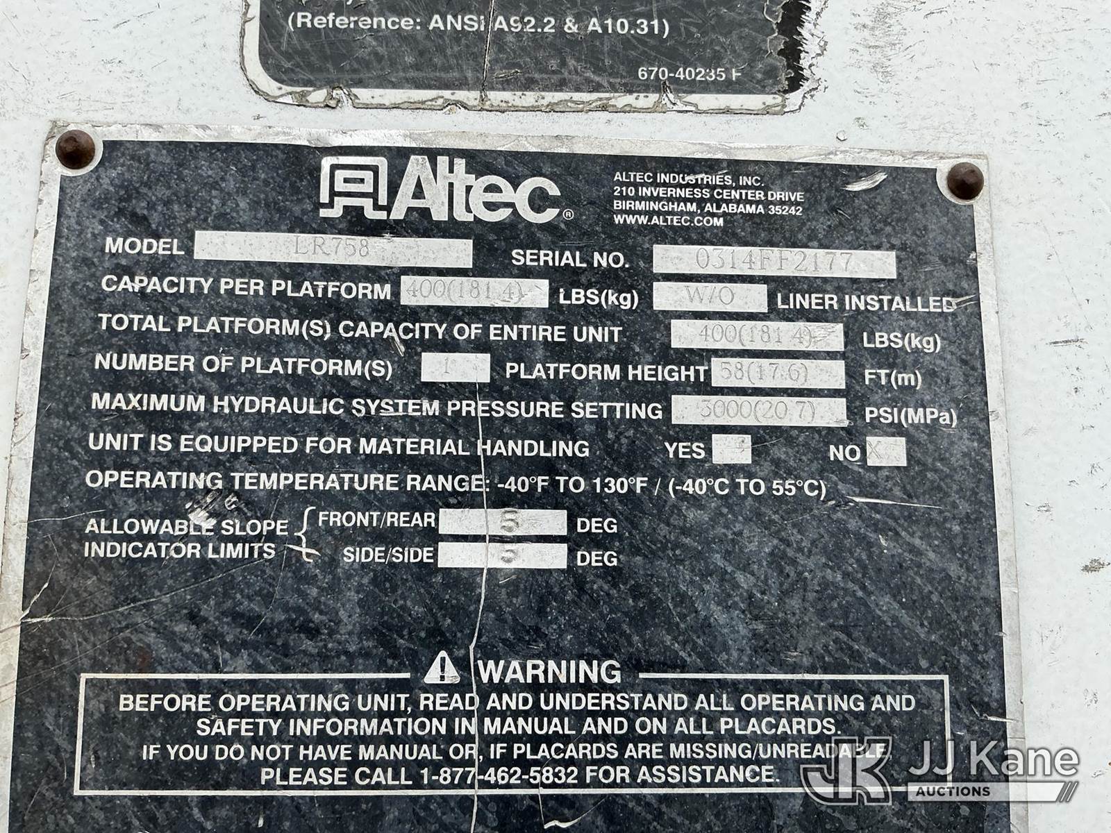 Altec LR758, 63 ft, Over-Center Bucket Truck s/n 0314FF2177, with single man bucket, rear mounted on 2014 Freightliner M2 106 Flatbed/Utility Truck, 6.7L diesel, 4X2, 6-spd, A/C, with front winch, (70,174 miles) (Runs, Moves, Upper Operates)(EXEMPT FROM ODODOMETER READING) (Stop Engine Light On, Check Engine Light On, Engine Noise) (Seller States: Needs Turbo, DPF Filter, & Maybe Doser) (Reads 5,957 hours) This is a Titled Item NOTE: This unit is being sold AS IS/WHERE IS via Timed Auction and is located in Thonotosassa, FL. Inspection & preview days for this unit are the 2 business days prior to the first day of items closing for this auction, item is located at 11720 N US 301 Thonotosassa, Fl 33592 and hours of operations are 8a-4p. For pre-sale questions, please contact Office Staff @ (813) 986-2485. (Manuals provided in cab) (Buyer is responsible for removal. Assistance by consignor or JJ Kane Auctions is not assured.)