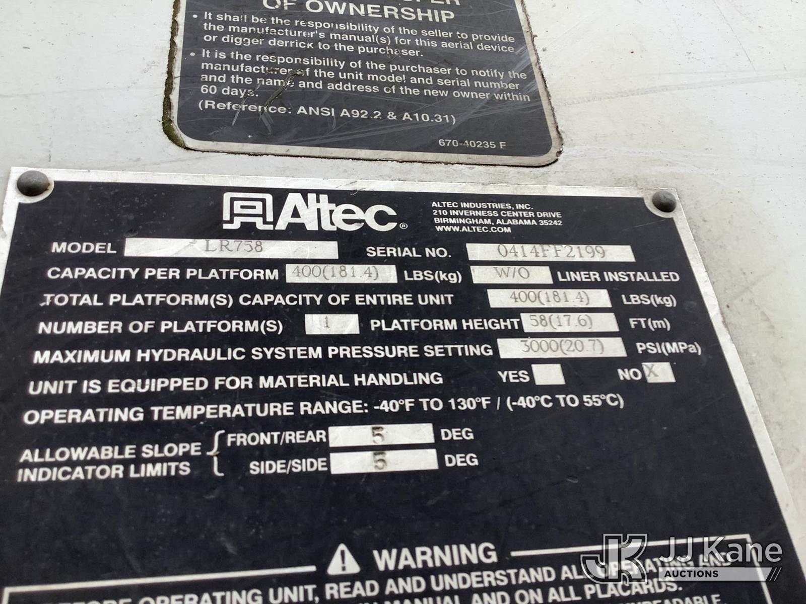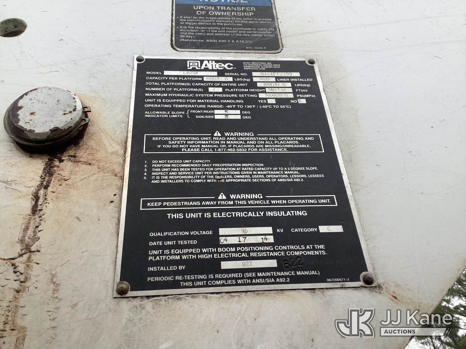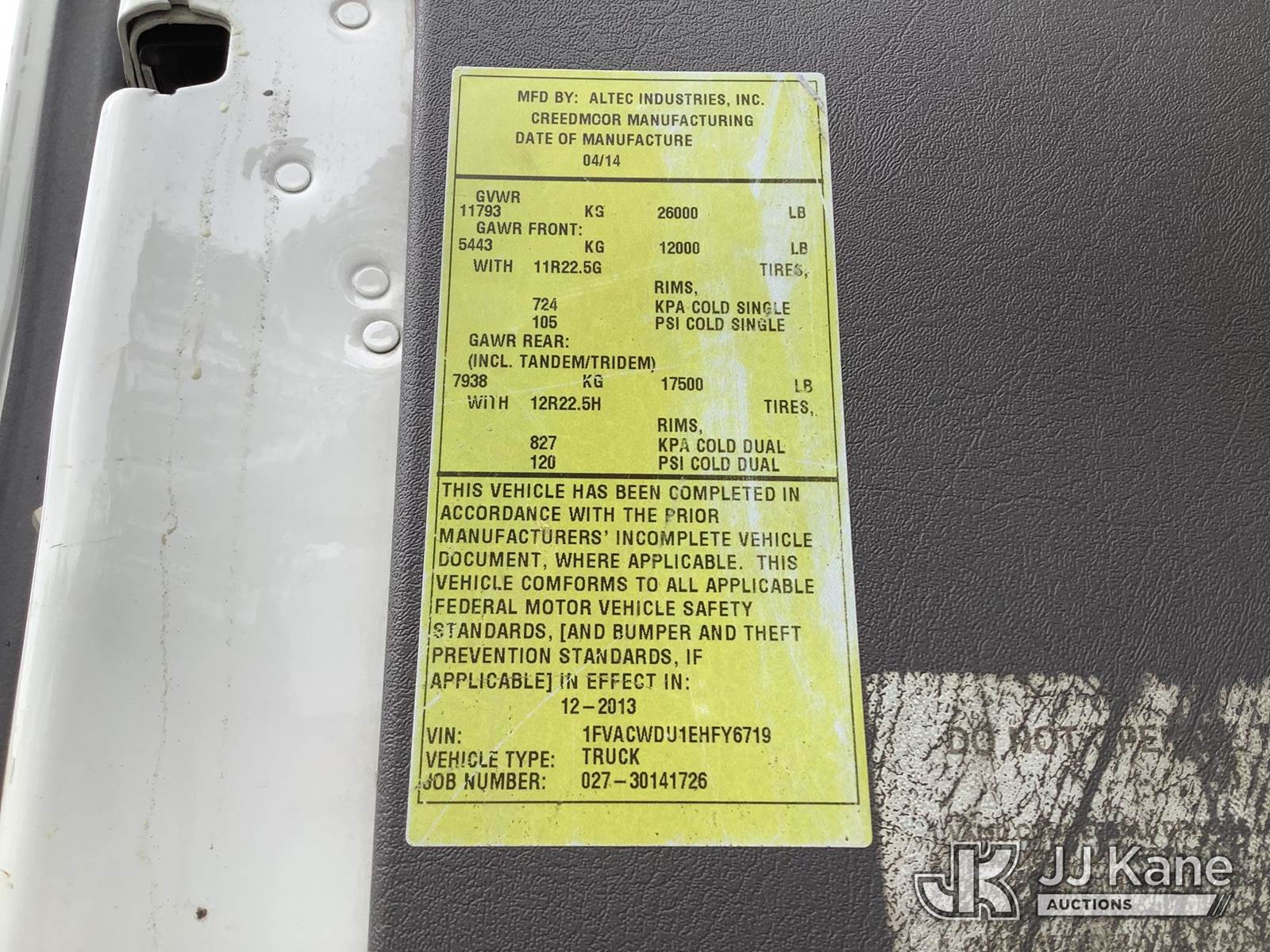 Altec LR758RM, 63 ft, Over-Center Bucket Truck s/n 0414FF2199, with single-man bucket & 4 hyd outriggers, rear mounted on 2014 Freightliner M2 106 Flatbed Truck, 6.7L L6 diesel, 6-spd, 4X2, (105,805 miles) (Runs & Moves) (Key Broken Off In Ignition, Upper Not Operating, Condition Unknown, Check Engine Light On, ABS Light On, PTO Engages, Bad Selector Switch) This is a Titled Item NOTE: This unit is being sold AS IS/WHERE IS via Timed Auction and is located in Graysville, AL. Inspection & preview days for this unit are by appointment only; please contact us at contact@jjkane.com or 84-Go-JJKane for more details. Alabama Auctioneer Michael Whitebread - License # 5592 (Missing manuals, See Auction Company for Manufacturers Information to obtain manuals) (Buyer is responsible for removal. Assistance by consignor or JJ Kane Auctions is not assured.)