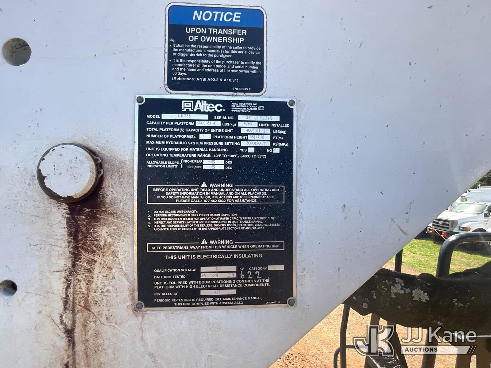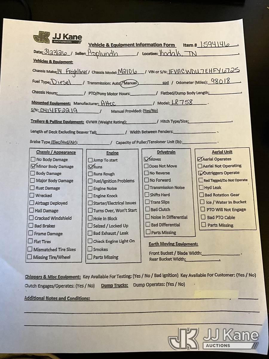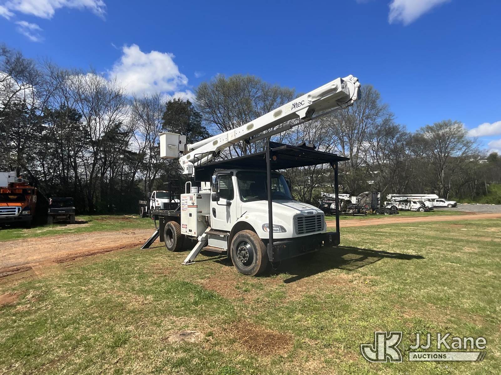 Altec LR758RM, 63 ft, Over-Center Bucket Truck s/n 0414FF2219, with Single-Man Bucket, 4 Hydraulic Outriggers, rear mounted on 2014 Freightliner M2 106 Flatbed/Service Truck, 6.7L Diesel 4X2, manual, A/C, (098,018 miles) (Runs, Moves & Upper Operates) (Minor Body Damage, Outriggers Operate) This is a Titled Item NOTE: This unit is being sold AS IS/WHERE IS via Timed Auction and is located in Kodak, TN. Inspection & preview days for this unit are by appointment only; please contact us at contact@jjkane.com or 84-Go-JJKane for more details. (Missing manuals, See Auction Company for Manufacturers Information to obtain manuals) (Buyer is responsible for removal. Assistance by consignor or JJ Kane Auctions is not assured.)