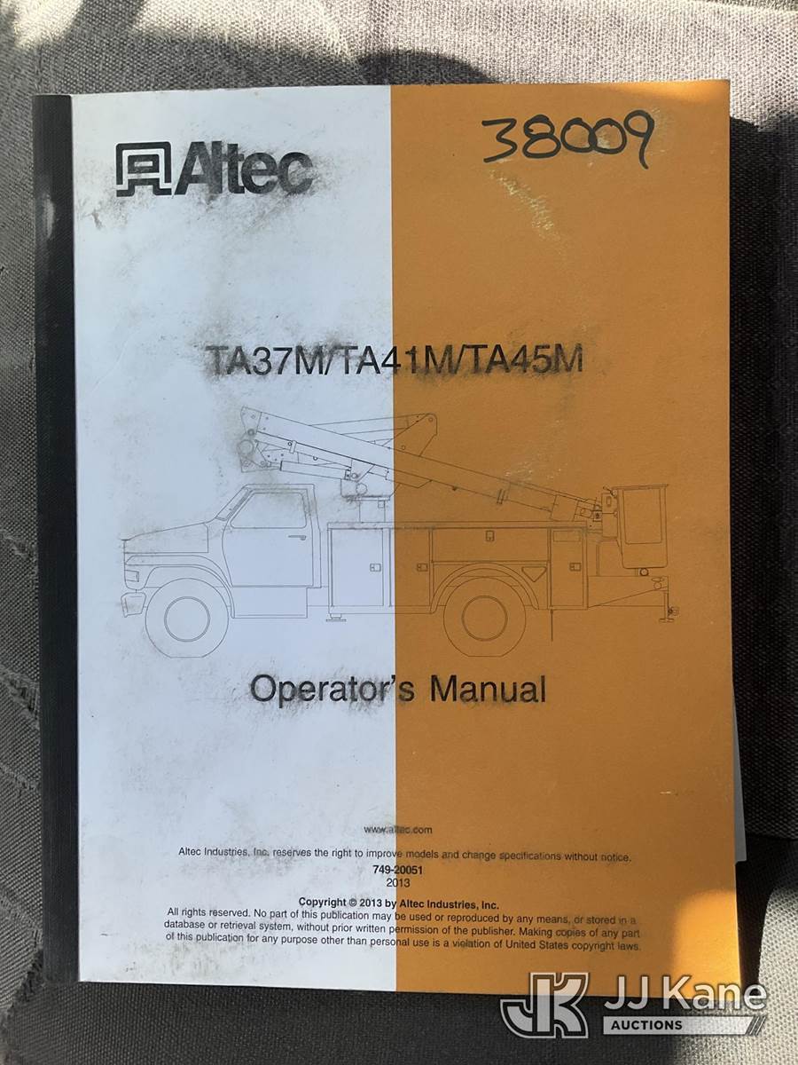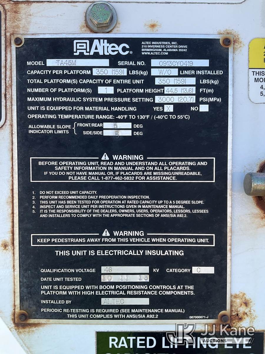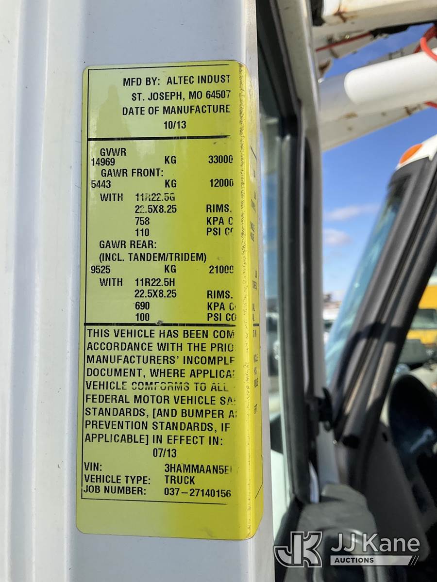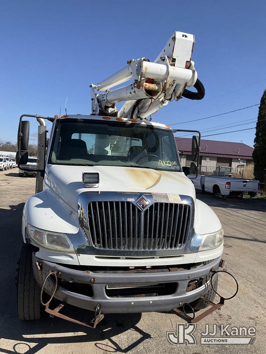 Altec TA45M, 49 ft, Articulating & Telescopic Material Handling Bucket Truck s/n 0913CY0419, with single-man bucket, mounted behind cab on 2014 International DuraStar 4300 Utility Truck, 7.6L diesel, 4X2, Auto, A/C, (239,741 miles) (Not Running, Condition Unknown) (The manufacturer has notified JJ Kane that this equipment is subject to an open recall. CSN 643 TA Winch Brake Inspection The equipment should not be operated until this is addressed. Buyer is responsible for reviewing the recall notice and contacting the manufacturer to schedule the recommended corrective actions. Associated costs may be covered by the manufacturer in some cases.) (Reads 11,289 hours) This is a Titled Item NOTE: This unit is being sold AS IS/WHERE IS via Timed Auction and is located in South Beloit, IL. Inspection & preview days for this unit are the 2 business days prior to the first day of items closing for this auction, item is located at 14354 Dearborn Ave South Beloit, IL and hours of operations are 8a-4p. For pre-sale questions, please contact Derek Eklund at (608) 904-0618 or (derek.eklund@jjkane.com). (Manuals provided in cab) (Buyer is responsible for removal. Assistance by consignor or JJ Kane Auctions is not assured.)