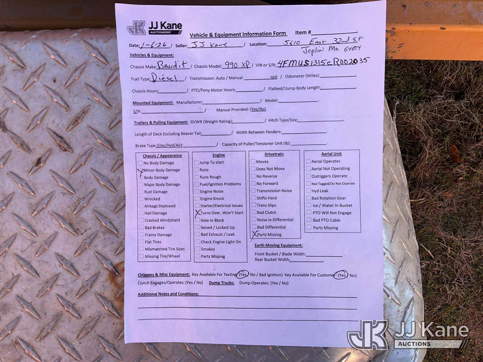 2014 Bandit 990XP Chipper (12in Drum), s/n 4FUS1315ER002035, Perkins diesel, (Cranks Over) (Will Not Start, Missing Parts) NOTE: This unit is being sold AS IS/WHERE IS via Timed Auction and is located in Joplin, MO. Inspection & preview days for this unit are by appointment only; please contact us at contact@jjkane.com or 84-Go-JJKane for more details. (Buyer is responsible for removal. Assistance by consignor or JJ Kane Auctions is not assured.)