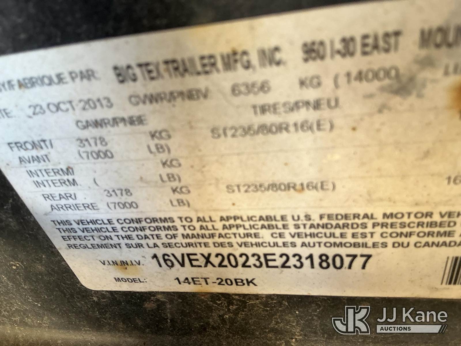 2014 Big Tex 14ET-20BK T/A Tagalong Equipment Trailer, with 14ft, (Seller States: Cracked Frame) This is a Titled Item NOTE: This unit is being sold AS IS/WHERE IS via Timed Auction and is located in Fort Lupton, CO. Inspection & preview days for this unit are the 2 business days prior to the first day of items closing for this auction, item is located at 2105 Northland Dr Fort Lupton, CO 80621 and hours of operations are 8a-4p. For pre-sale questions, please contact Dakota Hoffman @ (720) 621-0786. Dealer License Number 47109. (Buyer is responsible for removal. Assistance by consignor or JJ Kane Auctioneers is not assured.)