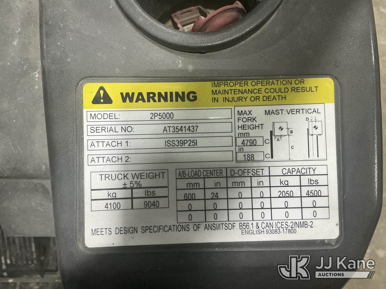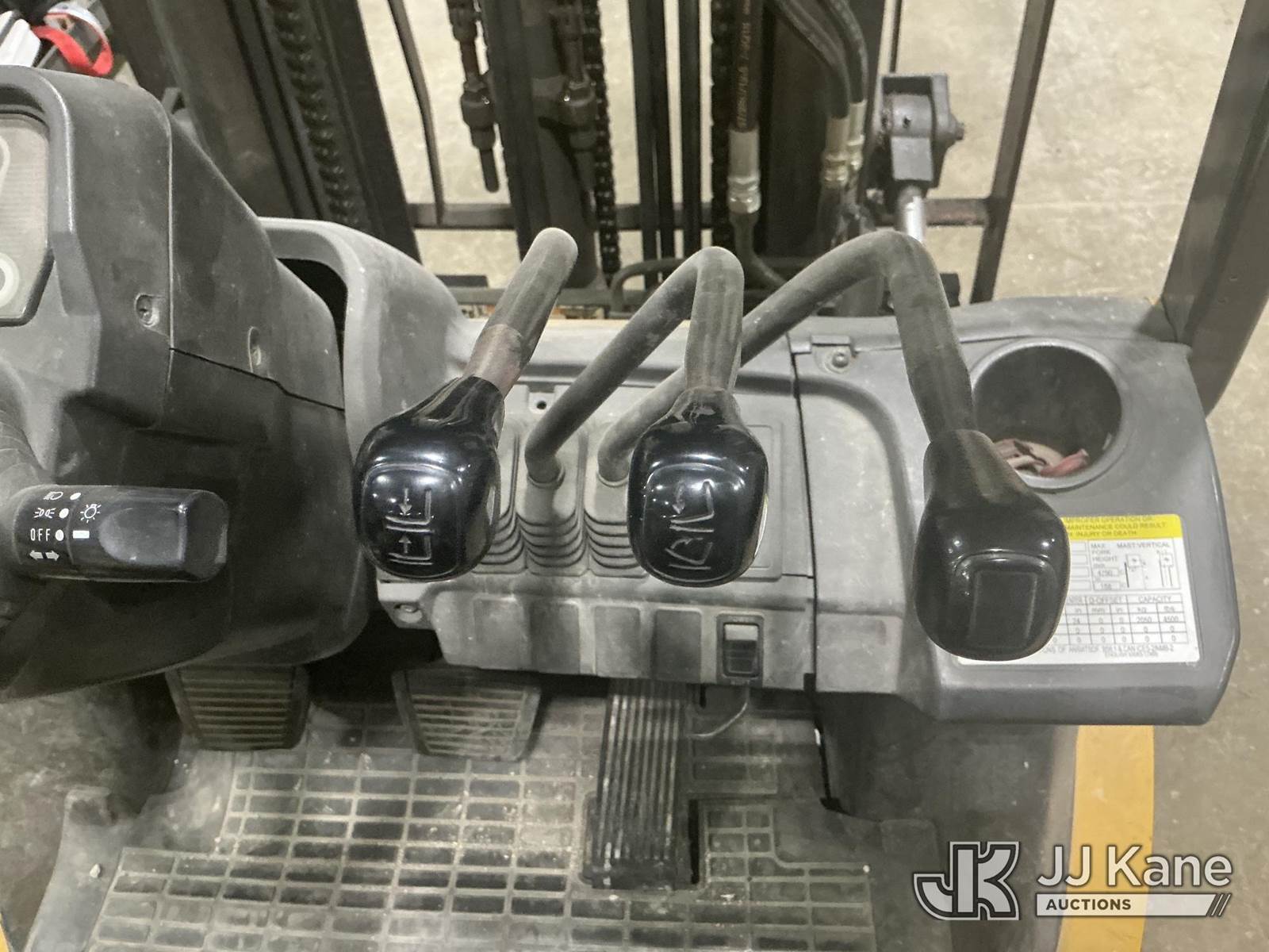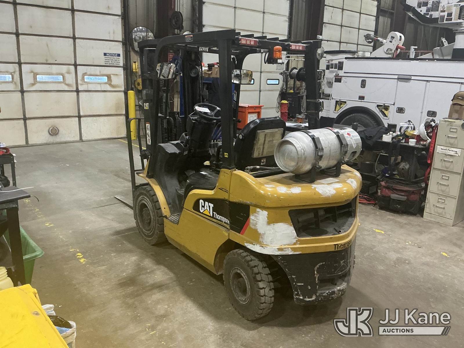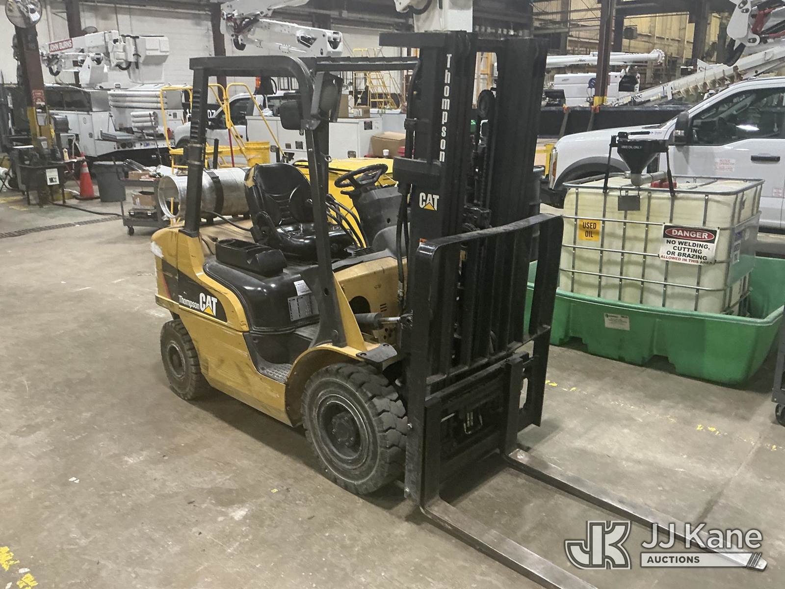 2014 Cat 2P5000 Solid Tired Forklift, s/n AT3541437, LPG, Shuttle, with 4,500 lb. lift capacity, 188 in. mast height, hyd side shift & ROPS, (Starts, Runs, Moves, Operates) (Roll Cage Is Bent And Viewable In Pictures) (LPG Not Included) (Reads 5,724 hours) NOTE: This unit is being sold AS IS/WHERE IS via Timed Auction and is located in Indianapolis, IN. For more information & removal arrangements please contact Andrew Fleck 317-491-5813 or Andrew.fleck@altec.com (Buyer is responsible for removal. Assistance by consignor or JJ Kane Auctions is not assured.)