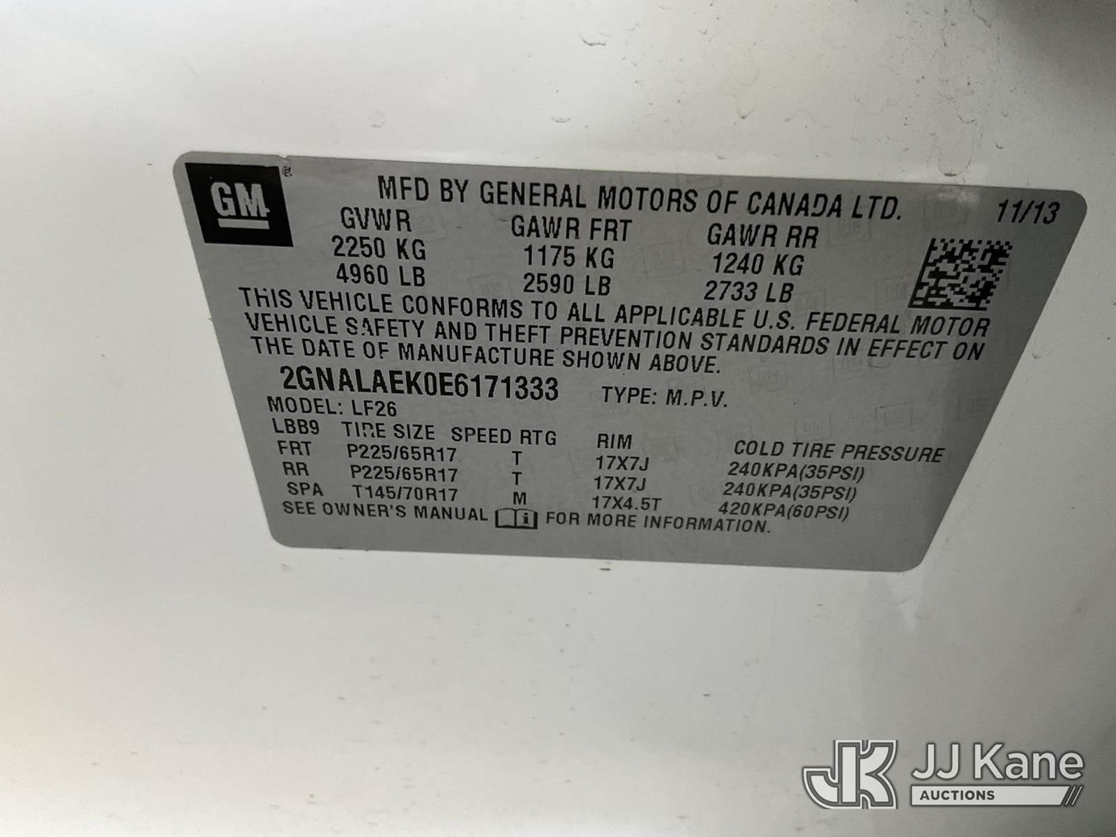 2014 Chevrolet Equinox 4-Door Sport Utility Vehicle, 4-cyl gas, 6-Speed Automatic, A/C, (153,256 miles) (Runs & Moves) This is a Titled Item NOTE: This unit is being sold AS IS/WHERE IS via Timed Auction and is located in Jurupa Valley, CA. Inspection & preview days for this unit are the 2 business days prior to the first day of items closing for this auction, item is located at 4510 Muth Way Jurupa Valley, CA 92509 and hours of operations are 8a-4p. For pre-sale questions, please contact please contact Office Staff @ (310) 353-7140. Dealer License Number 45696. (Buyer is responsible for removal. Assistance by consignor or JJ Kane Auctioneers is not assured.)