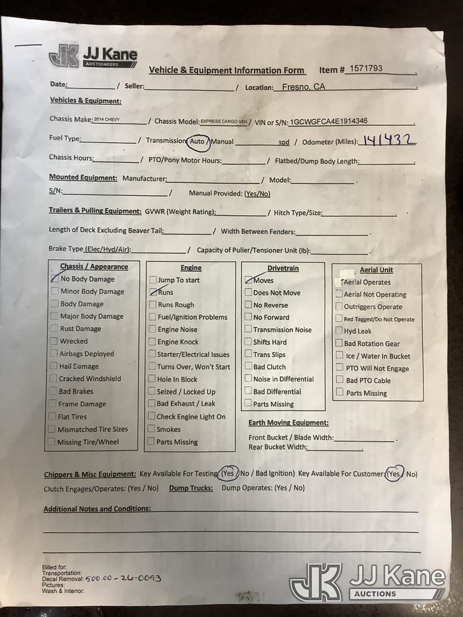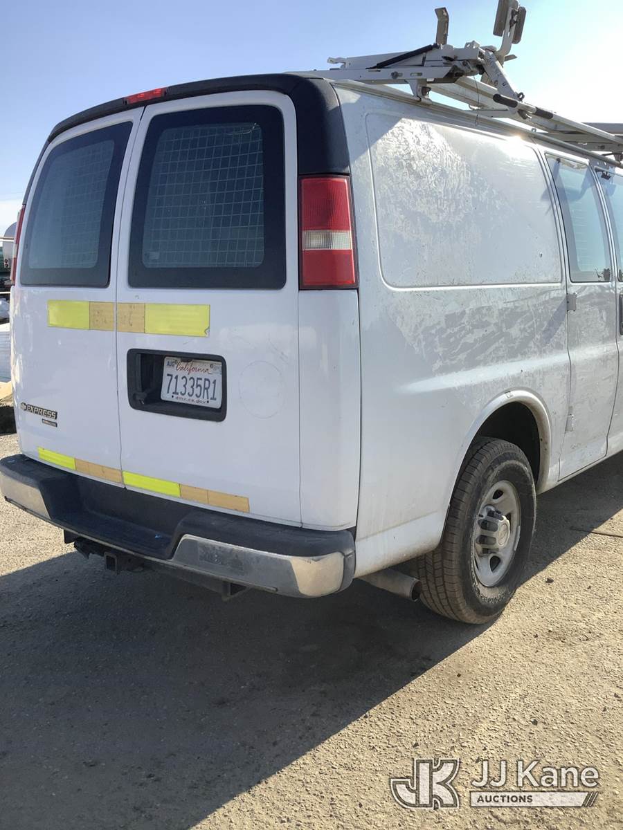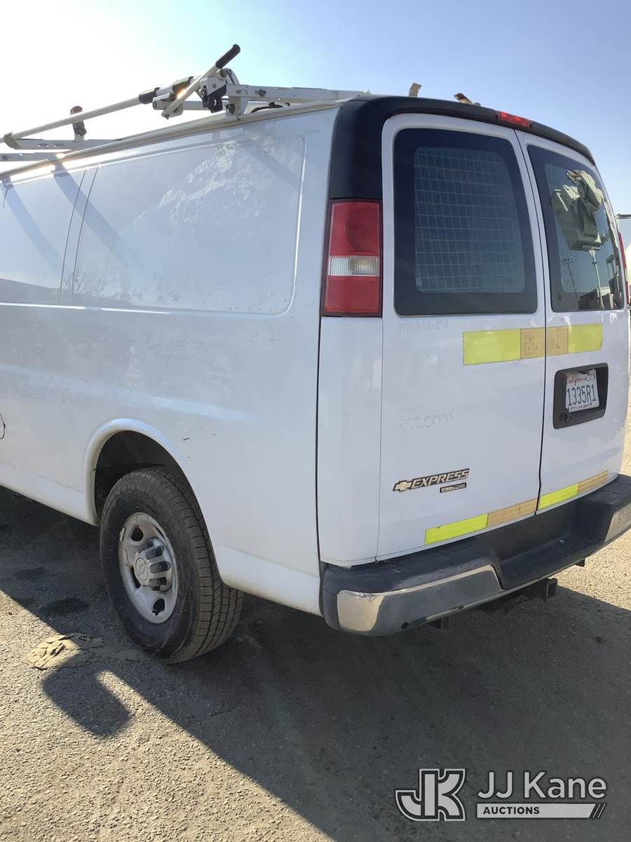 2014 Chevrolet Express 2500 Cargo Van, 8-cyl gas, 6-Speed Automatic, A/C, (141,432 miles) AT&T UNIT: LEAVE UNIT IN 99GRAVES_C-HOLDING, SALES SUPPORT WILL ASSIGN THE CORRECT SALE. ALL AT&T DECALS AND BRANDING MUST BE REMOVED FROM UNITS. THIS INCLUDES LOGS, AT&T GLOBES, WRAPS, TRADMARKED BRANDING, ETC. ALL TRASH AND LOOSE MATERIAL LEFT ON THE UNIT IS TO BE CLEANED OUT. IF EXCESSIVE TRASH AND LOOSE MATERIAL EXIST, THE CUSTOMER CAN BE CHARGED FOR CLEANING. OPEN ALL COMPARTMENTS AND CARGO AREAS FOR ADDITIONAL VALUABLE EQUIPMENT. IF ADDITIONAL EQUIPMENT EXIXTS, ADD INFORMATION AND PICTURES TO AIM. BUCKET TRUCKS, DIGGER DERRICKS, AND CABLE PLACERS REQUIRE ANSI INSPECTIONS. SALES SUPPORT ORDERS ANSI INSPECTIONS WHEN UNIT IS ON SITE. DO NOT ACTIVATE UNTIL ANSI INSPECTION IS COMPLETE AND ATTACHED TO THE LOT. CONTACT CLAY GRAVES OR ZACK CASTO WITH ALL AT&T PROCESSING QUESTIONS. (Runs & Moves) (No Body Damage) This is a Titled Item NOTE: This unit is being sold AS IS/WHERE IS via Timed Auction and is located in Fresno, CA. Inspection & preview days for this unit are by appointment only; please contact us at contact@jjkane.com or 84-Go-JJKane for more details. For pre-sale questions, please contact Cesar Lua @ (707) 914-6375. (Buyer is responsible for removal. Assistance by consignor or JJ Kane Auctions is not assured.)