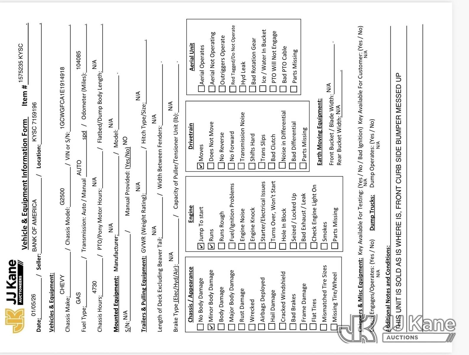 2014 Chevrolet Express G2500 Cargo Van, 8-cyl gas, Auto, A/C, with ladder rack, (104,085 miles) (Runs & Moves) (Jump to Start, Minor Body Damage) This is a Titled Item NOTE: This unit is being sold AS IS/WHERE IS via Timed Auction and is located in Elizabethtown, KY. Inspection & preview days for this unit are by appointment only; please contact us at contact@jjkane.com or 84-Go-JJKane for more details. Kentucky Auctioneer Michael Whitebread - License # 256617 (Buyer is responsible for removal. Assistance by consignor or JJ Kane Auctions is not assured.)