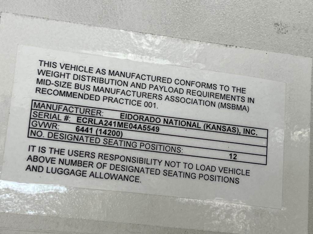 Location: Washougal WA ***Government Surplus*** VIN: 1GB6G6BL9E1163428 Engine: Duramax 6.6L 8cyl Diesel Transmission: Automatic Eldorado National bus body, wheelchair lift, power/heated mirrors, cruise control, 18,976 engine hours, ceiling mounted A/C unit, A/C, AM/FM/CD, LT225/75R16 tires. Miles: 251,787