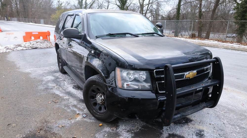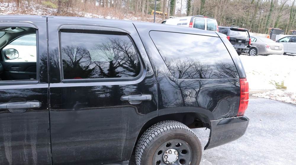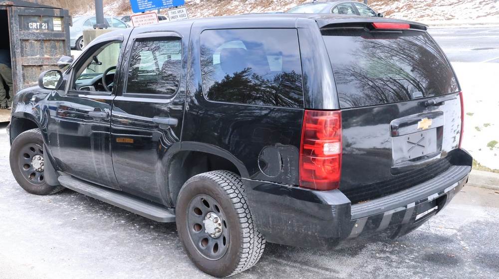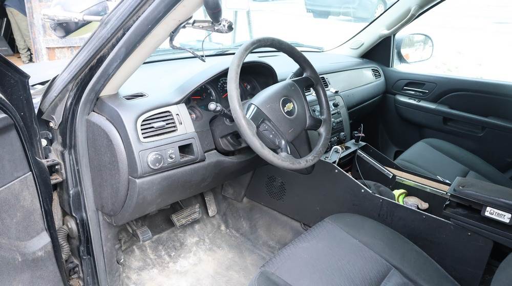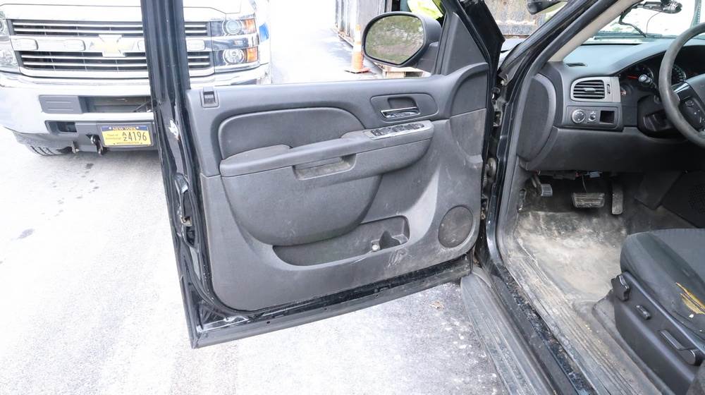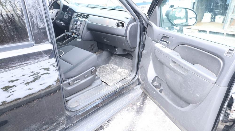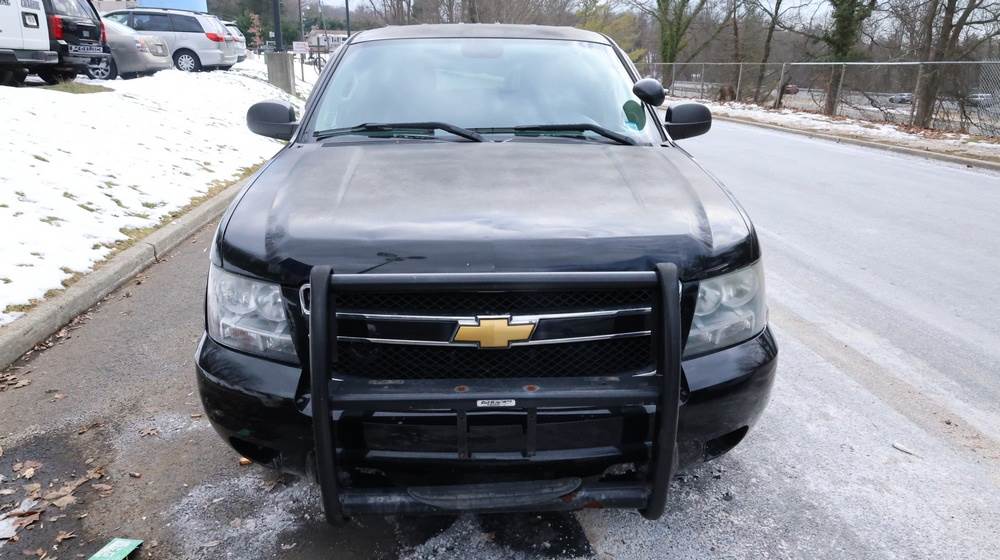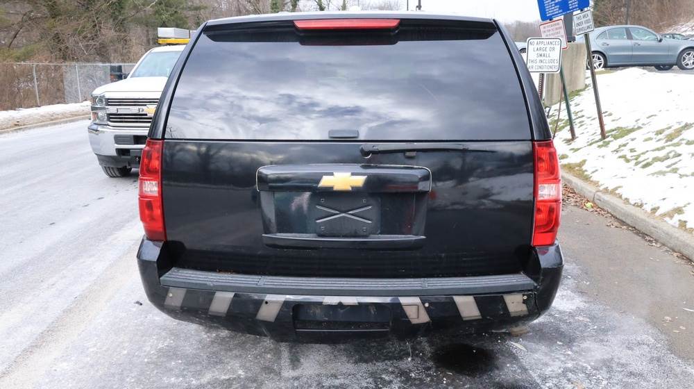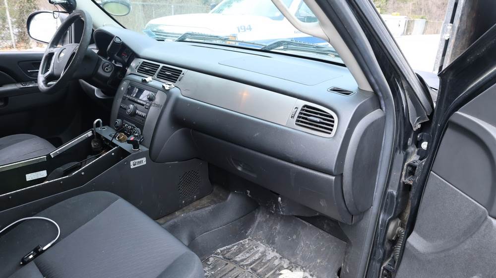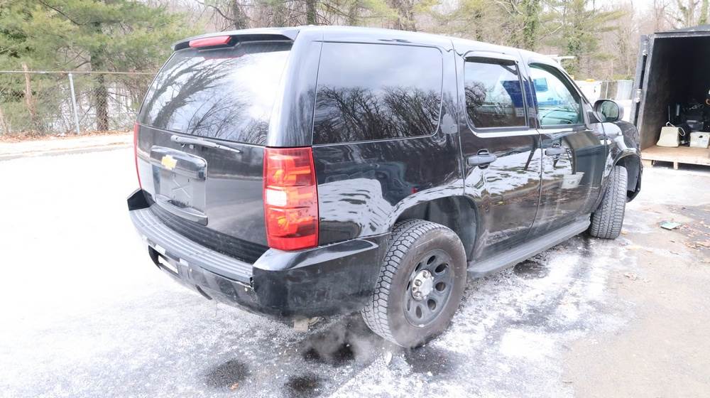 2014 Chevrolet Tahoe Police with a 5.3L V8 OHV FFV engine. VIN: 1GNLC2E01ER182407. Odometer reading: 140806. Body: Full-size four-door sport utility vehicle in police configuration. Equipped with a front push bumper, steel wheels, black exterior trim, and tinted rear windows. Interior features include cloth seating, center console equipment mount, factory Chevrolet radio, HVAC controls, floor-mounted automatic transmission selector, auxiliary wiring and mounts associated with police use, and analog gauge cluster. Seller reports: Rusty, runs and drives, title and key available. Must be towed.