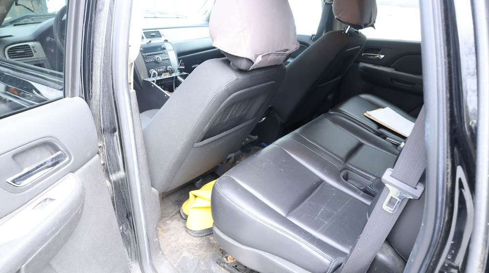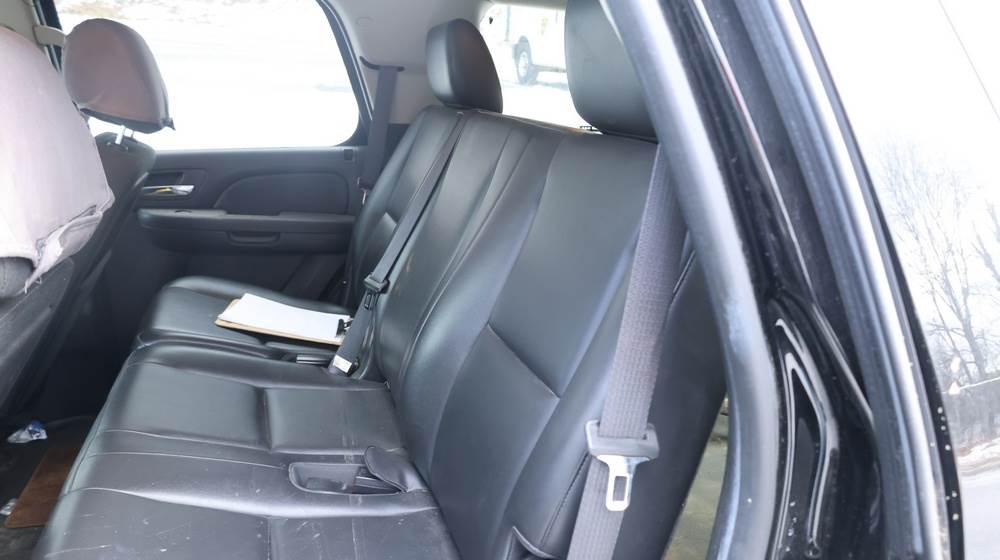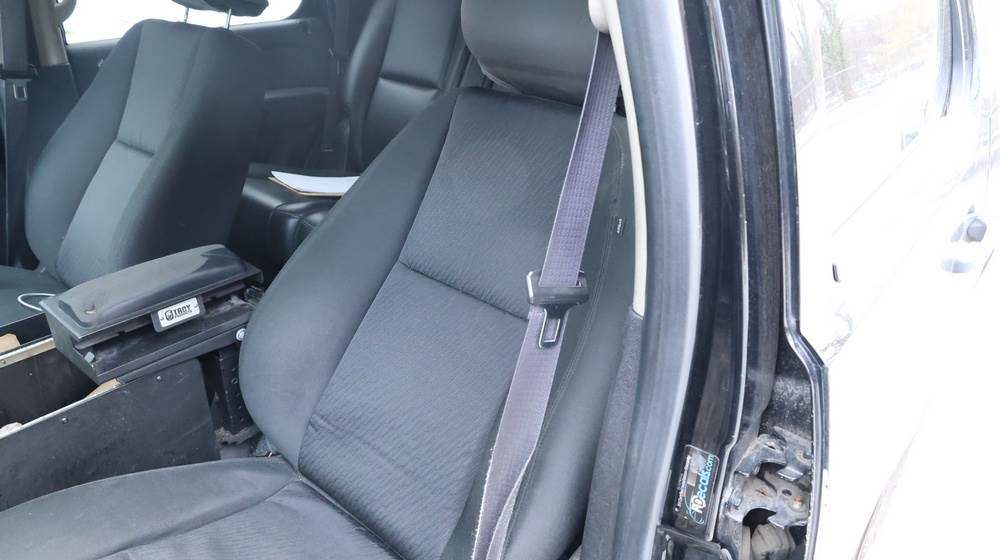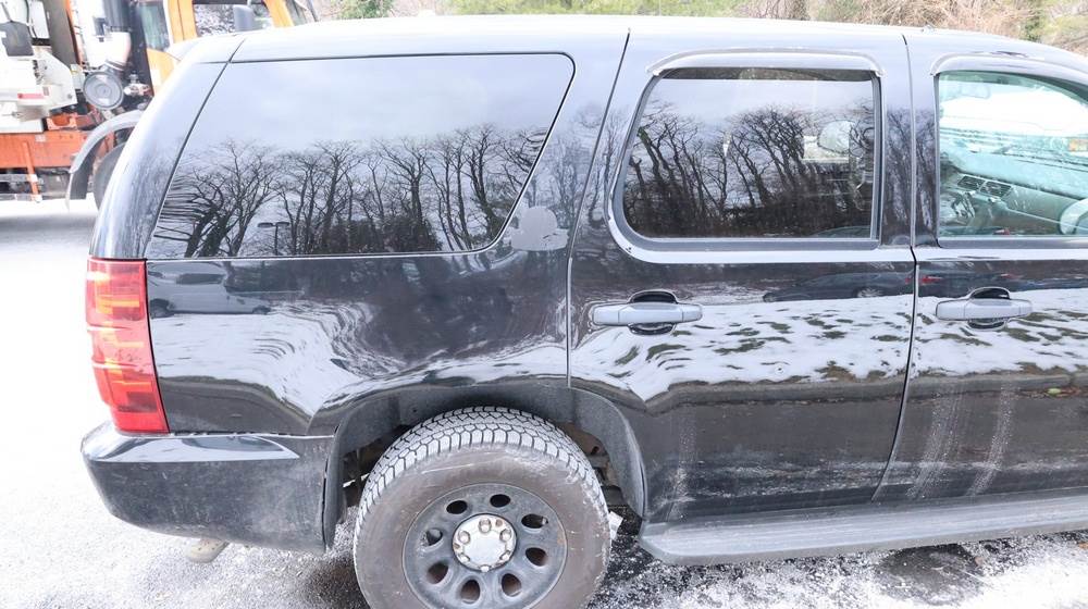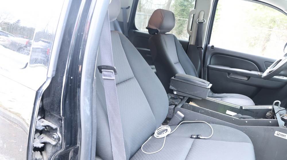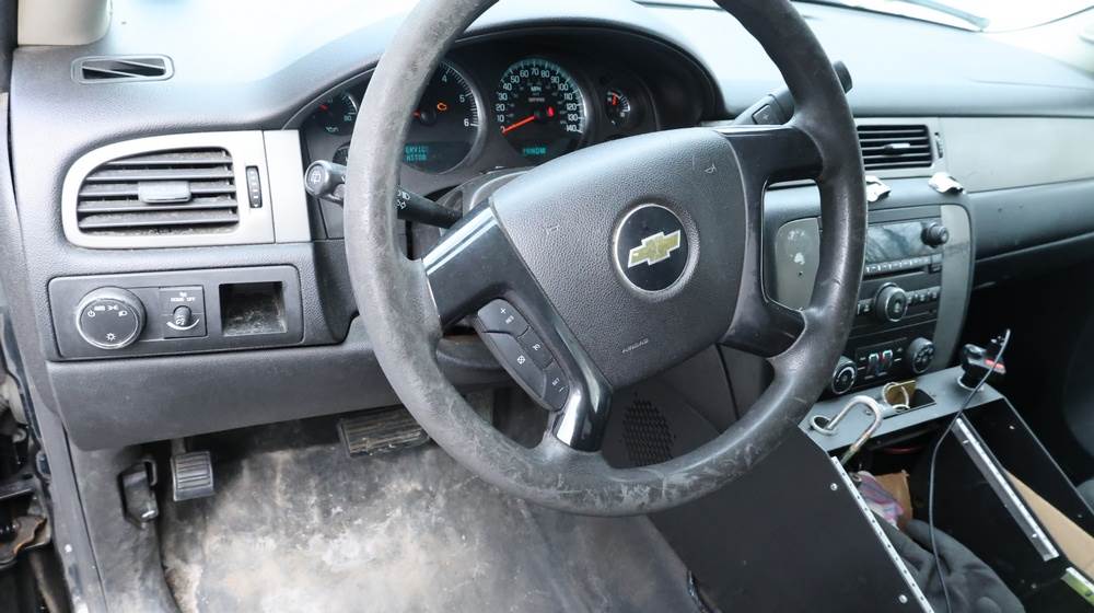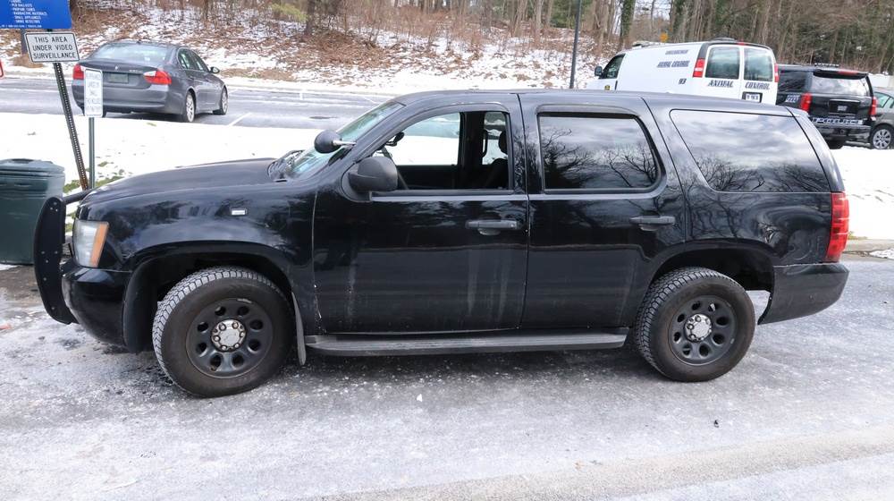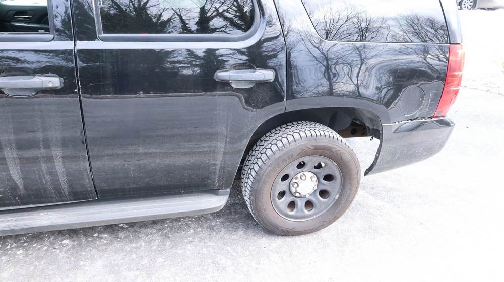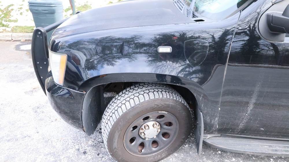 2014 Chevrolet Tahoe Police with a 5.3L V8 OHV FFV engine. VIN: 1GNLC2E01ER182407. Odometer reading: 140806. Body: Full-size four-door sport utility vehicle in police configuration. Equipped with a front push bumper, steel wheels, black exterior trim, and tinted rear windows. Interior features include cloth seating, center console equipment mount, factory Chevrolet radio, HVAC controls, floor-mounted automatic transmission selector, auxiliary wiring and mounts associated with police use, and analog gauge cluster. Seller reports: Rusty, runs and drives, title and key available. Must be towed.