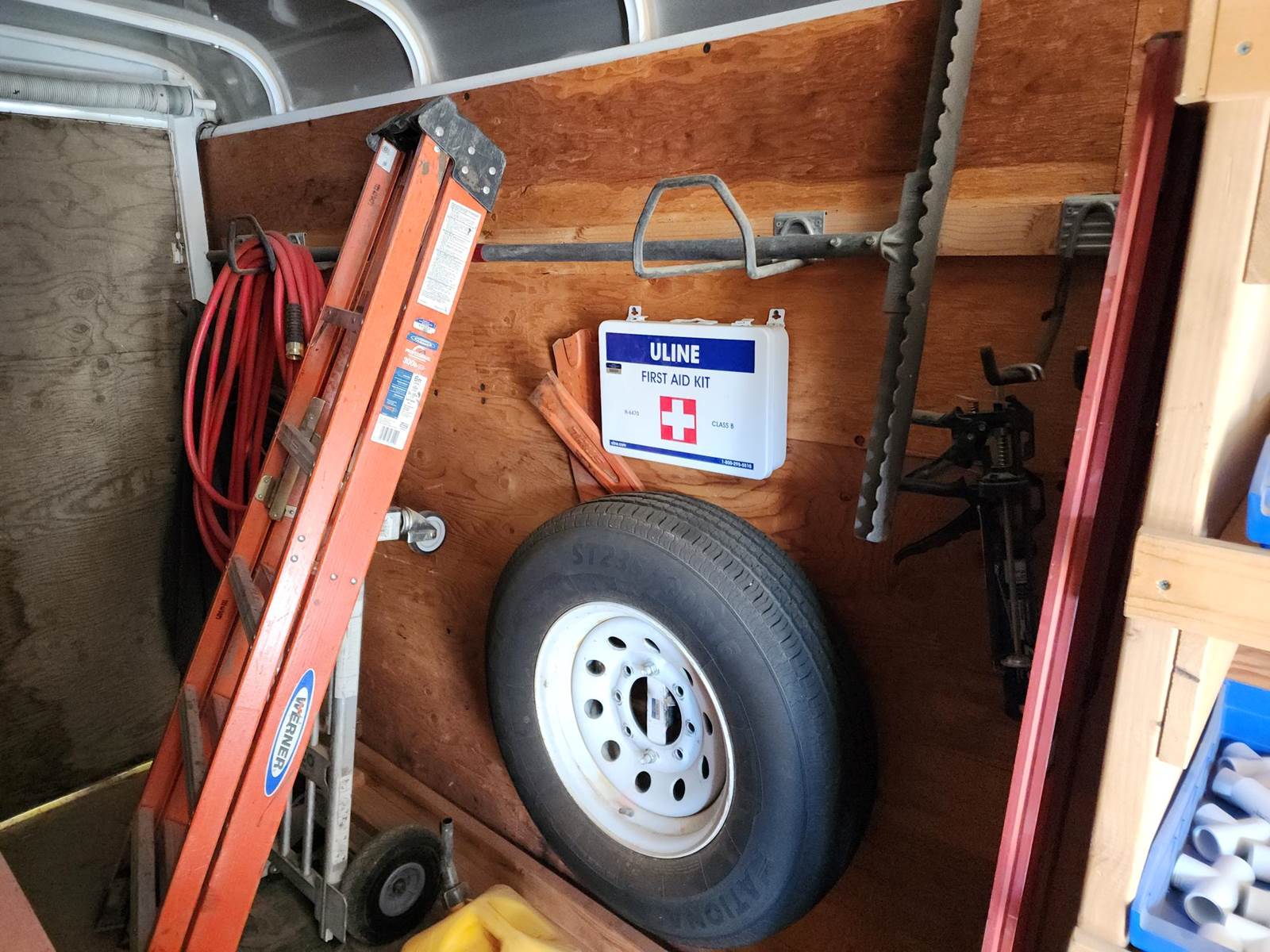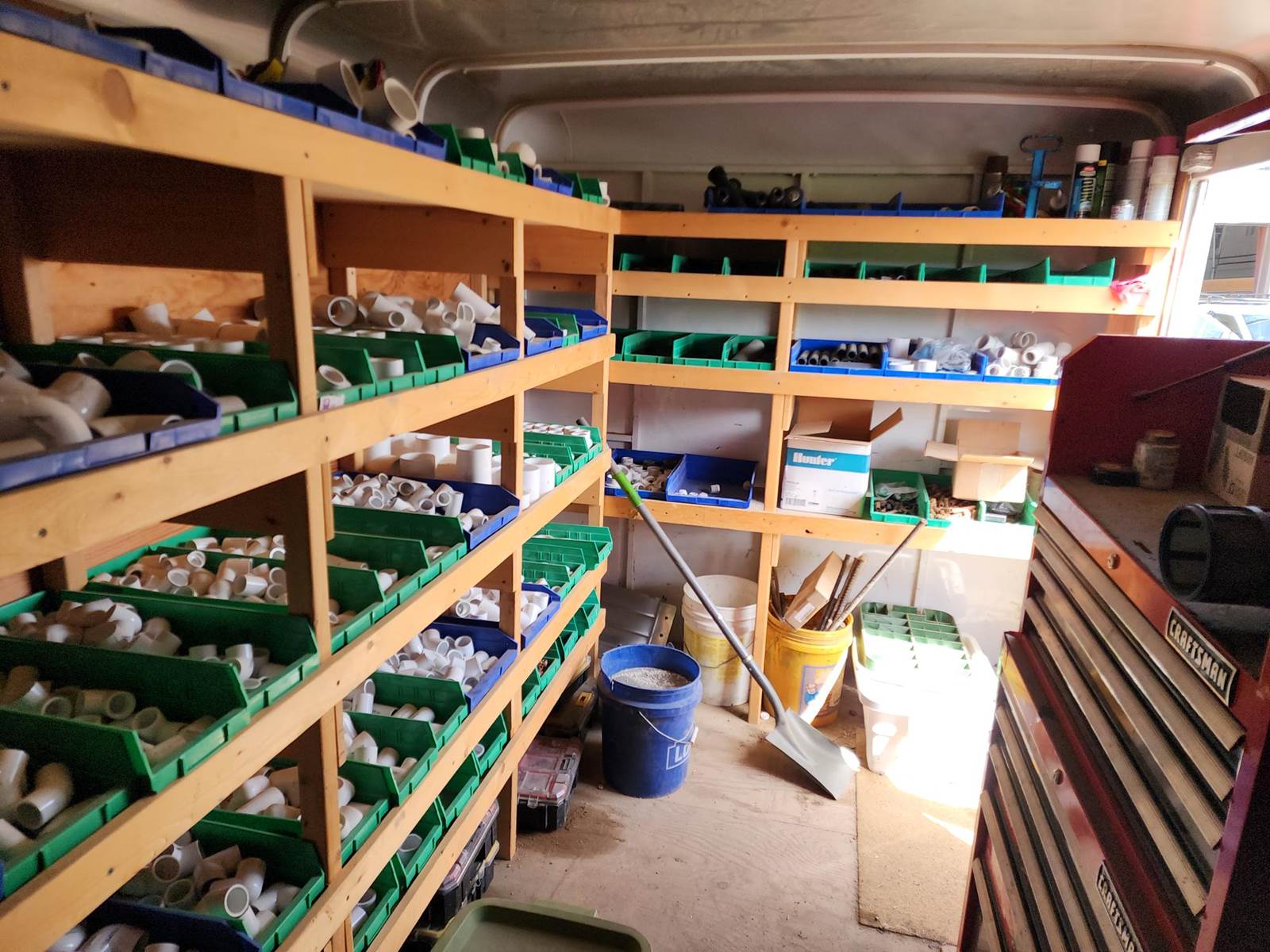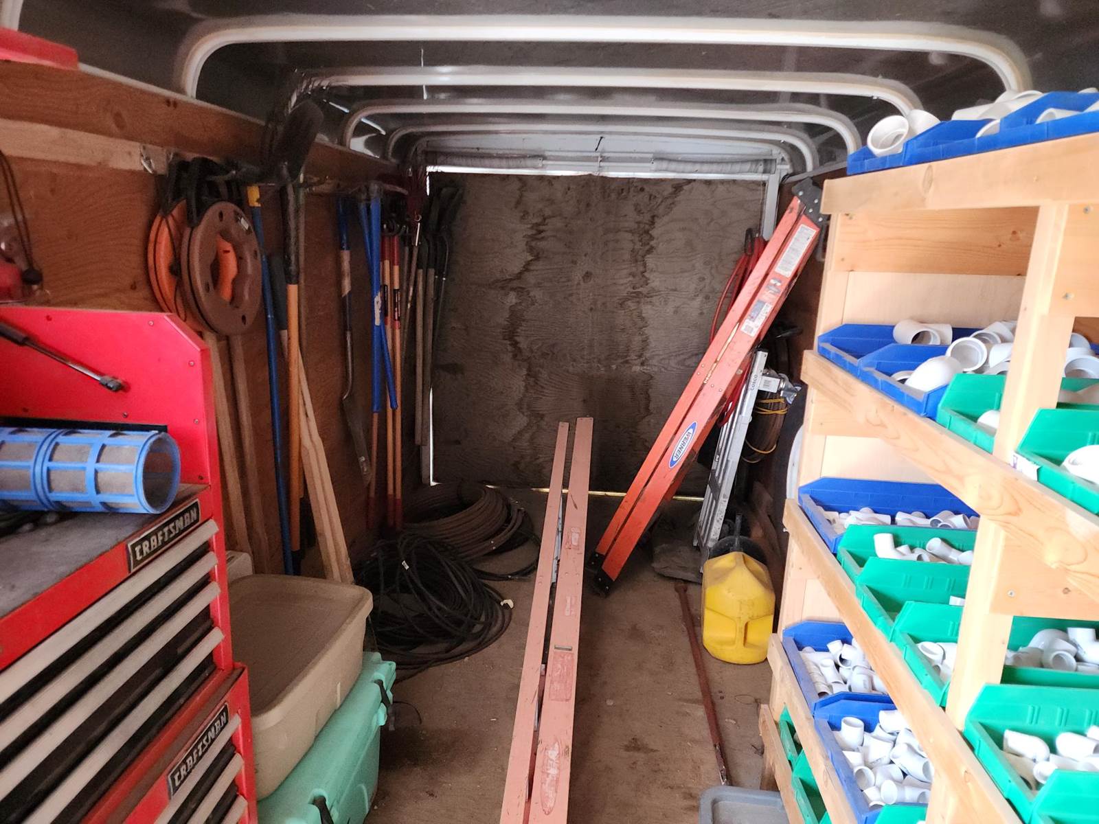 2014 C&B Quality Trailer 18-foot custom enclosed Landscaping trailer with 20’ roof top aluminum pipe rack. 4’-6” tongue with toolbox. 11’-6’ wheel base. Inside tool storage on the walls. Built in Storage racks for PVC fittings for landscaping. The fittings can be included for additional price. Craftsman toolbox, 9-drawers. Hand tools not included. 20 ft. top aluminum PVC pipe rack. Call for more information and pricing with the PVC parts.