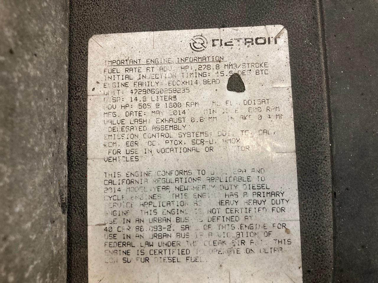 2014 DETROIT DIESEL DD15 (AT) 472906S USED DIESEL ENGINE FOR SALE at ADELMAN’S in OHIO. ALL COMPLETE and RUN TESTED, with ENGINE BRAKE, and DDI, TC, CAC, ECM, EGR, OC, PTOX, SCR-U, & AMOX EMISSIONS CONTROL SYSTEMS, EPA10 GHG14, with 60+ LBS OIL PRESSURE. STOCK #DD15-0259235