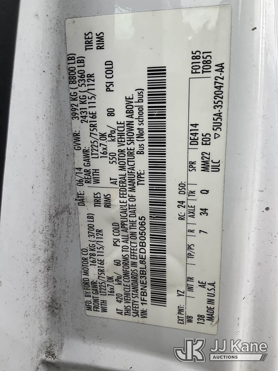 2014 Ford E350 Passenger Van, 8-cyl gas, RWD, Auto, A/C, (71,598 miles) (Runs & Moves) (Check Engine Light On, Body/Paint Damage) This is a Titled Item NOTE: This unit is being sold AS IS/WHERE IS via Timed Auction and is located in Ocala, FL. Inspection & preview days for this unit are by appointment only; please contact us at contact@jjkane.com or 84-Go-JJKane for more details. For more information & removal arrangements please contact Mike Lessard @ (352) 629-6677. (Buyer is responsible for removal. Assistance by consignor or JJ Kane Auctions is not assured.)