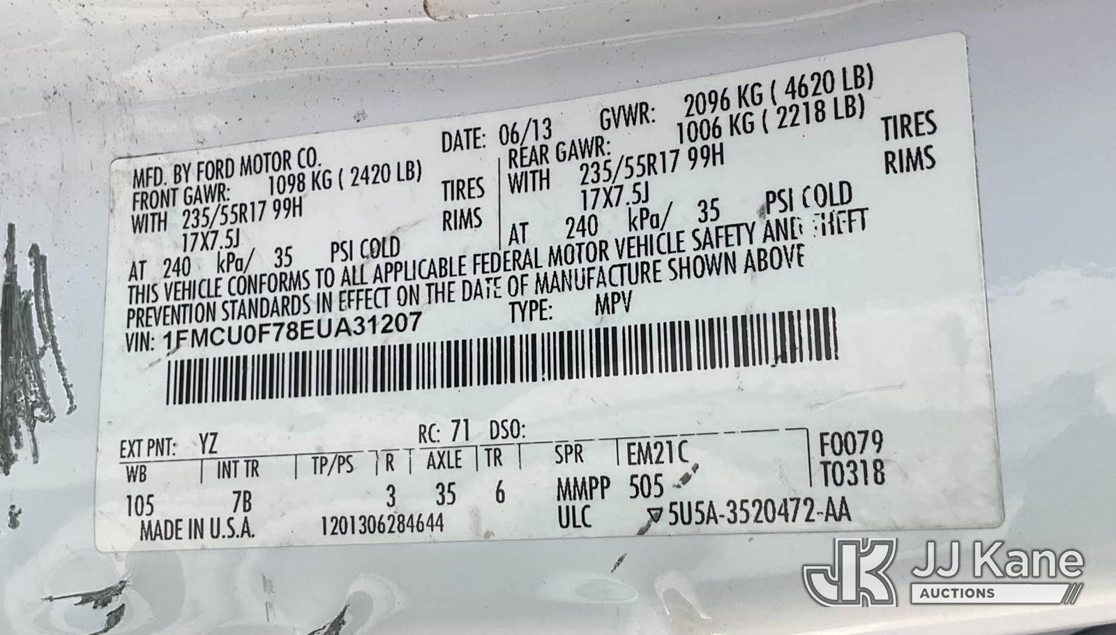 2014 Ford Escape 4-Door Sport Utility Vehicle, s/n 1FMCU0F78EUA31207, 4-cyl gas, 6-Speed Automatic, A/C, (62,405 miles) (Runs & Moves) This is a Titled Item NOTE: This unit is being sold AS IS/WHERE IS via Timed Auction and is located in Jurupa Valley, CA. Inspection & preview days for this unit are the 2 business days prior to the first day of items closing for this auction, item is located at 4510 Muth Way Jurupa Valley, CA 92509 and hours of operations are 8a-4p. For pre-sale questions, please contact please contact Office Staff @ (310) 353-7140. Dealer License Number 45696. (Buyer is responsible for removal. Assistance by consignor or JJ Kane Auctions is not assured.)
