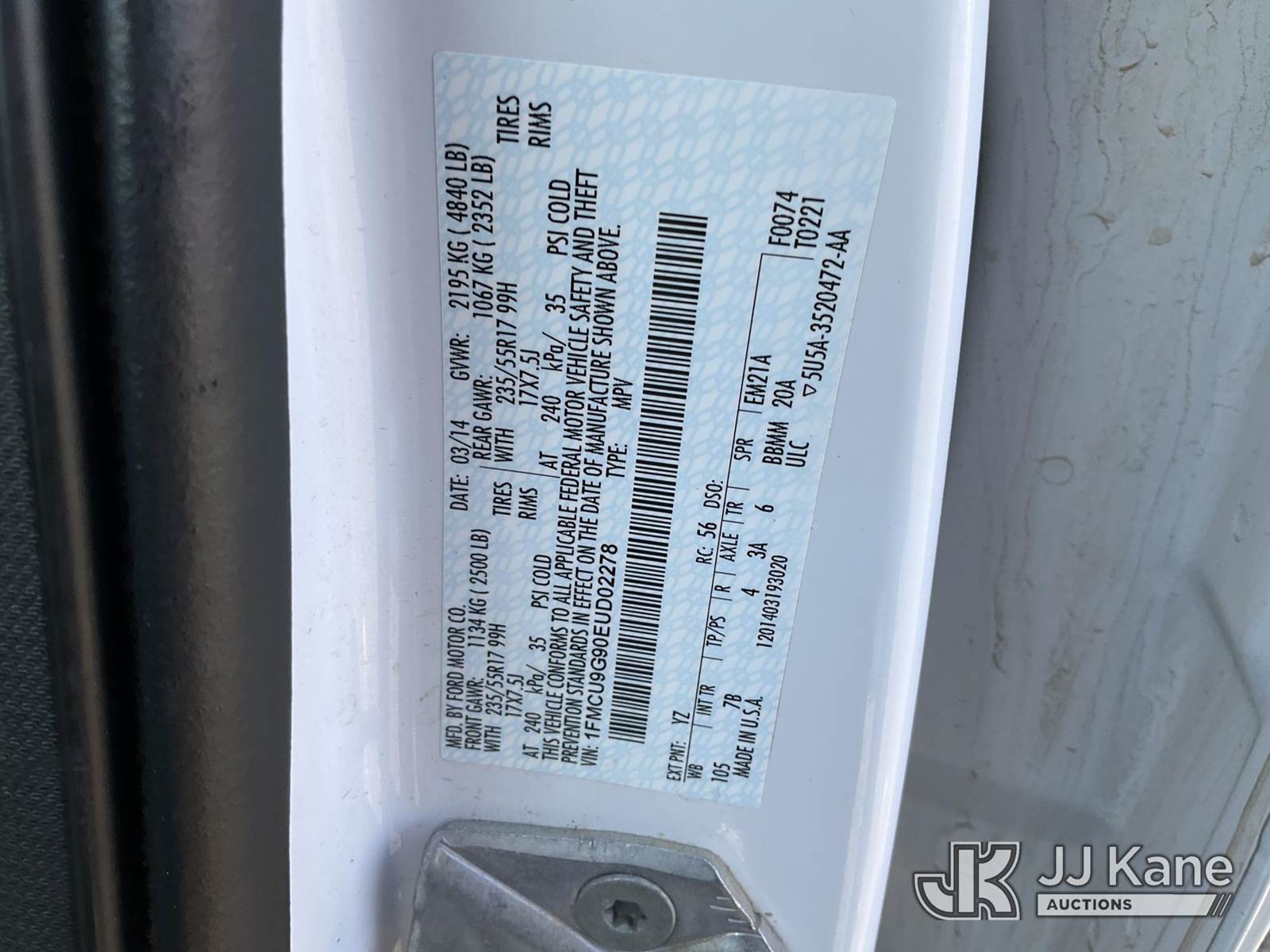 2014 Ford Escape 4x4 4-Door Sport Utility Vehicle, 4-cyl gas, Auto, A/C, (115,205 miles) (Runs & Moves) This is a Titled Item NOTE: This unit is being sold AS IS/WHERE IS via Timed Auction and is located in Salt Lake City, UT. Inspection & preview days for this unit are the 2 business days prior to the first day of items closing for this auction, item is located at 2353 N Redwood Rd Salt Lake City, UT 84116 and hours of operations are 8a-4p. Titles executed exactly as bidder registered. Ensure your name and/or business name and address in JJ Kane and/or ProxiBid is correct before bidding. For pre-sale questions, please contact Office Staff @ (801) 519-0123. (Buyer is responsible for removal. Assistance by consignor or JJ Kane Auctions is not assured.)