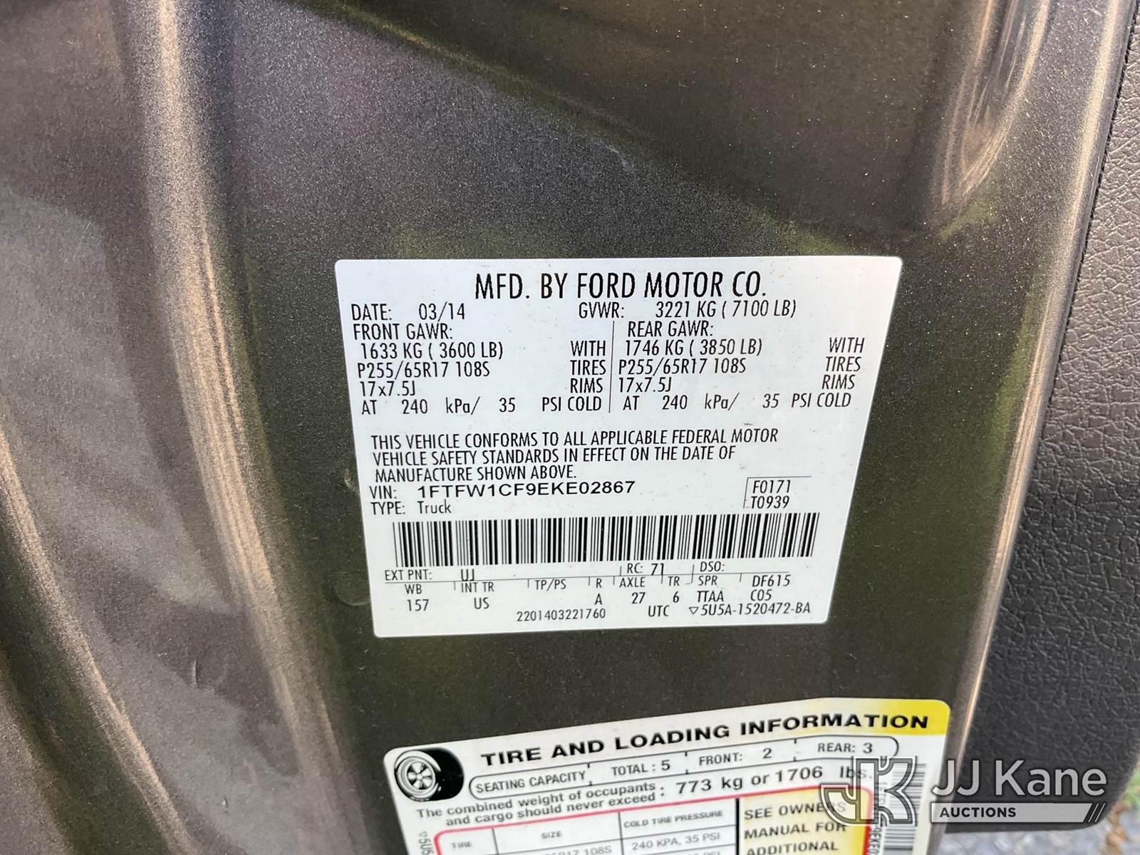 2014 Ford F-150 Crew-Cab Pickup Truck, s/n 1FTFW1CF9EKE02867, 5.0L V8 RWD, GAS, 6-Speed Automatic, A/C, with Tool box, (131,959 miles) (Runs & Moves) This is a Titled Item NOTE: This unit is being sold AS IS/WHERE IS via Timed Auction and is located in Dixon, CA. Inspection & preview days for this unit are the 2 business days prior to the first day of items closing for this auction, item is located at 8668 Sparling Ln Dixon, CA 95620 and hours of operations are 8a-4p. For pre-sale questions, please contact JJ Kane Staff at (707) 678-8060 (dixon@jjkane.com). Dealer License Number 45696. (Buyer is responsible for removal. Assistance by consignor or JJ Kane Auctions is not assured.)