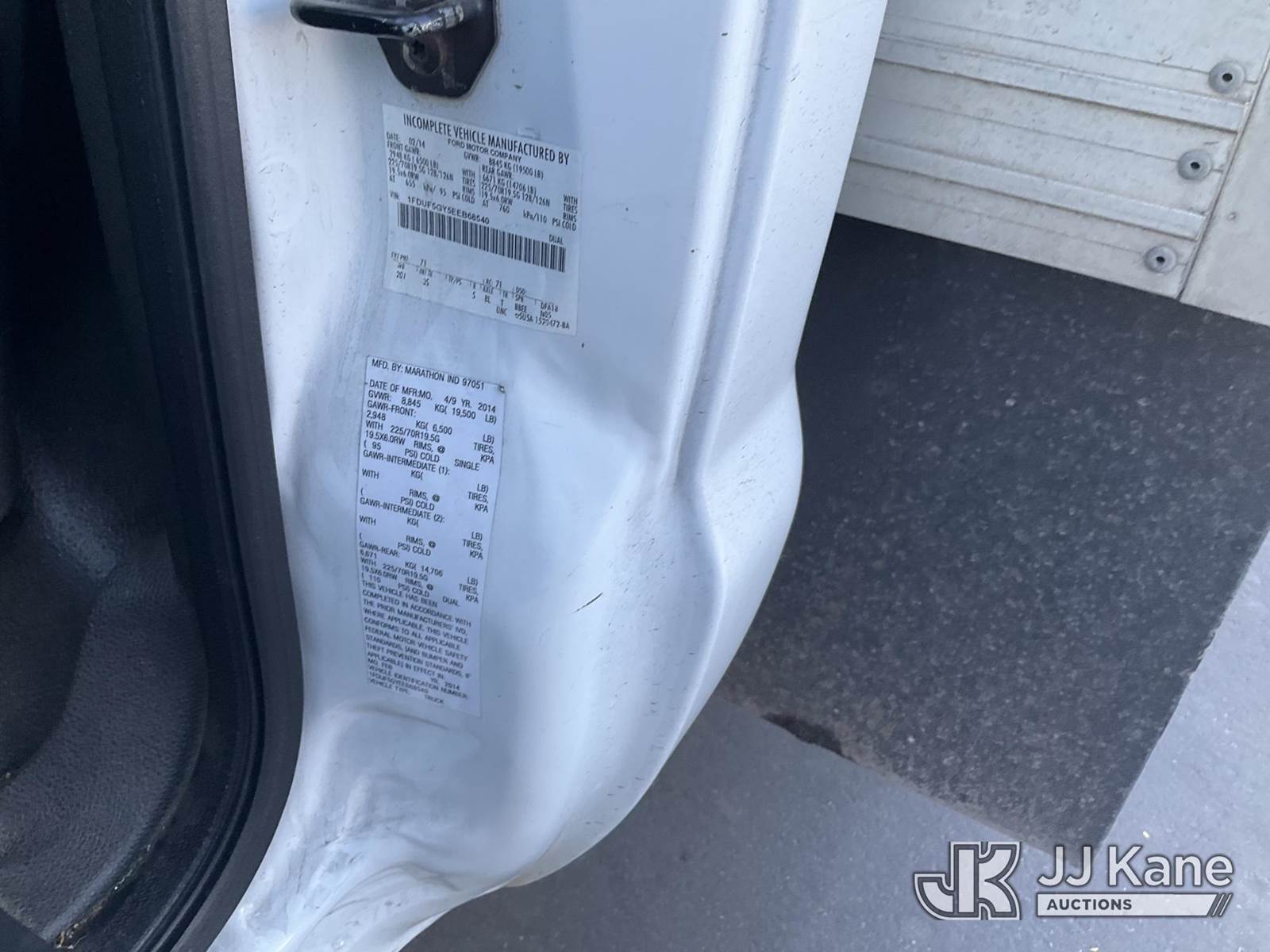 2014 Ford F-550 Van Body Truck, s/n 1FDUF5GY5EEB68540, 10-cyl gas, Auto, (126,622 miles) (Runs Rough, Moves & Lift Gate Operates) (Check Engine Light On) (Bidding Restricted to Licensed Vehicle Dealers Only), This is a Titled Item NOTE: This unit is being sold AS IS/WHERE IS via Timed Auction and is located in Jurupa Valley, CA. Inspection & preview days for this unit are the 2 business days prior to the first day of items closing for this auction, item is located at 4510 Muth Way Jurupa Valley, CA 92509 and hours of operations are 8a-4p. For pre-sale questions, please contact please contact Office Staff @ (310) 353-7140. Dealer License Number 45696. (Buyer is responsible for removal. Assistance by consignor or JJ Kane Auctioneers is not assured.)