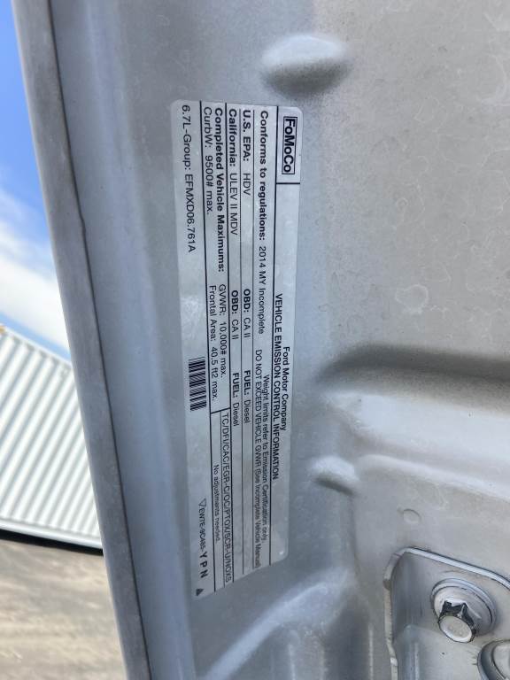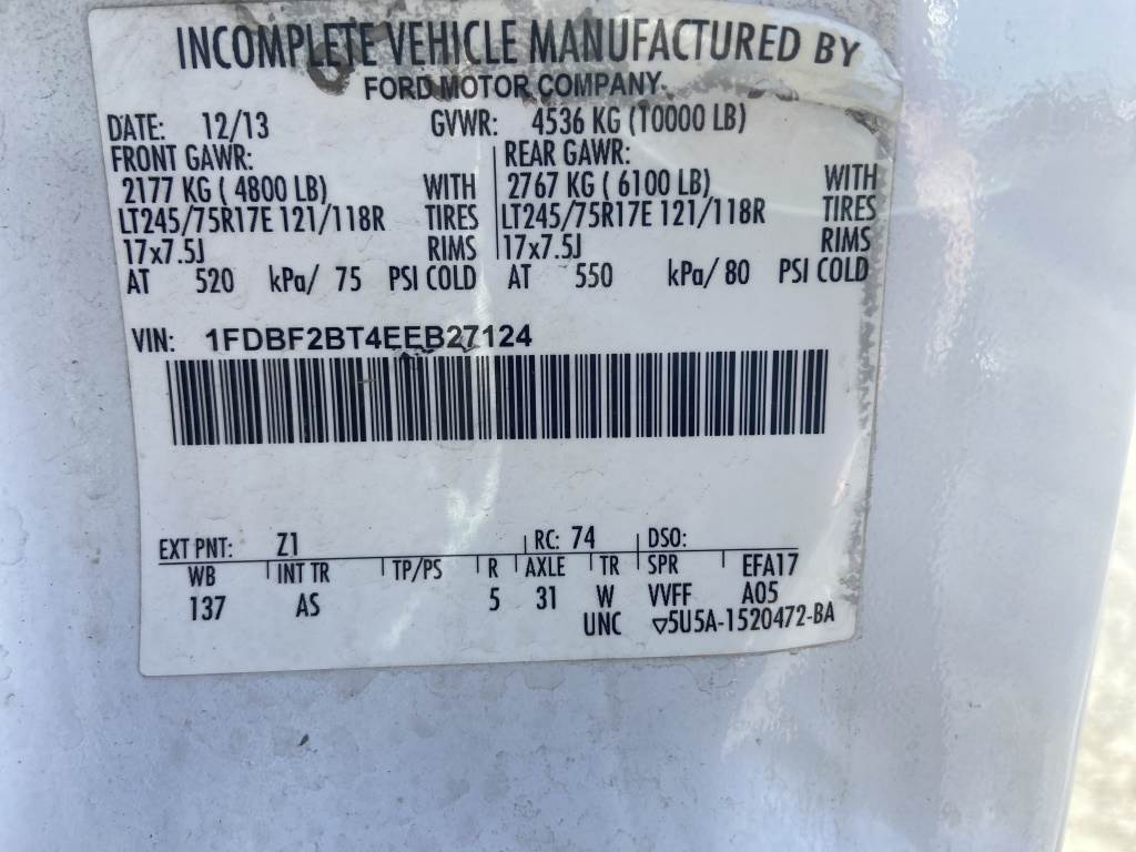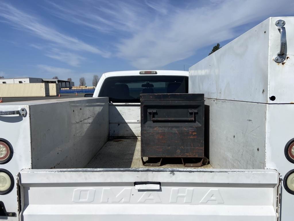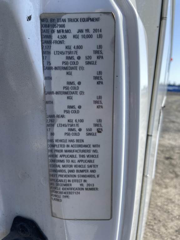 Location: Spokane WA ***Rental Industry Consignment*** VIN: 1FDBF2BT4EEB27124 Engine: Power Stroke 6.7L 8cyl Diesel Transmission: Automatic 8' Omaha Utility body w/11 storage compartments, job box, tow package, rearview camera, A/C, AM/FM/CD, manually locking hubs, spring suspension, LT 245/75R17 tires. Miles: 124,404