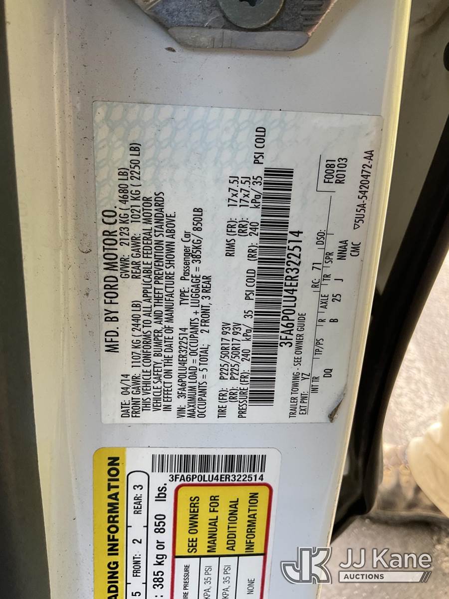 2014 Ford Fusion Hybrid 4-Door Sedan, s/n 3FA6P0LU4ER322514, 4-cyl Hybrid CVT, A/C, (153,459 miles) (Runs & Moves) (Engine Light On, Metal Scrapping Undercarriage code P0456 & P0457) (Bidding Restricted to Licensed Vehicle Dealers Only), This is a Titled Item NOTE: This unit is being sold AS IS/WHERE IS via Timed Auction and is located in Jurupa Valley, CA. Inspection & preview days for this unit are the 2 business days prior to the first day of items closing for this auction, item is located at 4510 Muth Way Jurupa Valley, CA 92509 and hours of operations are 8a-4p. For pre-sale questions, please contact please contact Office Staff @ (310) 353-7140. Dealer License Number 45696. (Buyer is responsible for removal. Assistance by consignor or JJ Kane Auctions is not assured.)