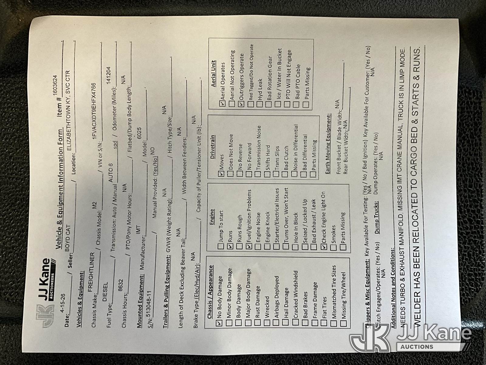 2014 Freightliner M2 106 Mechanics Service Truck, 6.7L L6 Diesel, 4X2, Auto, A/C, with IMT 6025 Material Crane, 10500 lbs., Miller Big Blue 500P Welder Generator & 2 Hyd. Outriggers (1 out & down) & Crane Remote, (141,204 miles) (Runs, Moves & Crane Operates, Check Engine & ABS Light On, Seller Note: Needs Turbo & Exhaust Manifold) This is a Titled Item NOTE: This unit is being sold AS IS/WHERE IS via Timed Auction and is located in Elizabethtown, KY. Inspection & preview days for this unit are by appointment only; please contact us at contact@jjkane.com or 84-Go-JJKane for more details. Kentucky Auctioneer Michael Whitebread - License # 256617 (Buyer is responsible for removal. Assistance by consignor or JJ Kane Auctions is not assured.)