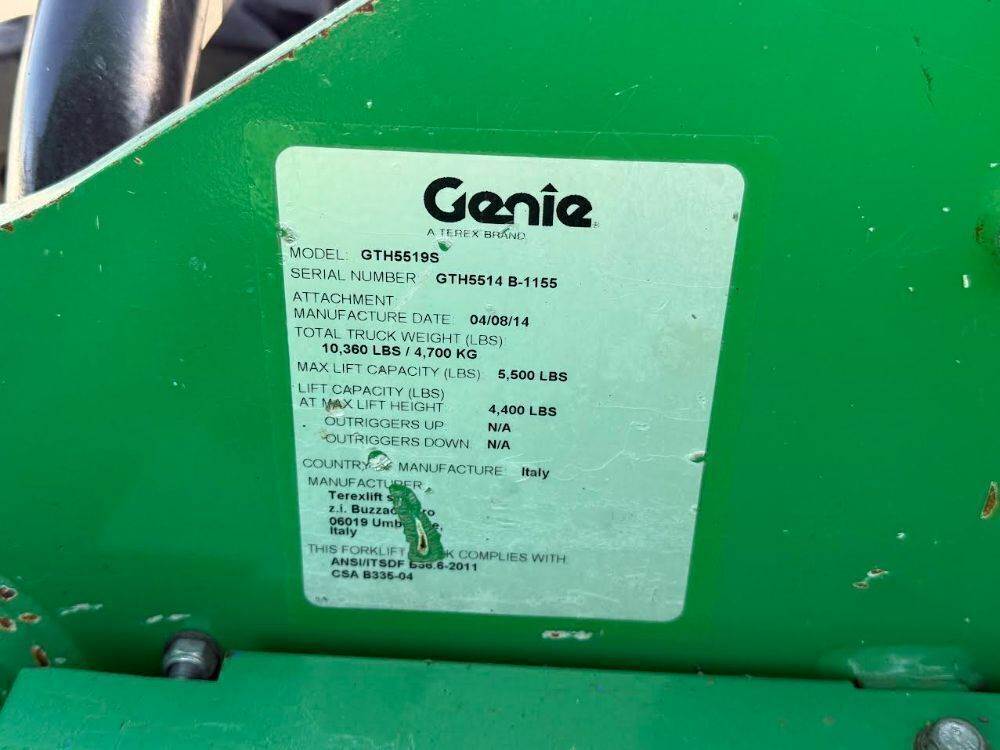 2014 GENIE GTH5519 ROUGH TERRAIN REACH FORKLIFT, 5,500#, 19' reach, 2-stage, 4x4x4, diesel, canopy, solid tires. s/n:GTH5514B-1155 --(LOCATED IN MADERA, CA)--
