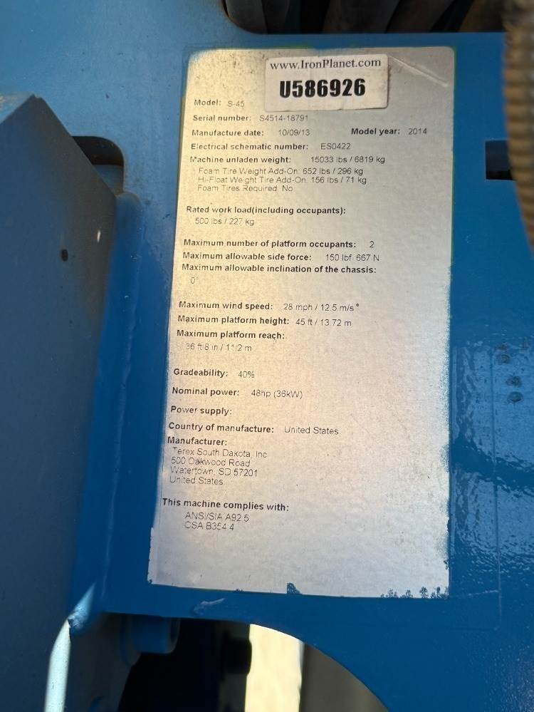 2014 GENIE S45 BOOMLIFT, Duetz diesel, 2-stage, 45' telescopic boom, 5' jib, 4x4, foam filled tires. s/n:S4514-18791