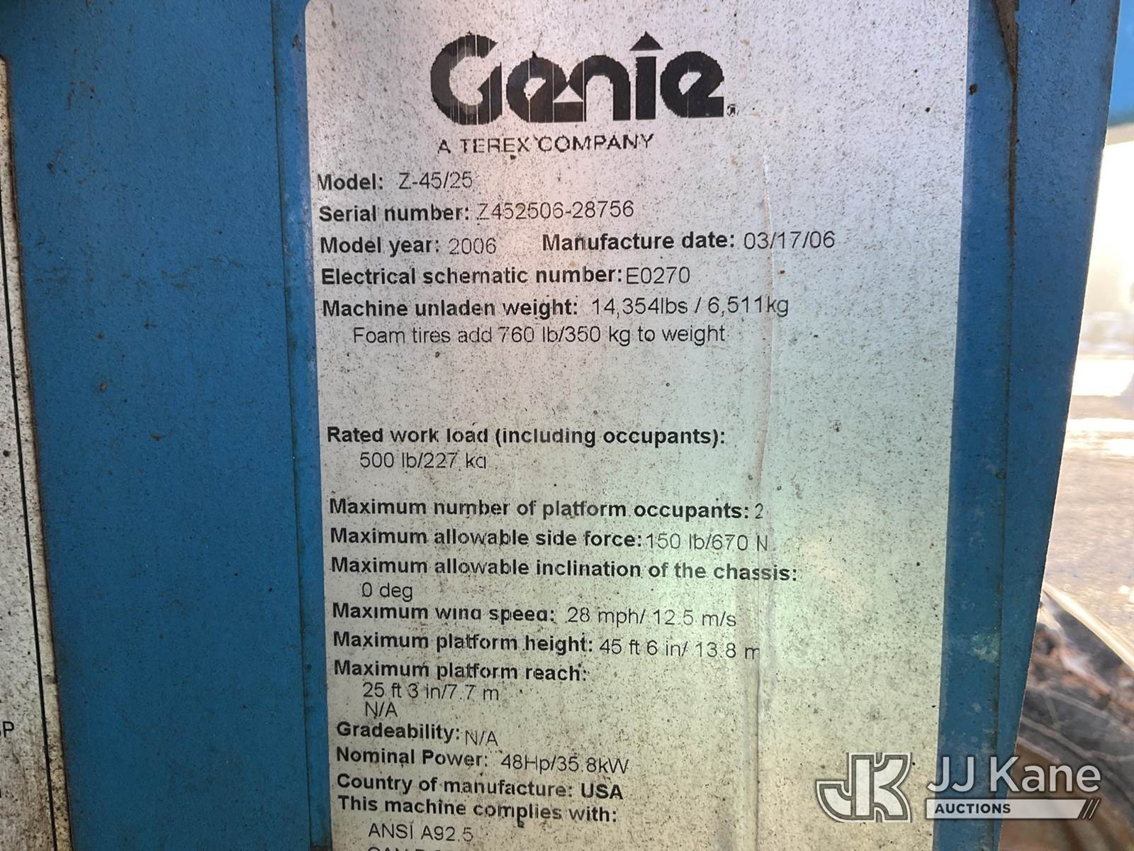2014 Genie Z45/25 4x4 45 ft. Articulating & Telescopic Manlift, s/n 628756, Deutz diesel, Hydrostatic, with aux power, two-man basket, (Run, Moves & Operates) NOTE: This unit is being sold AS IS/WHERE IS via Timed Auction and is located in China Grove, NC. Inspection & preview days for this unit are the 2 business days prior to the first day of items closing for this auction, item is located at 820 E NC Hwy 152 China Grove, NC 28023 and hours of operations are 8a-4p. For pre-sale questions, please contact Office Staff @ (704) 674-1113. (Buyer is responsible for removal. Assistance by consignor or JJ Kane Auctions is not assured.)