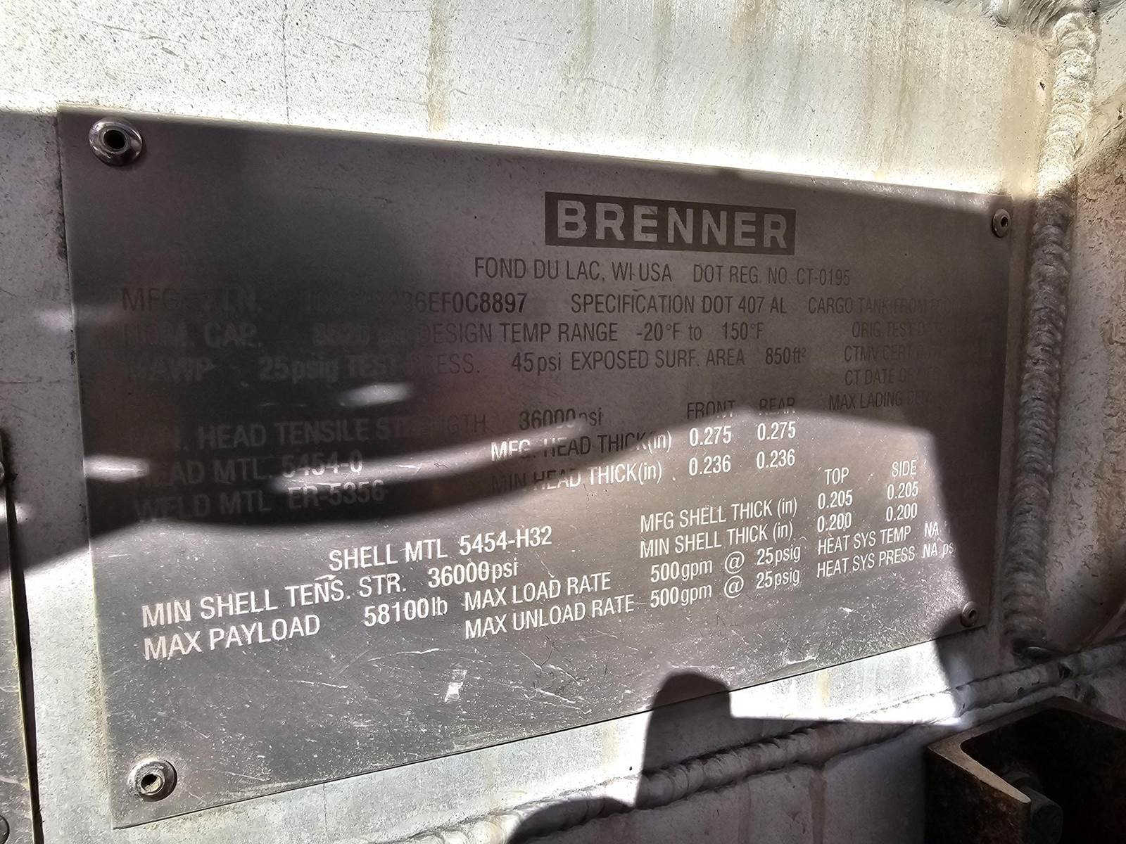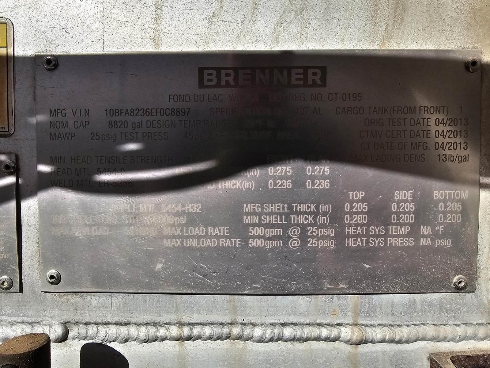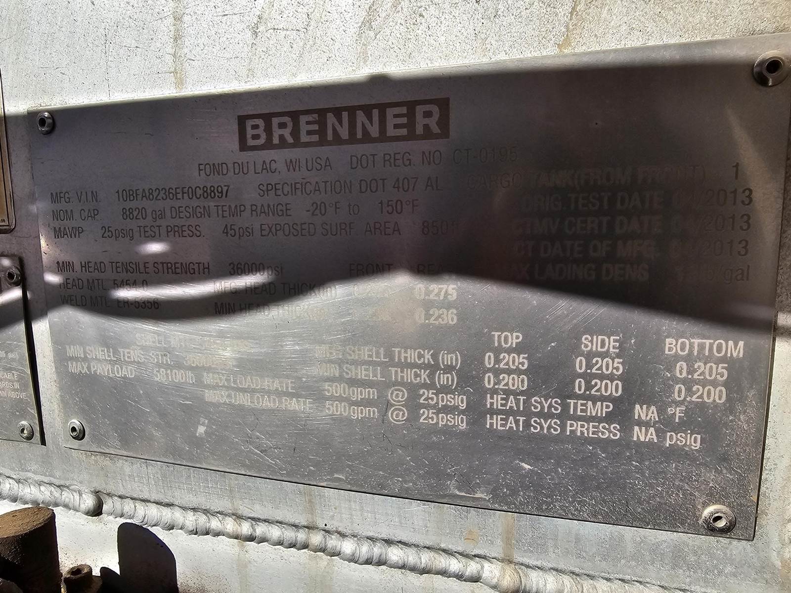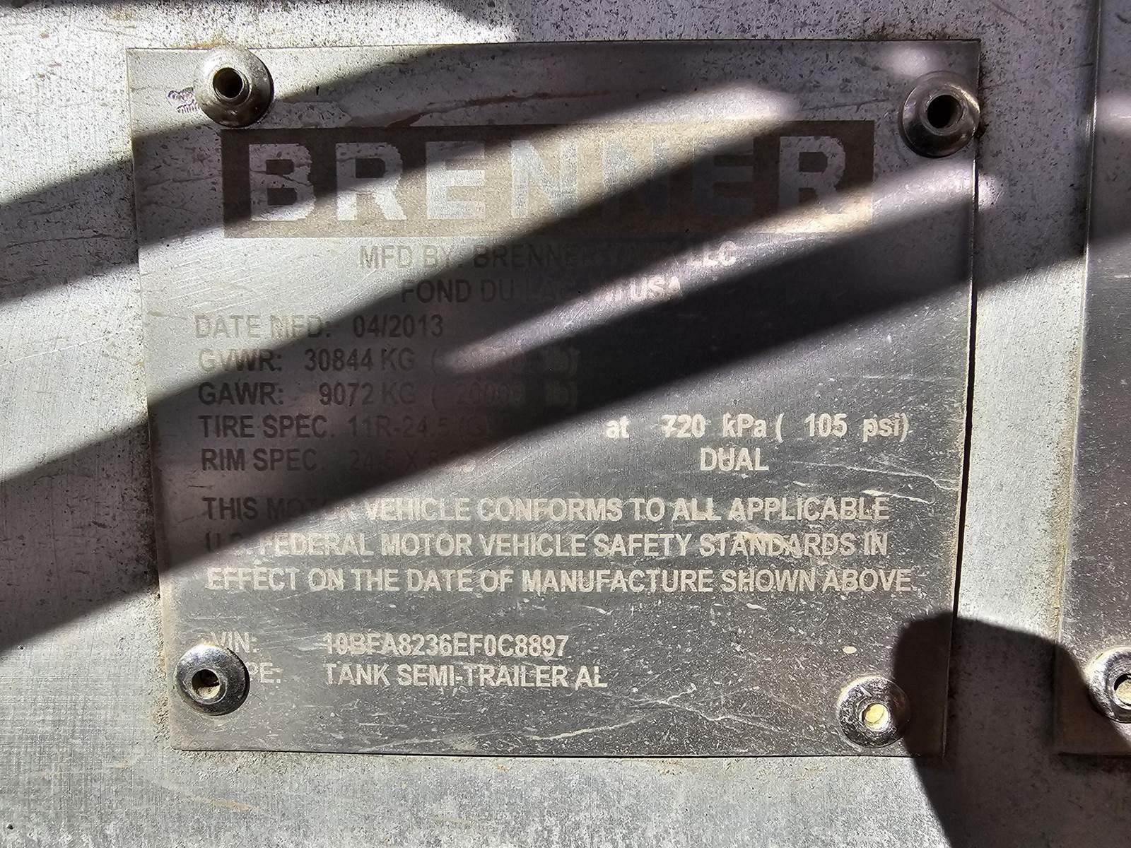 2013 Brenner, -8820 gallon, -Air ride suspension, -Aluminum wheels, -Roper pumps, -Centrifuge, -Garnet gauges,